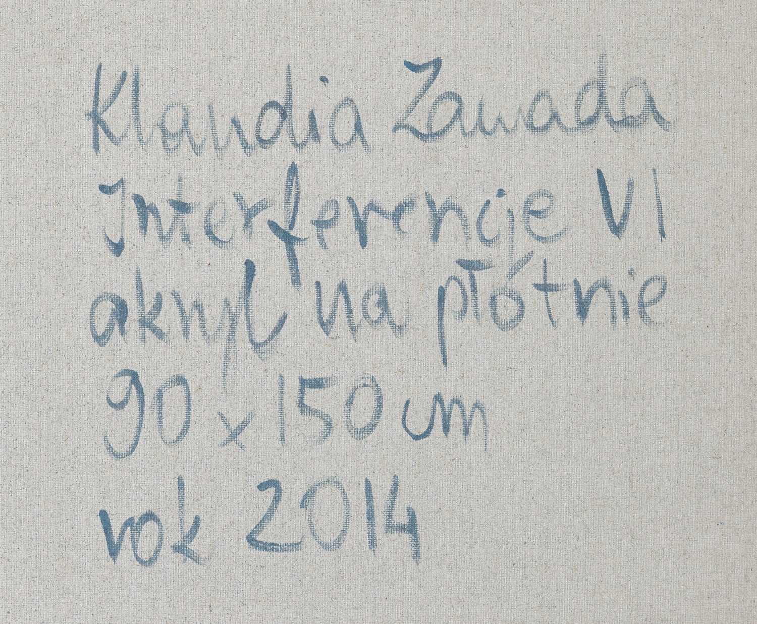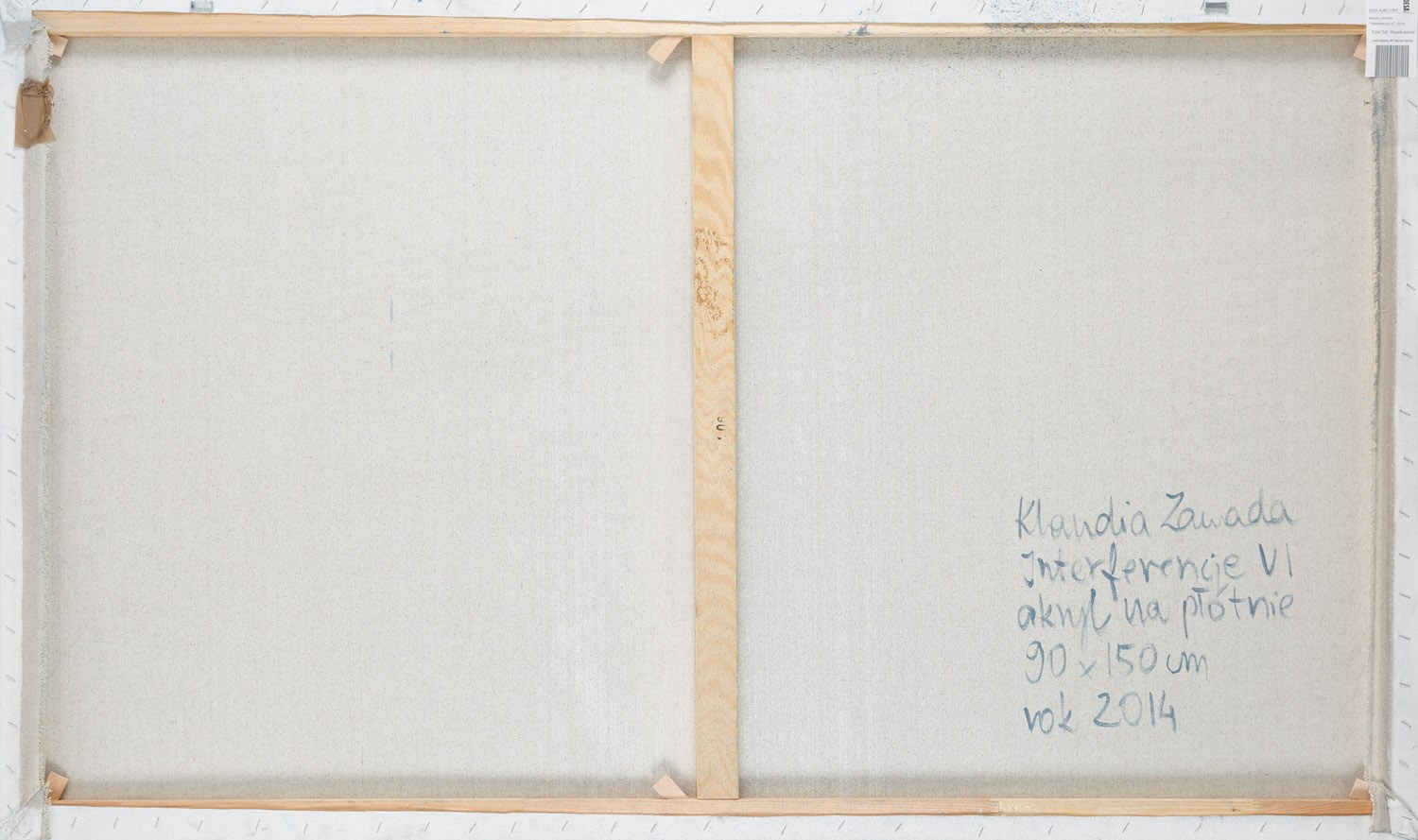 sygnowany, datowany i opisany na odwrociu: 'Klaudia Zawada | Interferencje VI | akryl na płótnie | 90x150 cm | rok 2014'