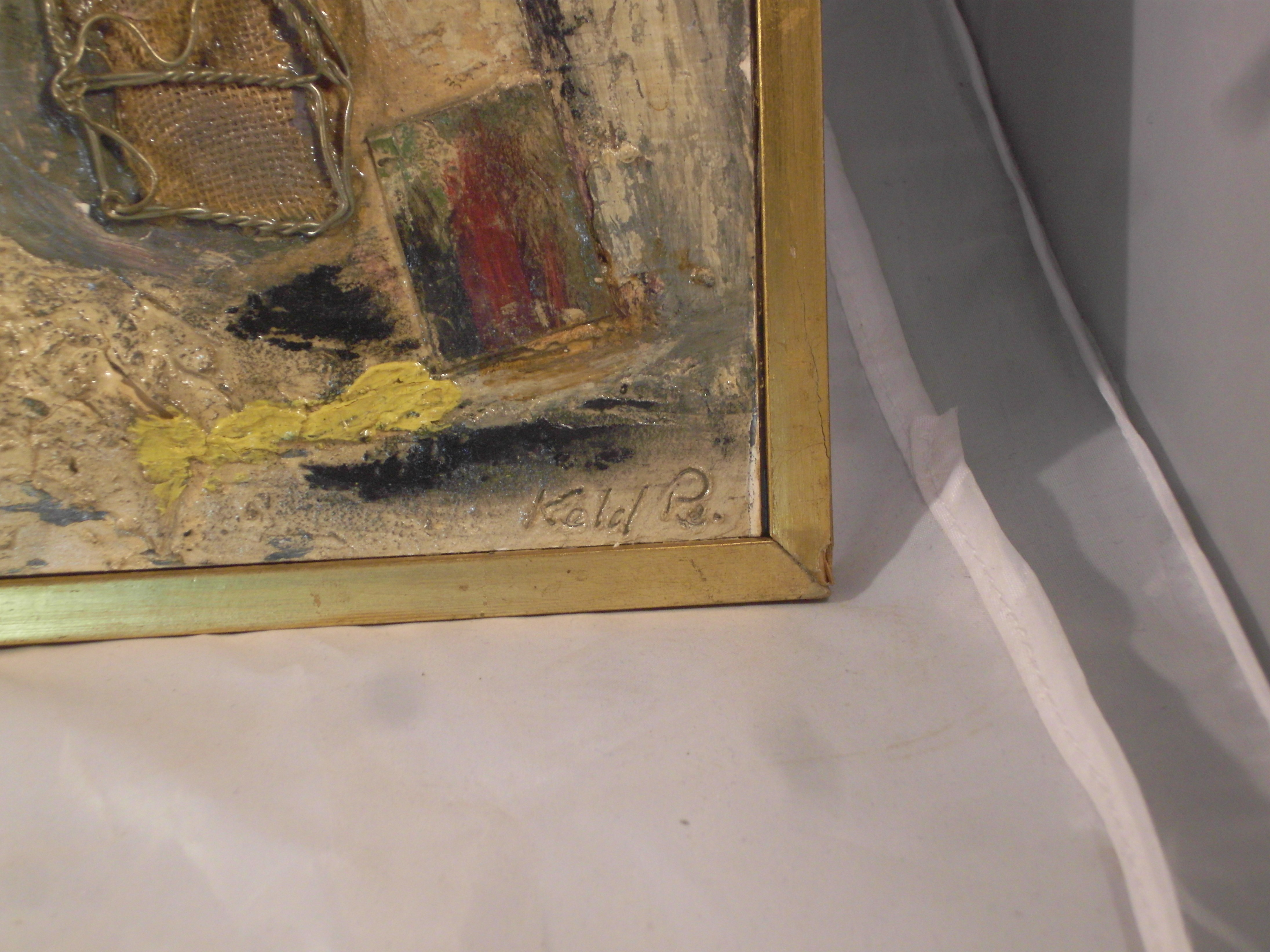 Technika olejna z elementami kolarzu. Sygn. Autor nierozpoznanay. Wym. 21 x 42 cm.