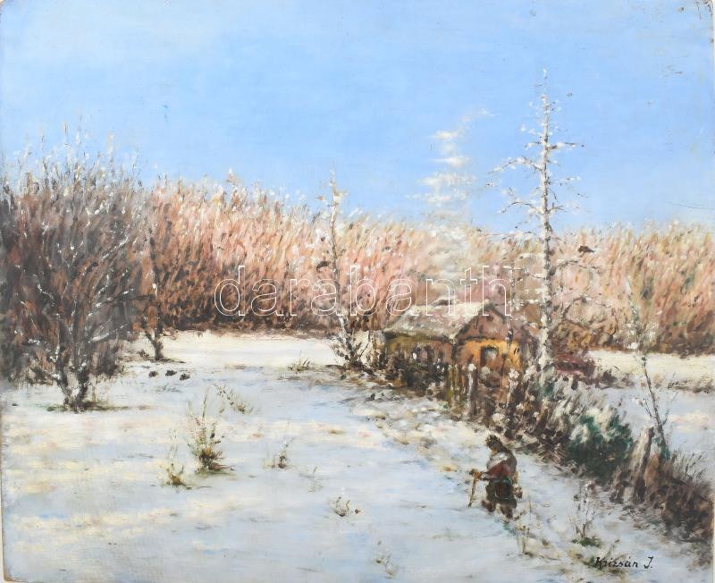 Krizsán J jelzéssel: Séta a hóban. Olaj, farost. 50x60 cm.
