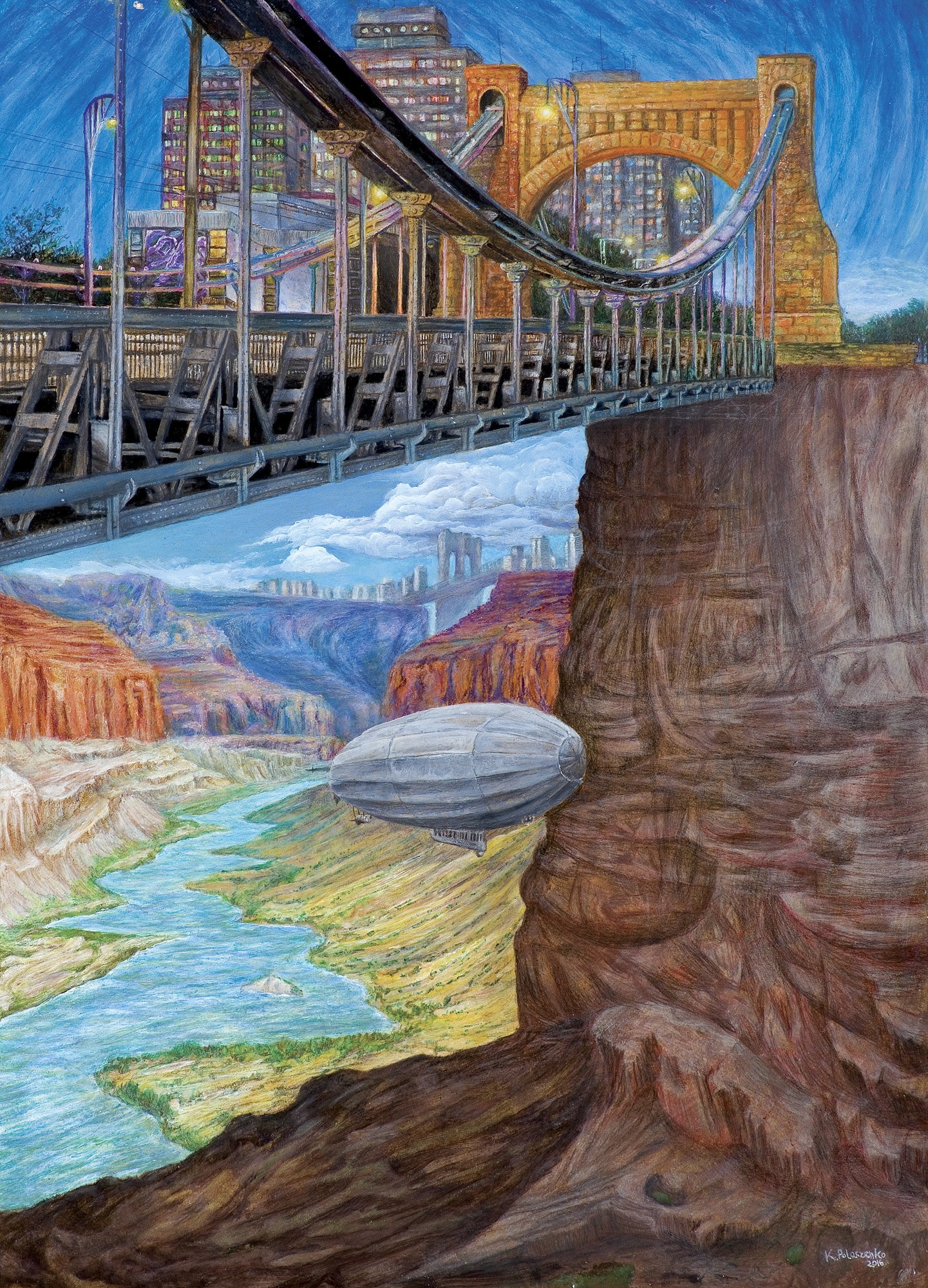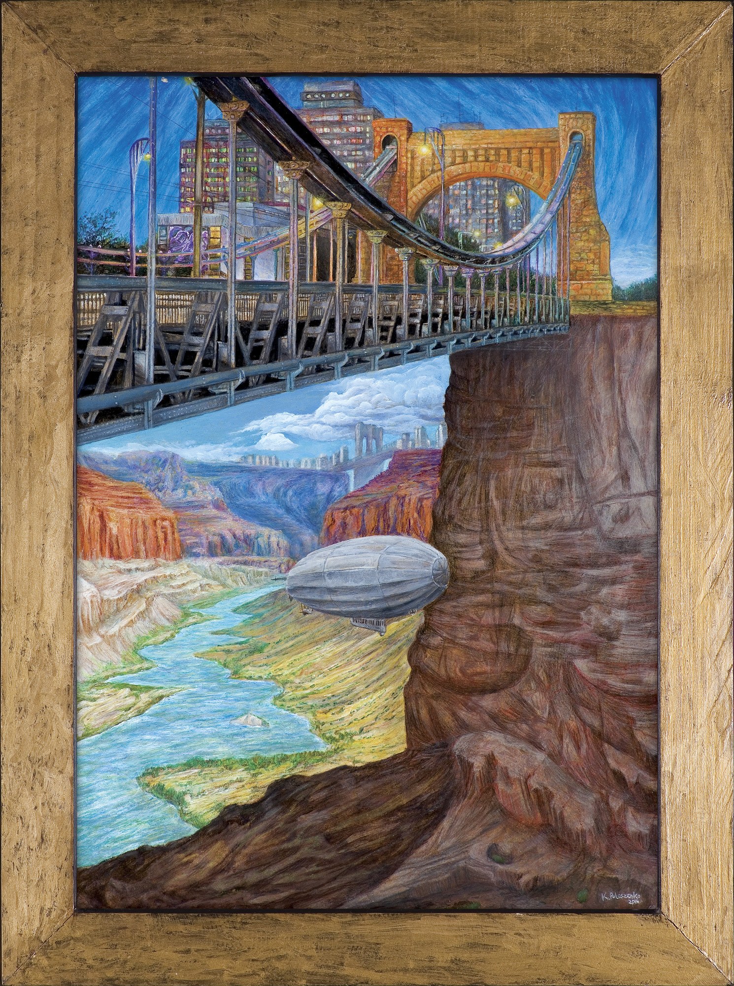 70,0 x 50,0cm - akryl, kredki akwarelowe, pastel, płyta sygn. na odwr.: miasto mostów | K. Polaczenko | 2016
