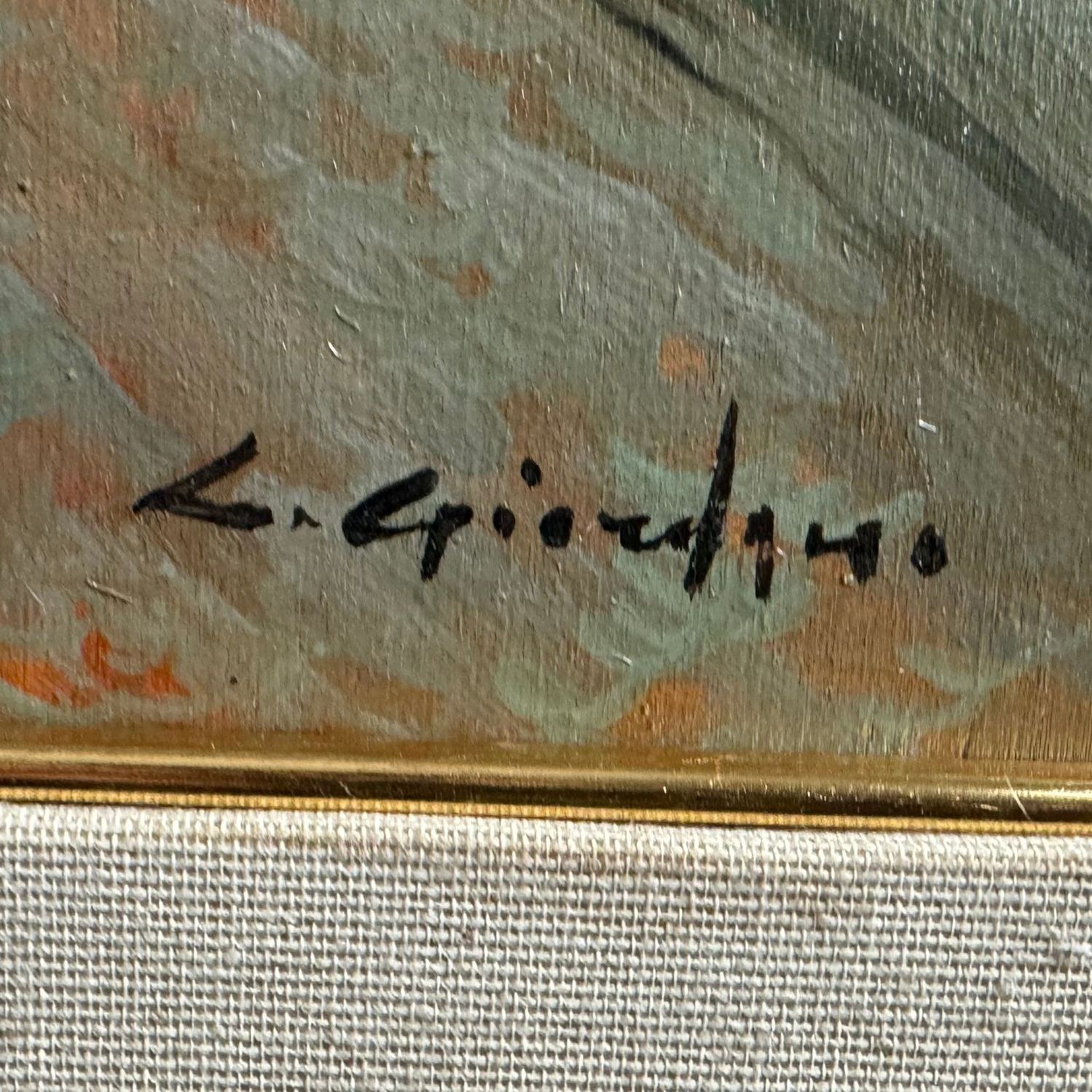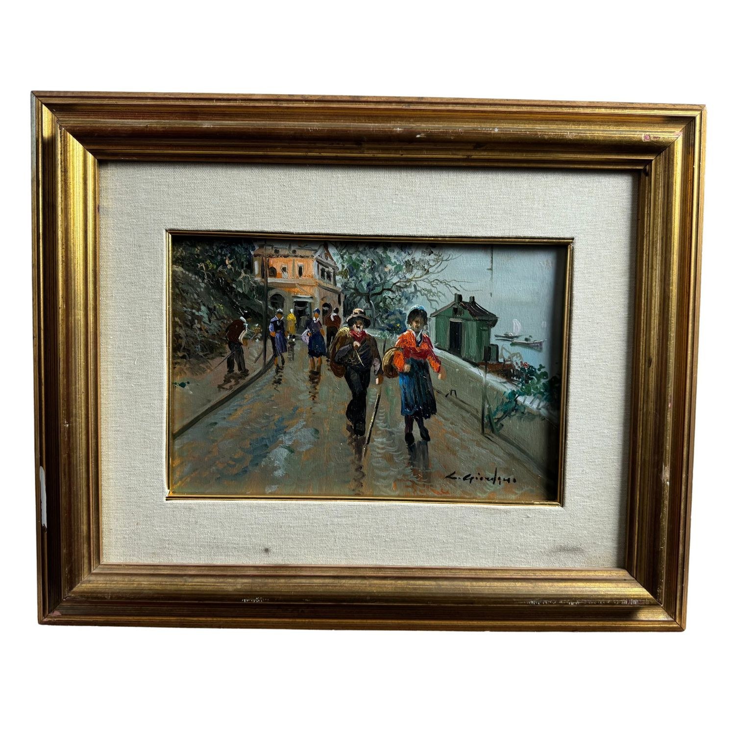 Oil painting on panel, from the 20th century Italian school, depicting characters strolling in Naples.