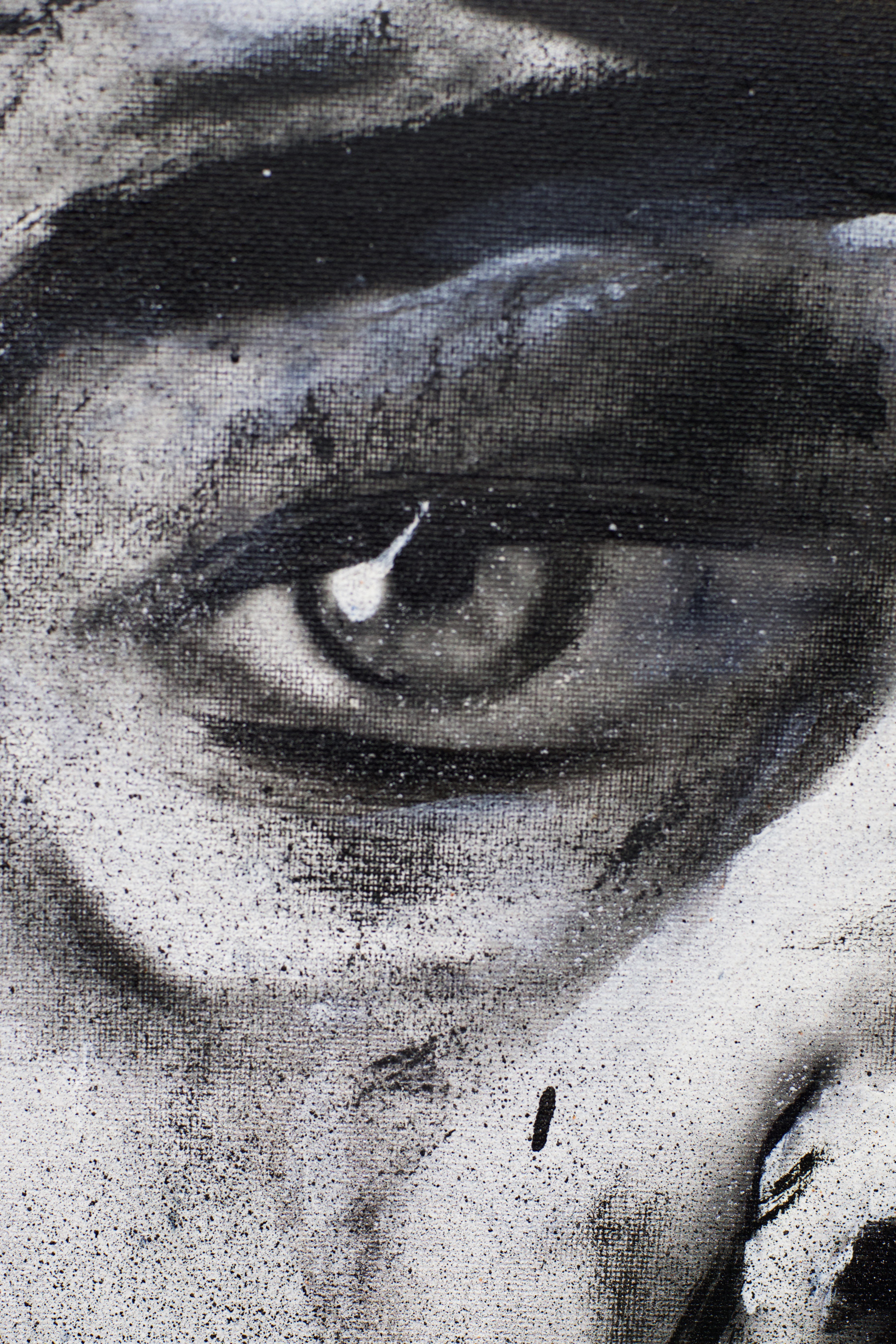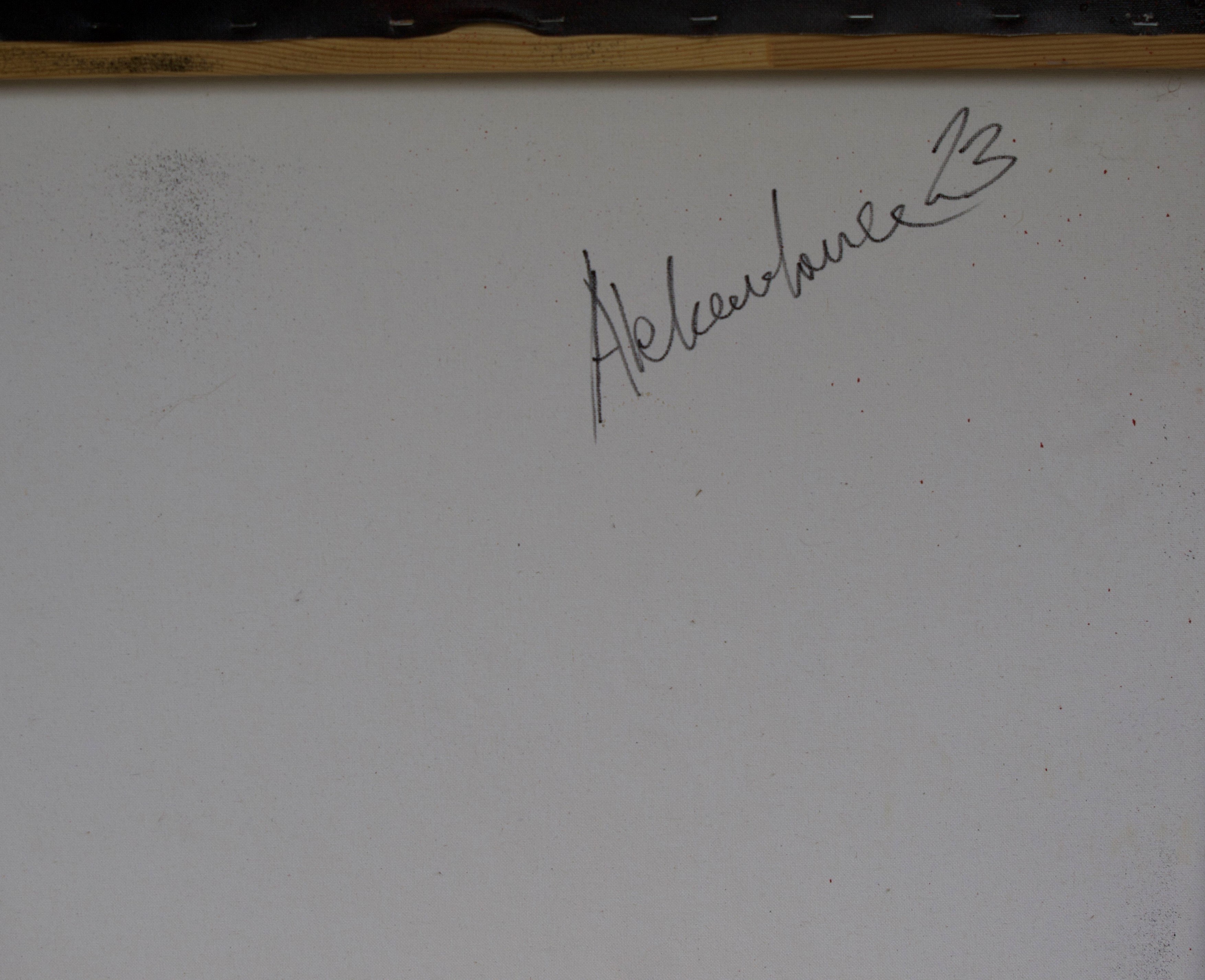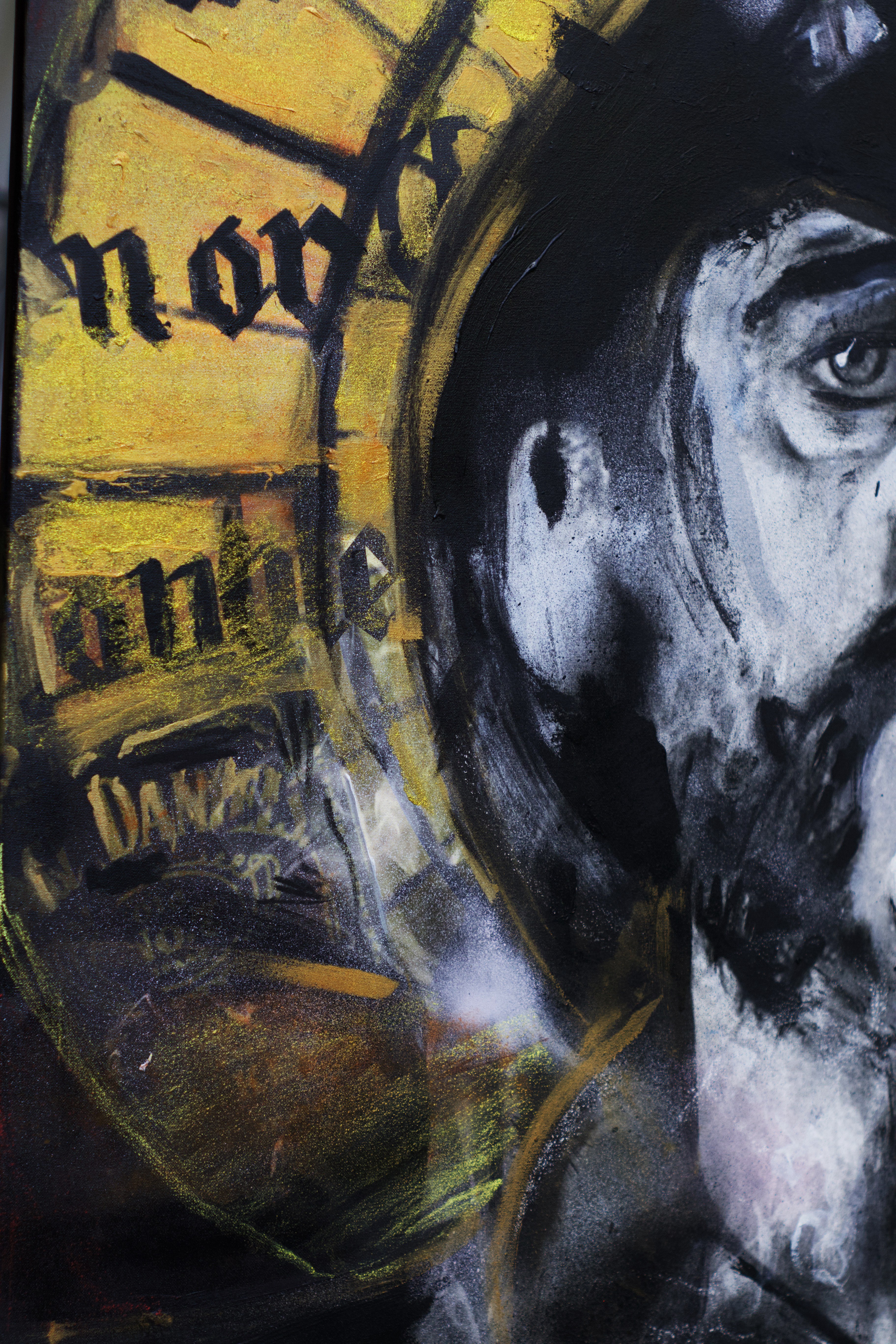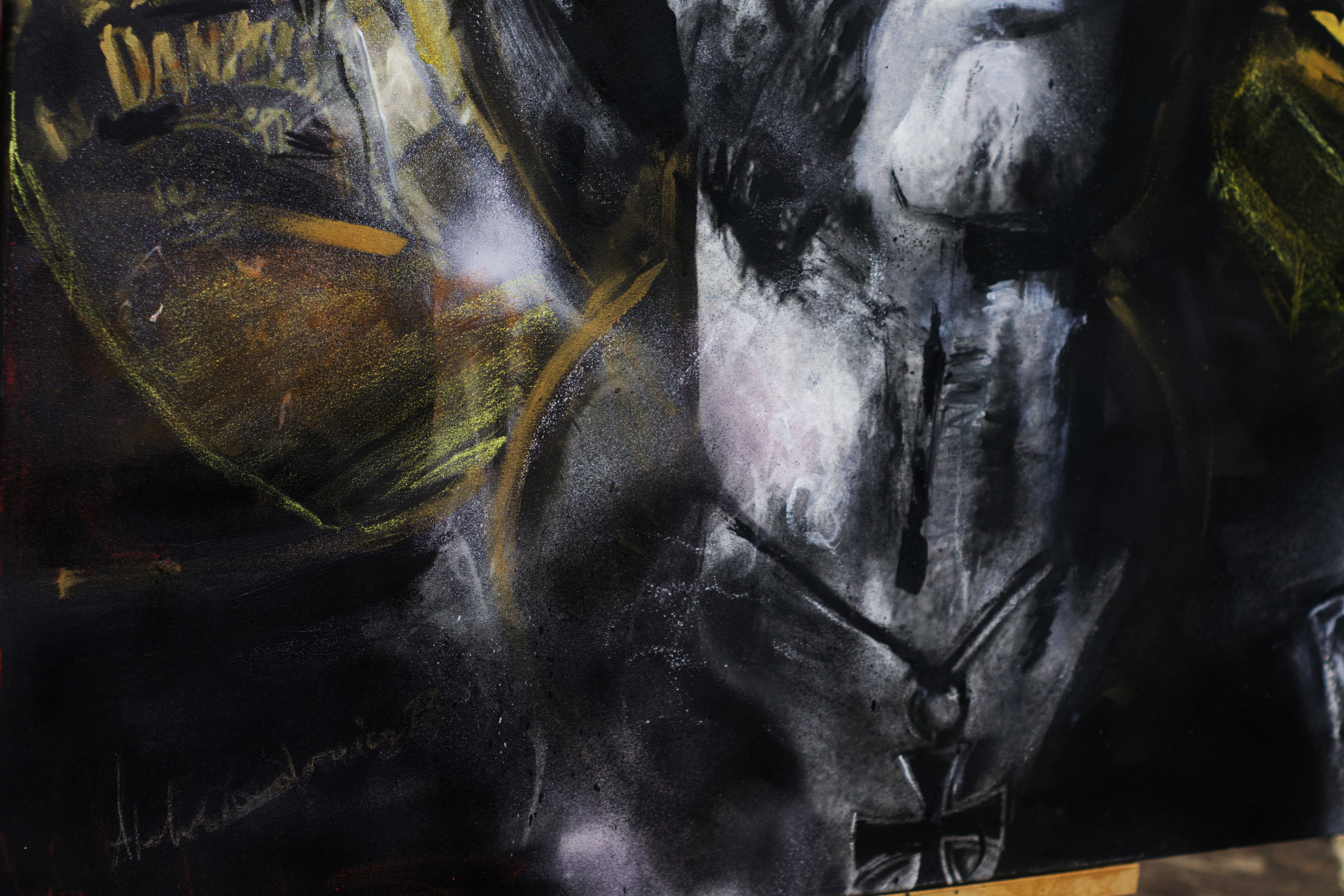 Technika mieszana (olej, akryl, kredka, spray, pastele suche i mokre) na płótnie, 140 x 140 cm.