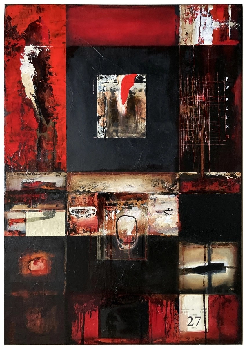 technika mieszana (olej, akryl, kolaż), płótno, 110 x 77 cm, sygn. na odwrocie