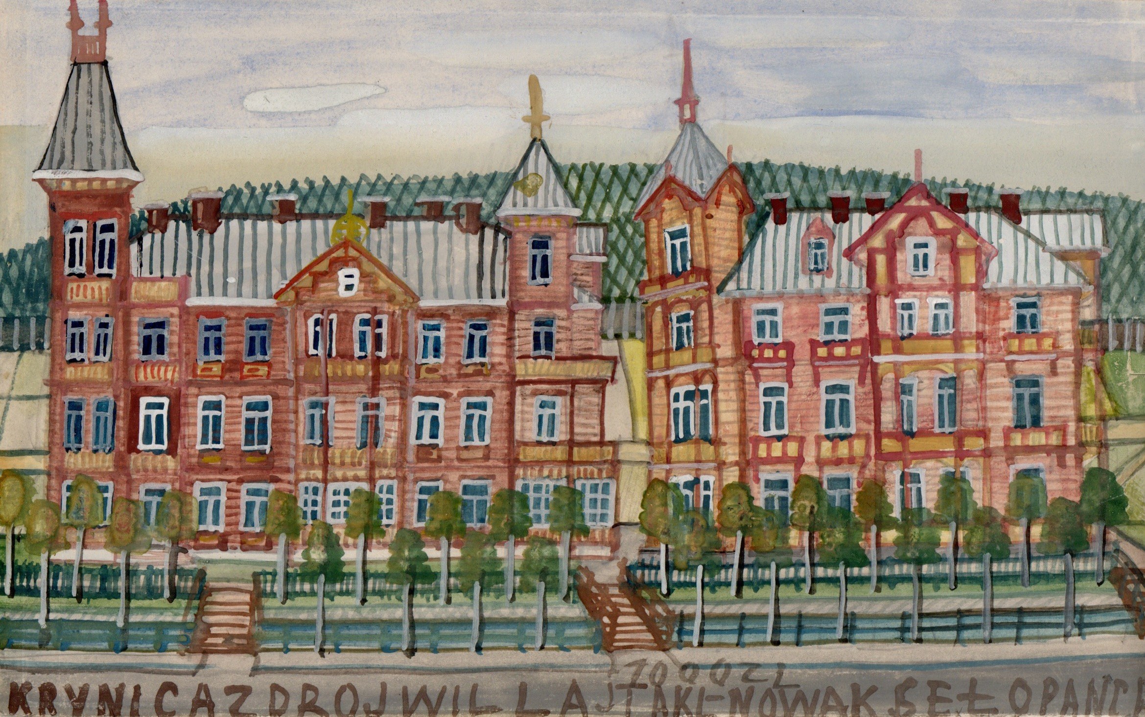 Obraz przedstawia dwie wille, pensjonaty "Tatrzańska" oraz "Witoldówka" w Krynicy położone nad potokiem Kryniczanka przy deptaku uzdrowiskowym. Obie wille spłonęły, ale zostały odbudowane w stylu oryginalnych budynków - willa "Tatrzańska" ukończona została na dniach.