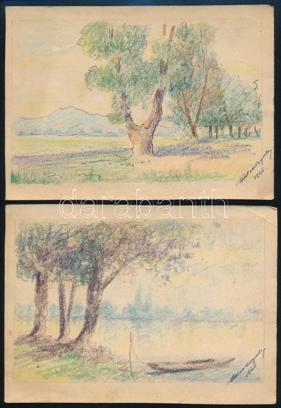 Olvashatatlan jelzéssel (Halvax Gyula?), 2 db mű: Vízpart és hegyvidéki táj. Vegyes technika, papír...
