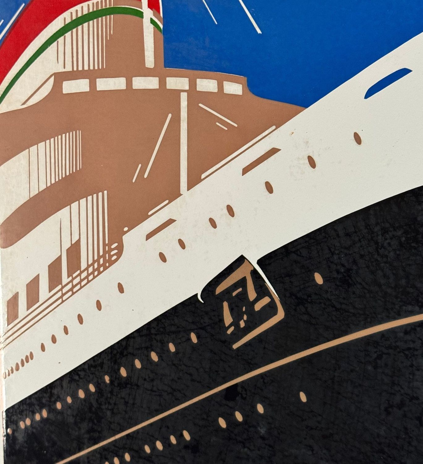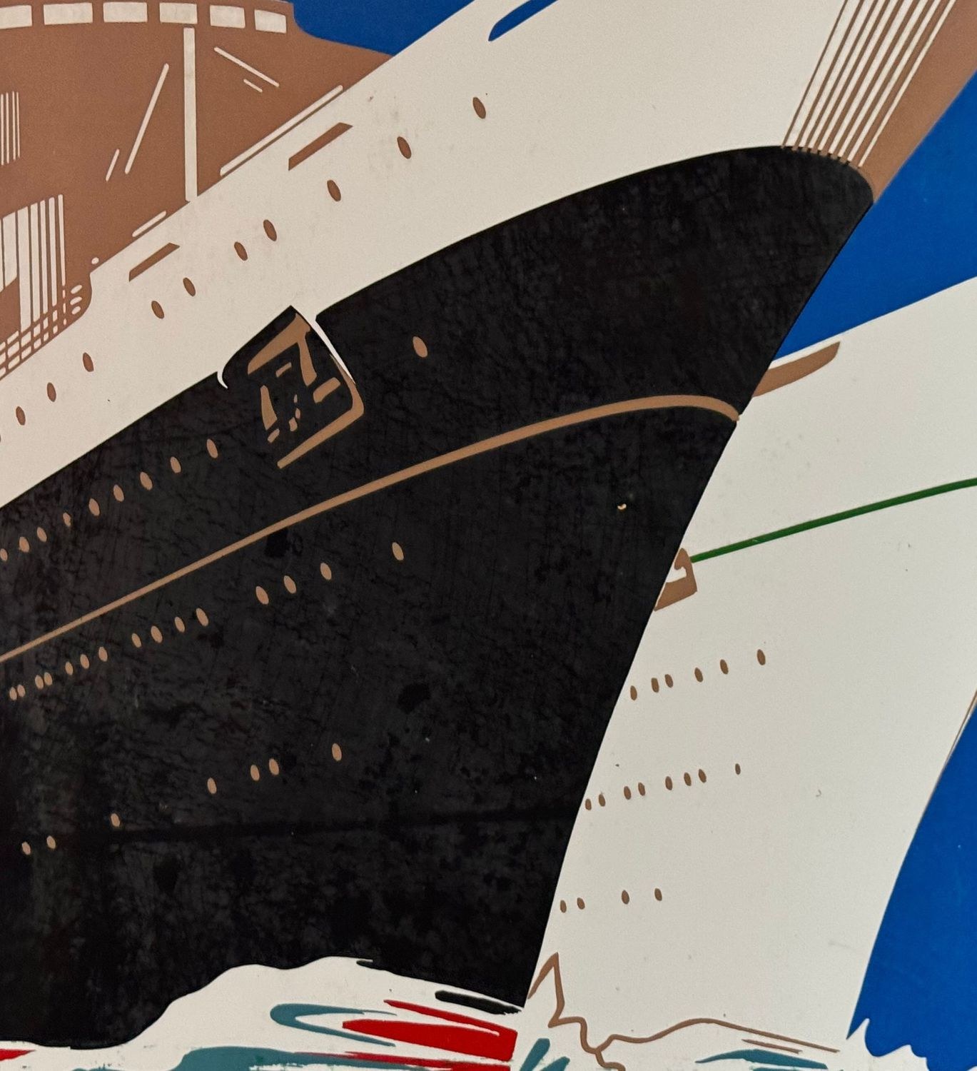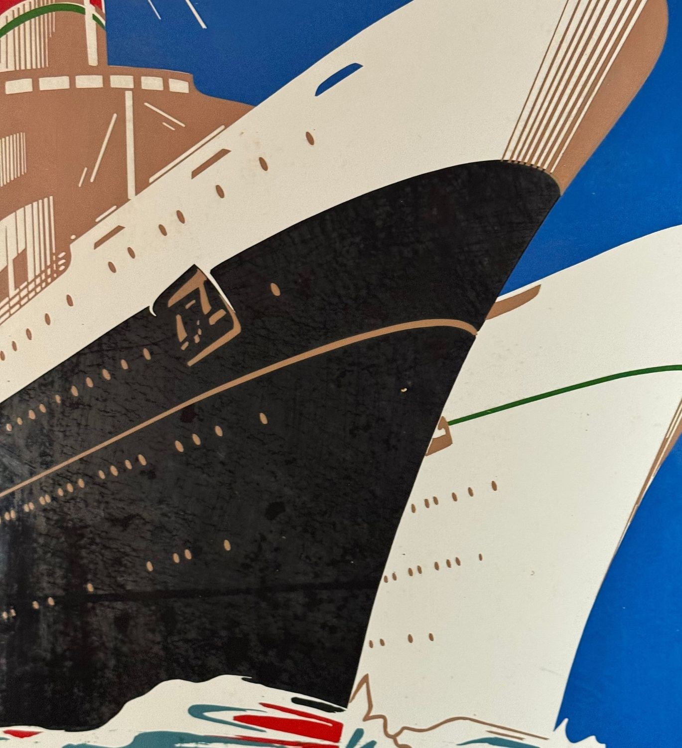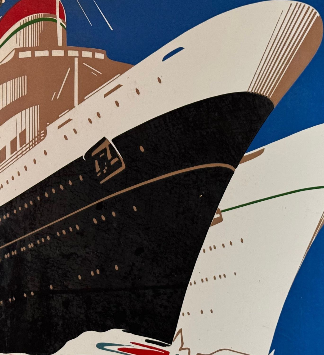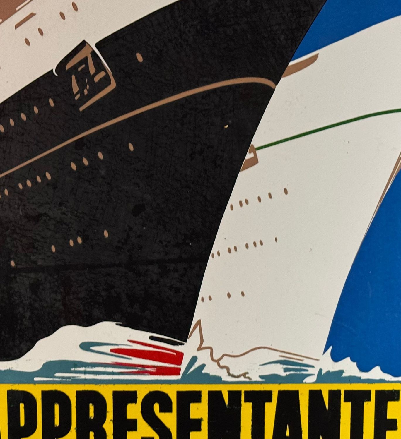Original enamel sign of Italian representation, produced by the Perego Smalteria of Trezzo between 1930 and 1950. Dimensions: 70 × 50 cm. The sign features a Futurist-style graphic depicting two ships sailing, identifiable as the *Andrea Doria* and the *Cristoforo Colombo*. From a private collection, it is in good overall condition, with light signs of age and wear, as shown in the attached photos.