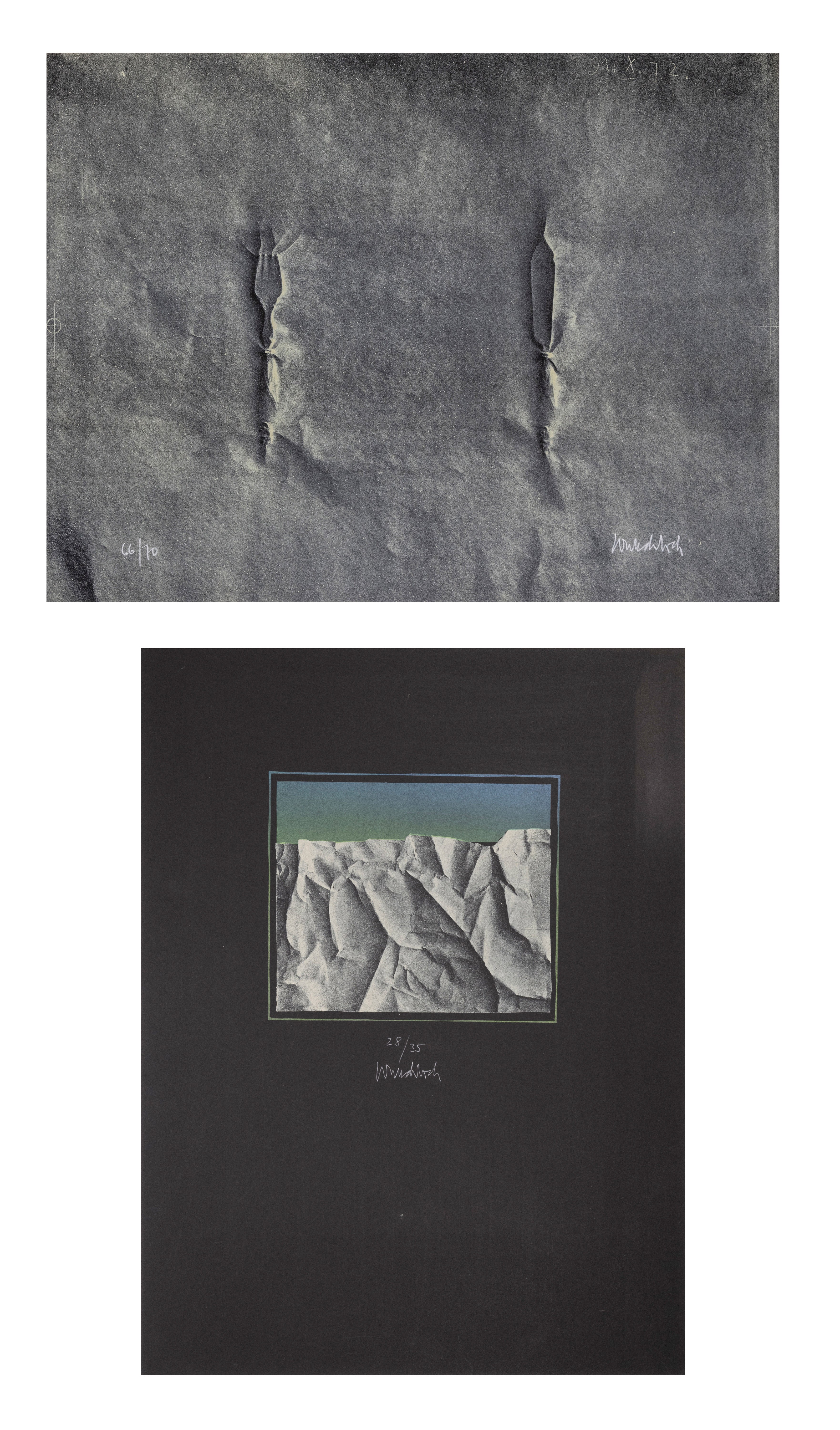 Pair of Prints,color lithograph on paper,50 × 66.5 cm sheet size (''Fischbesteck''), 66.5 × 50 cm sheet size (''Landschaft''),signed (''Fischbesteck'' and ''Landschaft''),''Fischbesteck'' dated in the stone 31.10.72,''Fischbesteck'' numbered 66/70, ''Landschaft'' numbered 28/35, surface partially rubbed, sheet margins bumped