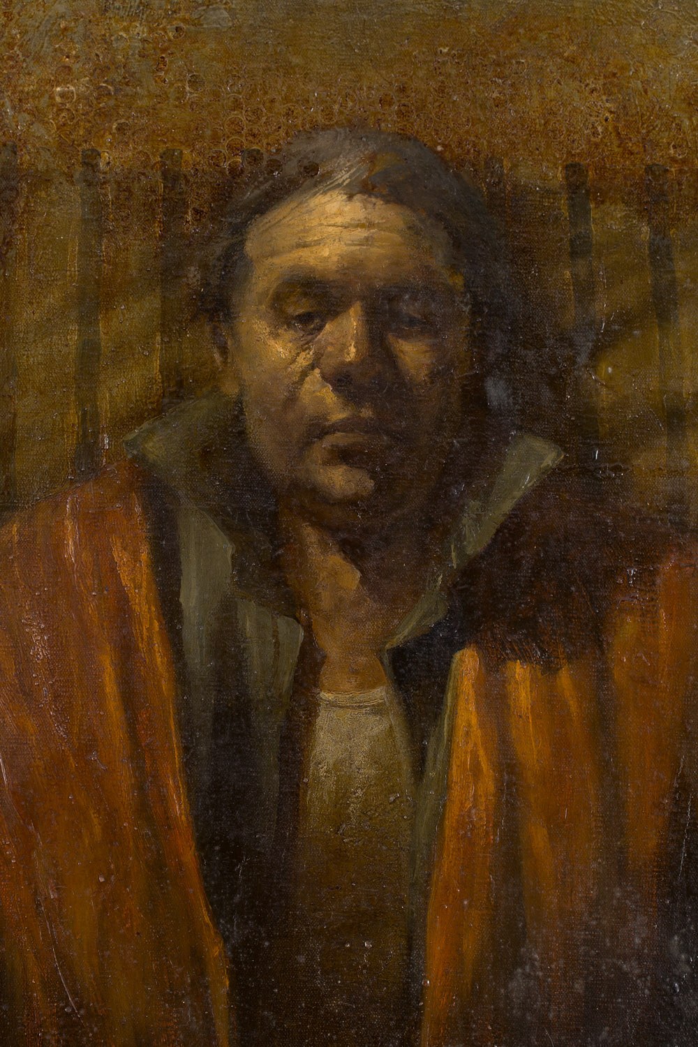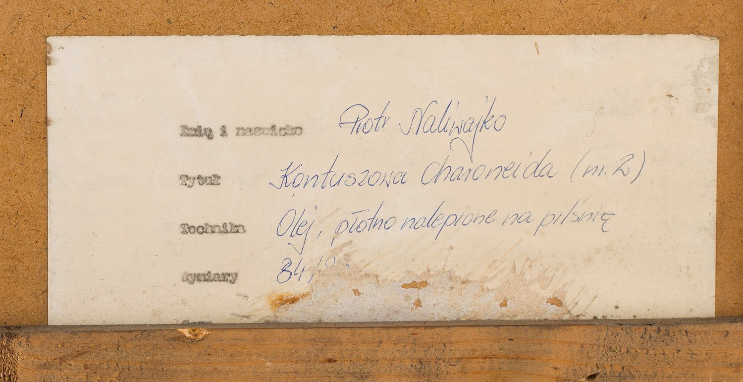 n odwrociu papierowa nalepka z opisem pracy: 'Imię i nazwisko Piotr Naliwajko | Tytuł Kontuszowa Charoneida (nr. 2) | Technika Olej, płótno nalepione na pilśnię | Wymiary 84/ [ nieczytelne]'
