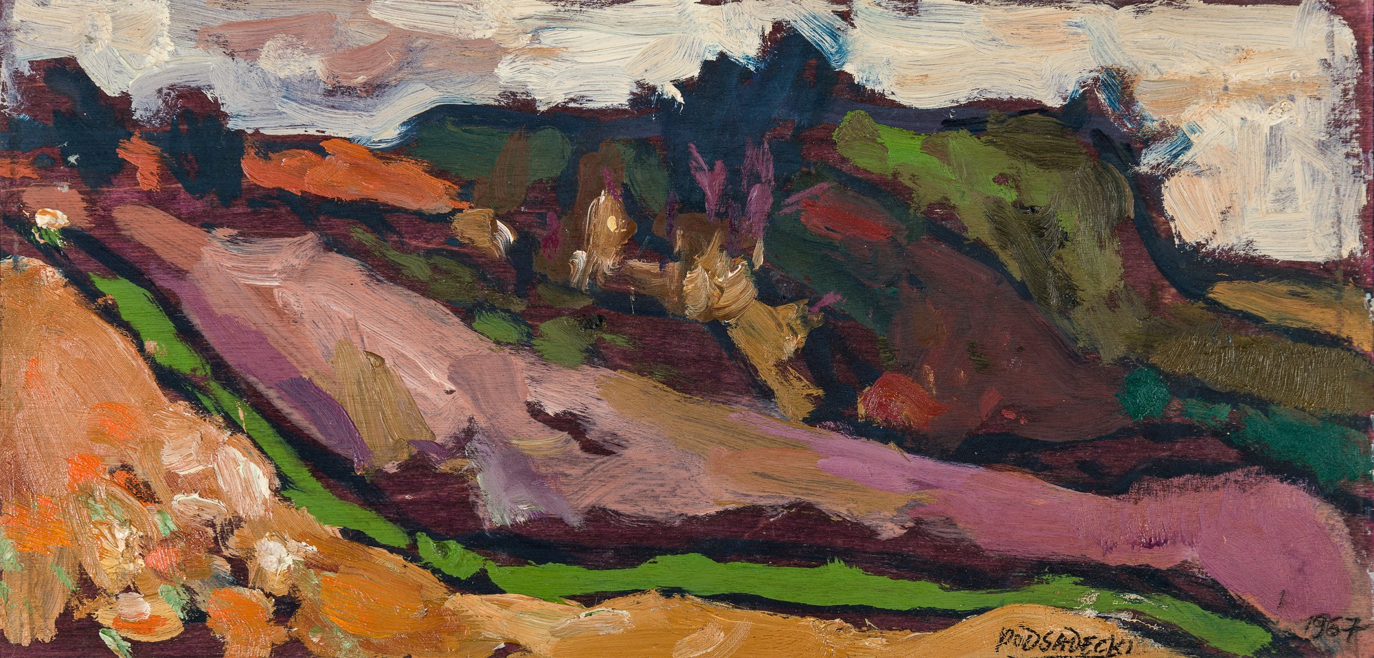 Olej, sklejka; wym.: 15,5 x 31,5 cm; Sygn. p.d.: Podsadecki, na odwrocie opis autorski
