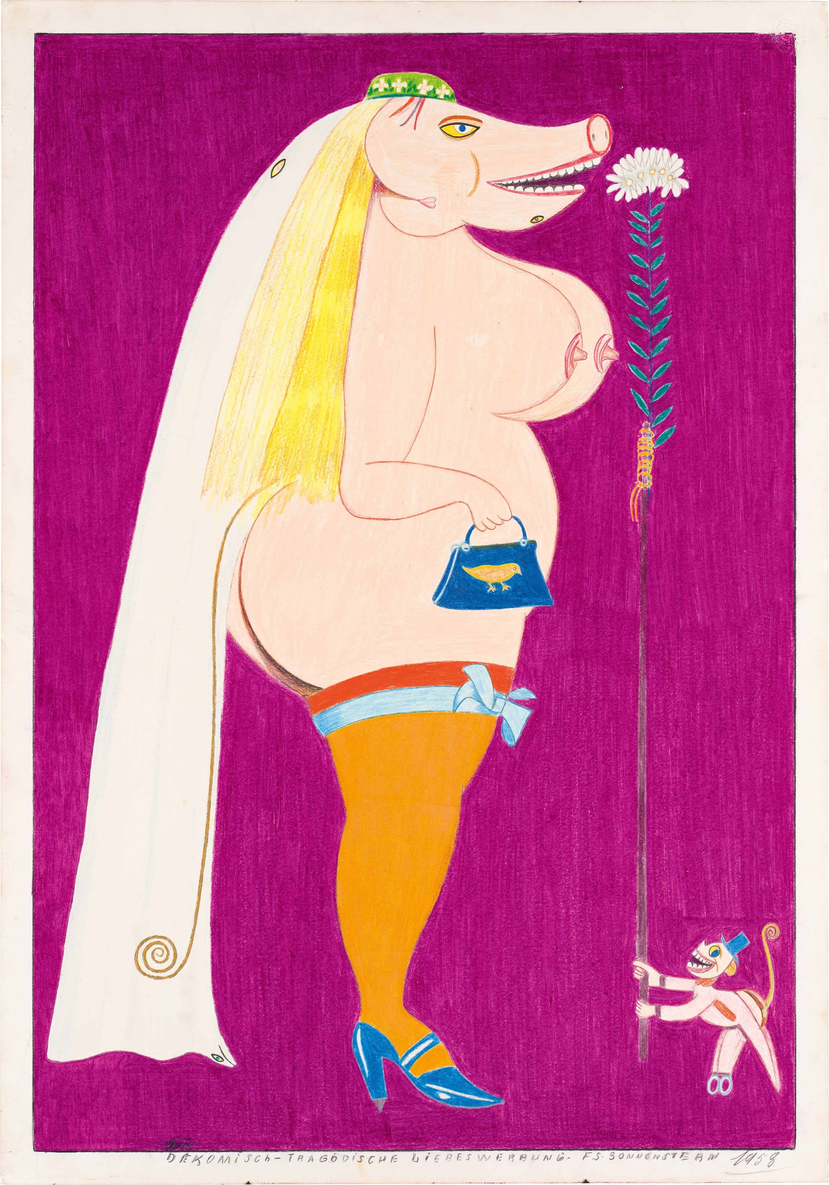 inscribed, signed and dated on the bottom: Die Komisch-Tragödische Liebeswerbung. F.S. Sonnenstern 1958