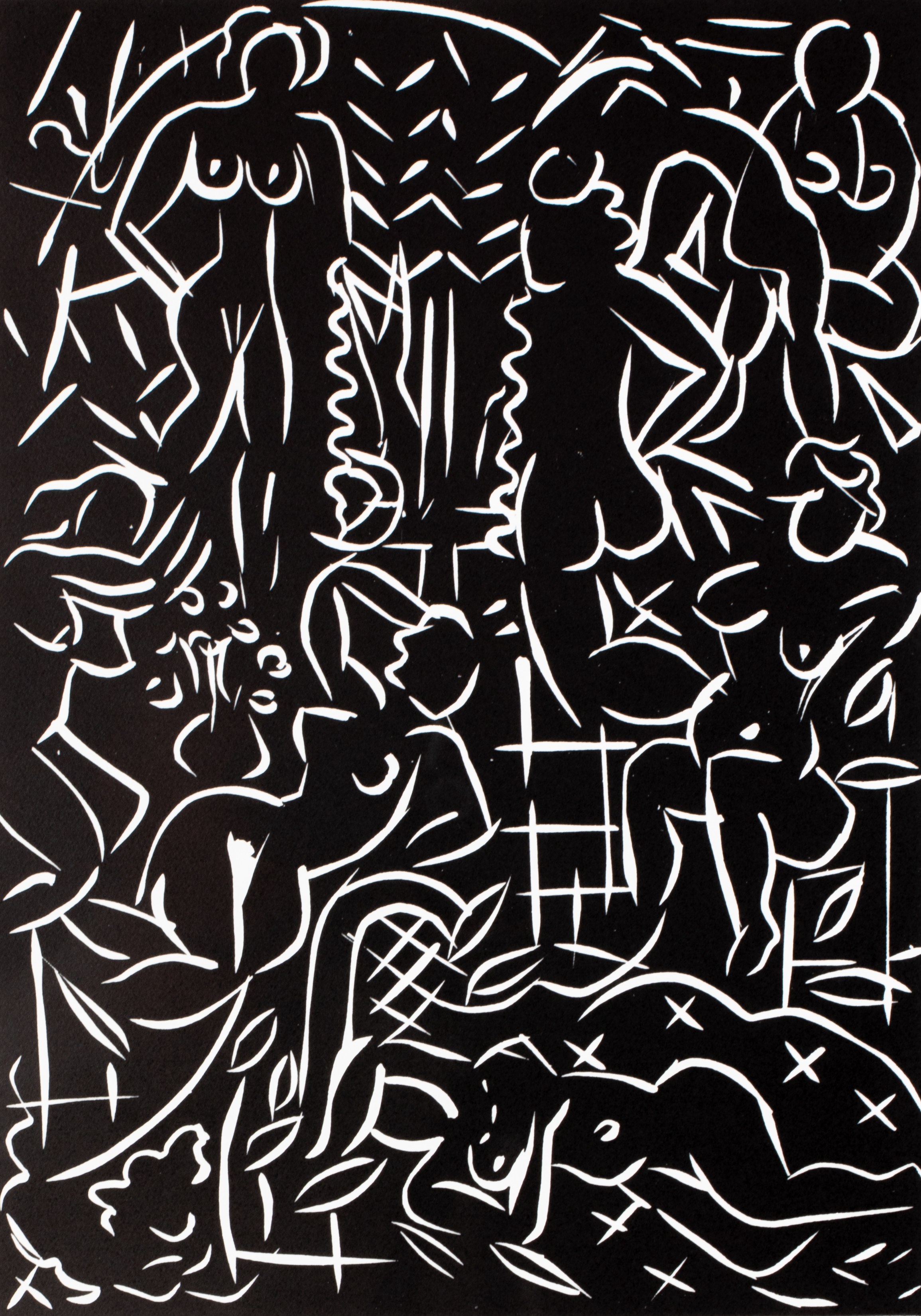 'Bathing Women II (black)' and 'Bathing Women VI (blue)', two linocuts, each 47.5 cm × 33 cm visible dimensions, both signed in pencil and numbered 3/5, depicting female nudes, mounted