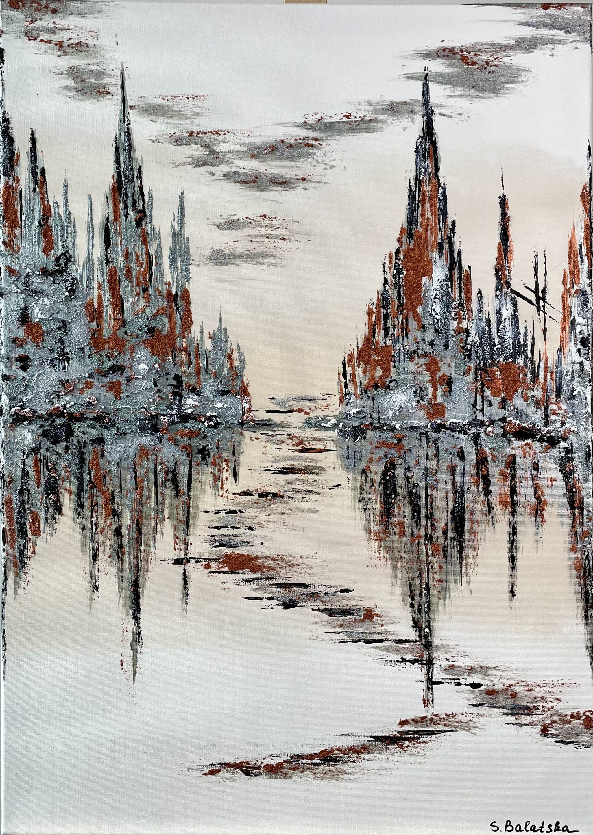 Svitlana Balatska, Modern Abstract City Painting in Silver & Burnt Sienna, 2022 r.