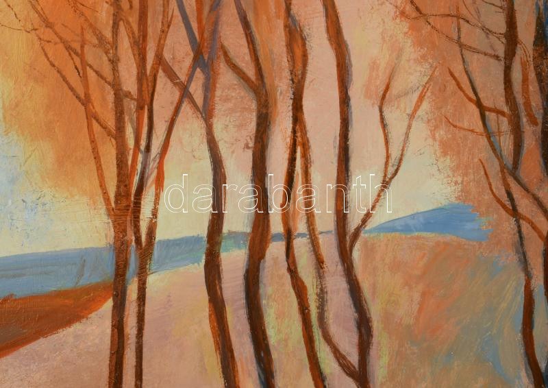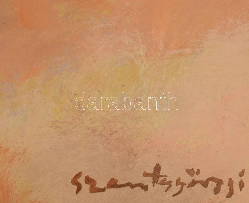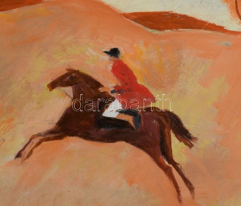Szentgyörgyi Kornél (1916-2006): Vágta. Olaj, farost, jelezve jobbra lent, hátoldalán kissé töredékes címkén Szentgyörgyi Kornél autográf feliratával. Dekoratív fakeretben, 50×60 cm / oil on wood fiber, signed, framed