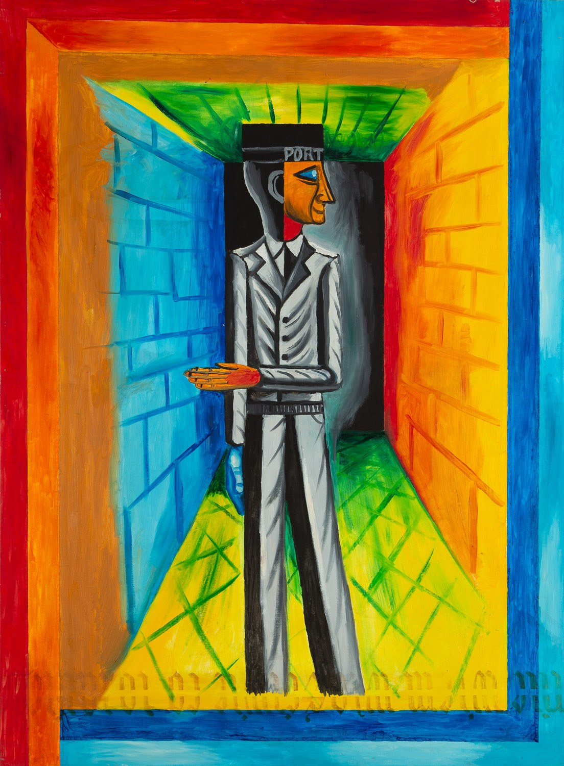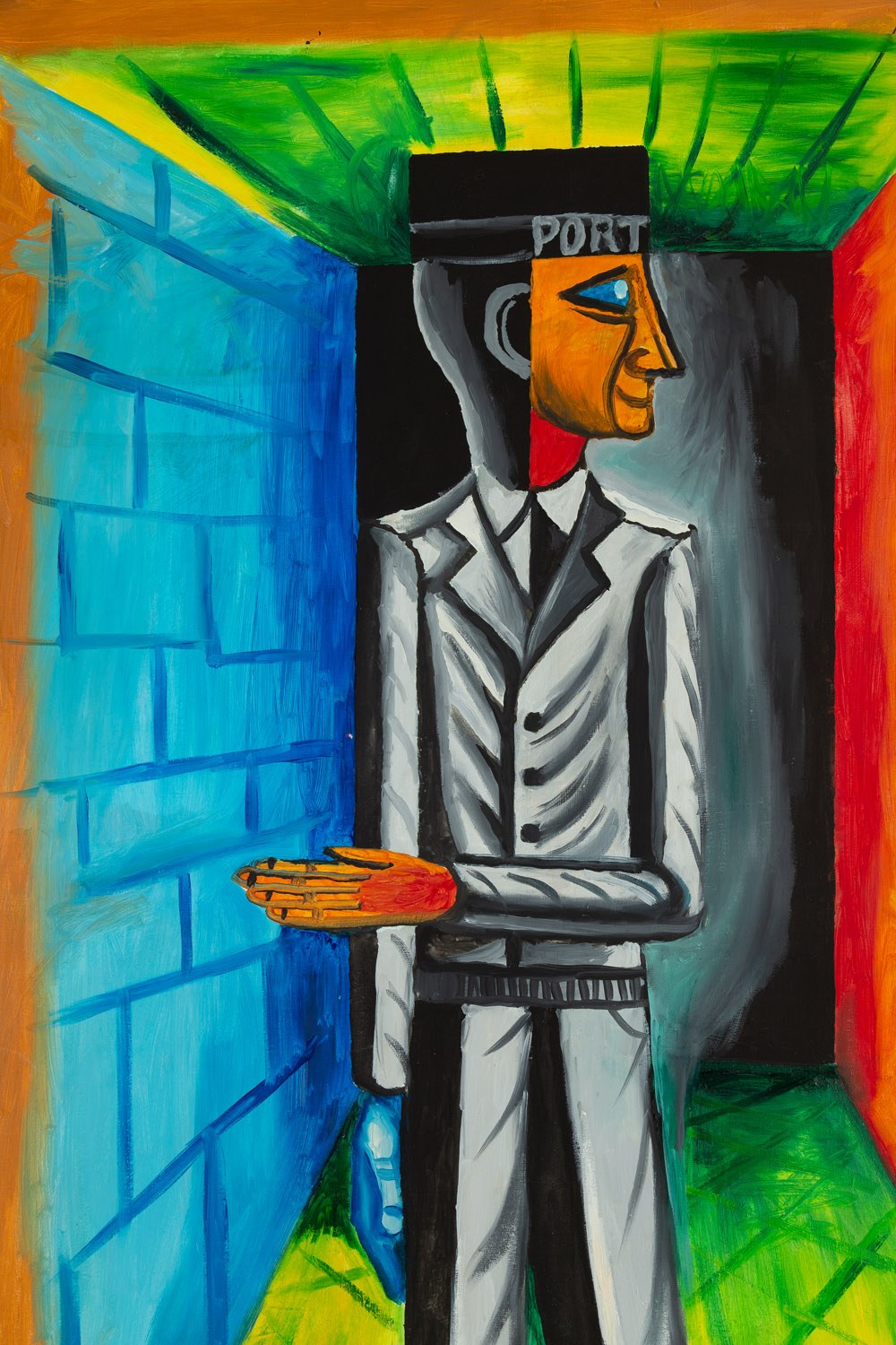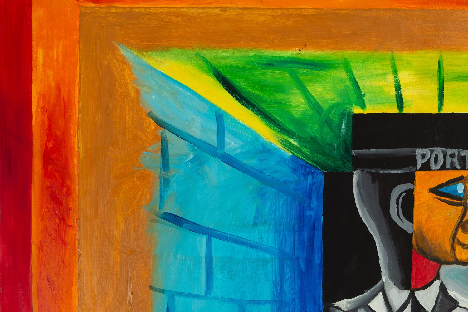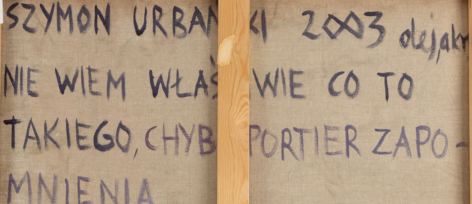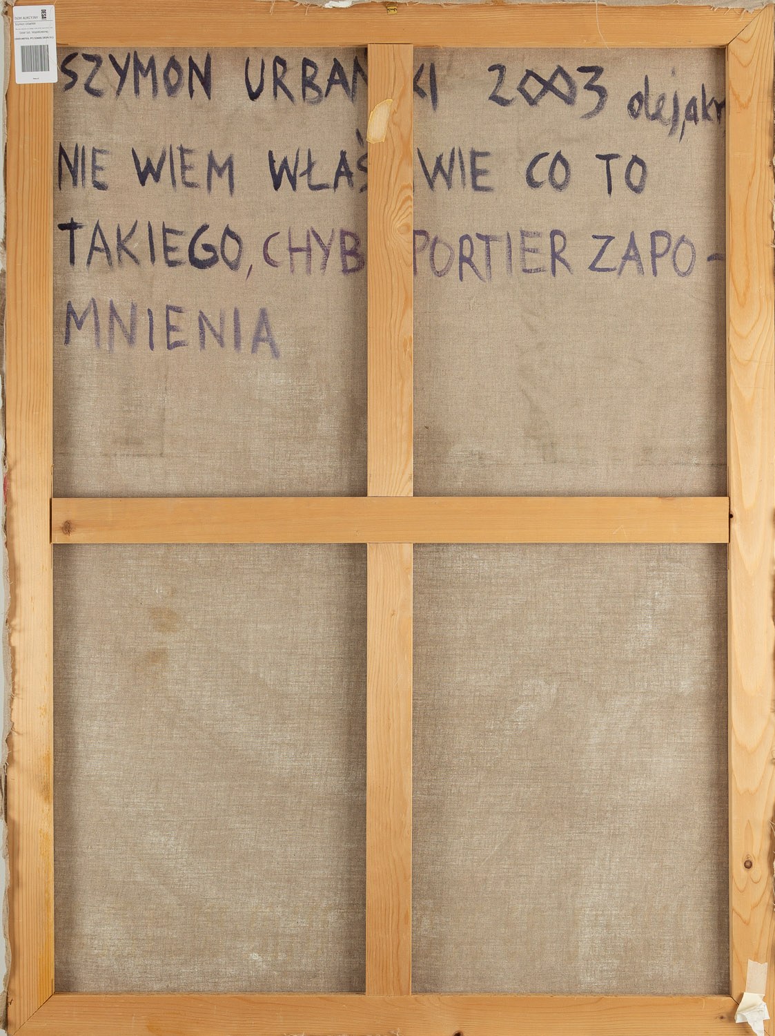 sygnowany, datowany i opisany na odwrociu: 'SZYMON URBAŃSKI 2003 olej, akryl | NIE WIEM WŁAŚCIWIE CO TO TAKIEGO, CHYBA PORTIER ZAPO- | MNIENIA'