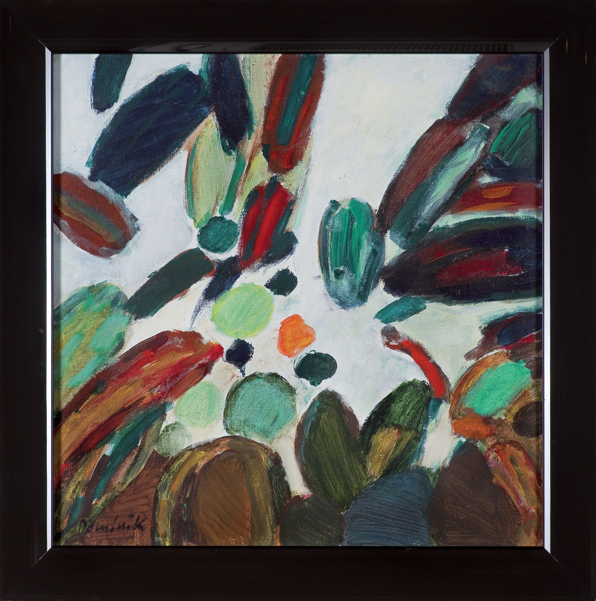 Tadeusz Dominik (Szymanów 14 I 1928 - Warszawa 20 V 2014) studiował na Wydziale Malarstwa ASP w Warszawie pod kierunkiem prof. J.Cybisa (1946-51, dyplom 1953). Od 1951 był pedagogiem na macierzystym Wydziale, początkowo jako asystent Cybisa. Od 1965 prowadził własną pracownię, w 1979 otrzymał tytuł profesora. W 1990 przeszedł na emeryturę. W czasie studiów oddziałały nań - za pośrednictwem osobowości i sztuki Cybisa - idee polskiego koloryzmu, które następnie twórczo i samodzielnie kontynuował. Początkowo tworzył obrazy figuratywne. Debiutował na słynnej wystawie w warszawskim Arsenale w 1955, gdzie zdobył nagrodę. W tym okresie obok malarstwa uprawiał drzeworyt, operujący szerokimi płaszczyznami bieli i czerni (drzeworyty wystawiał m.in. na Biennale w Wenecji w 1956). W drugiej poł. lat 50. zaczął malować obrazy abstrakcyjne, początkowo utrzymane w ekspresyjnej i spontanicznej stylistyce malarstwa informel. W latach 60. wzbogacił swe prace o efekty fakturowe. Niezmienną inspiracją była dla malarza natura, bogactwo i kolorystyka jej form. Pozostał jej wierny do dziś, poddając zmianom sam sposób malowania. Stopniowo rozjaśniał i wygładzał swe kompozycje, wprowadzając efekty dekoracyjne, jak rytmiczne powtórzenia form czy rodzaj malowanych „rastrów“, regularnie znaczących fragmenty kompozycji. Wśród wielu nagród otrzymał m.in. laur „Złotego Grona“ w Zielonej Górze w 1963, Grand Prix Festiwalu Polskiego Malarstwa Współczesnego w Szczecinie w 1968, nagrodę im. George’a Rowney’a w Londynie w 1973 i Nagrodę im. Jana Cybisa w Warszawie w 1973. Równolegle z malarstwem zajmował się gobelinem, ceramiką, również grafiką komputerową.