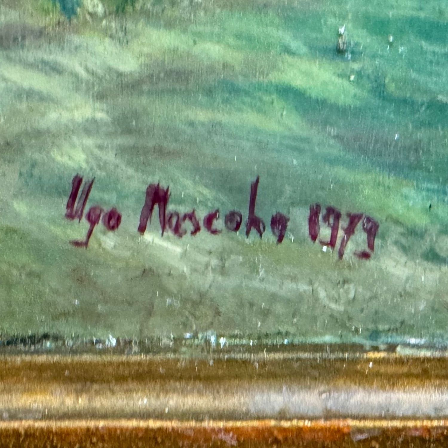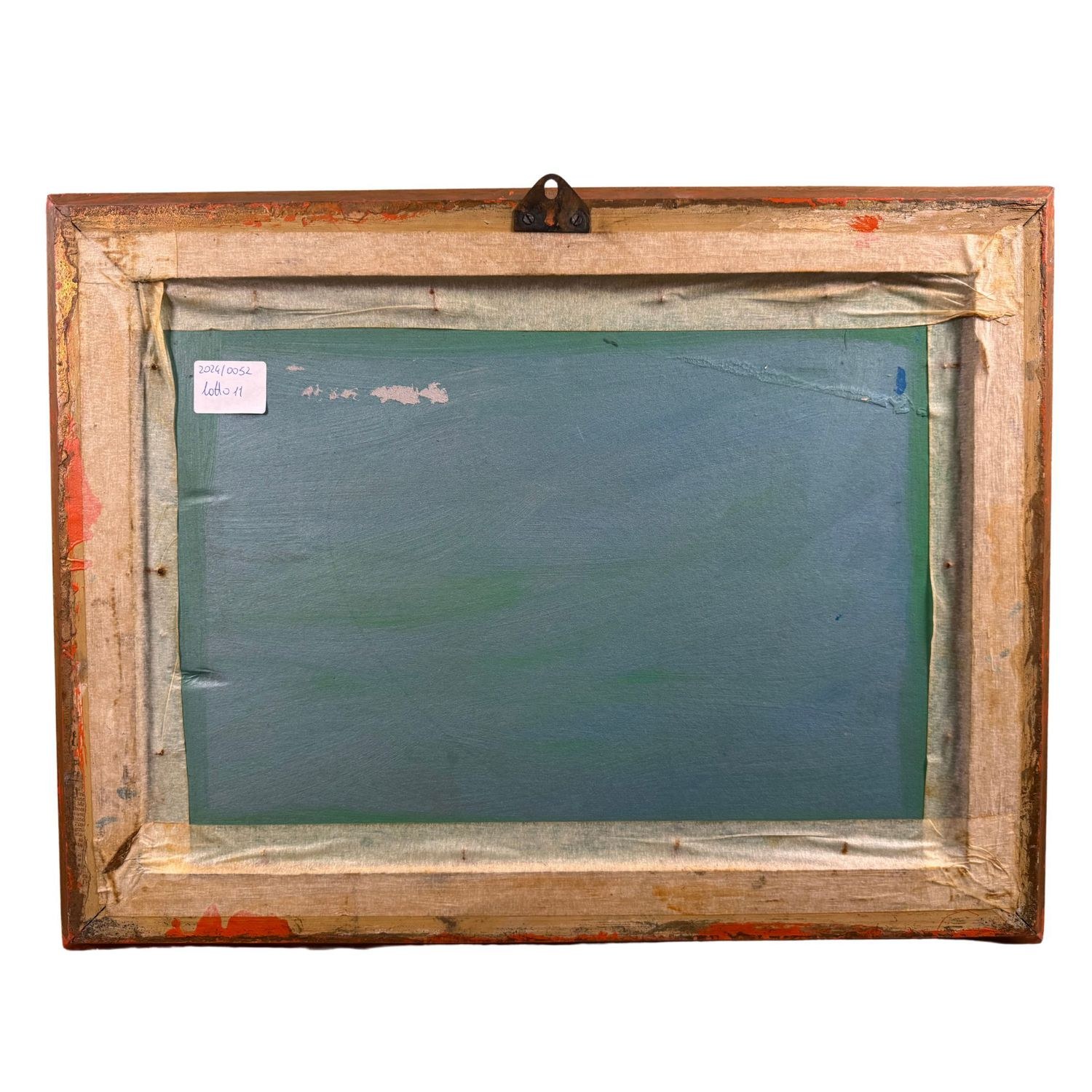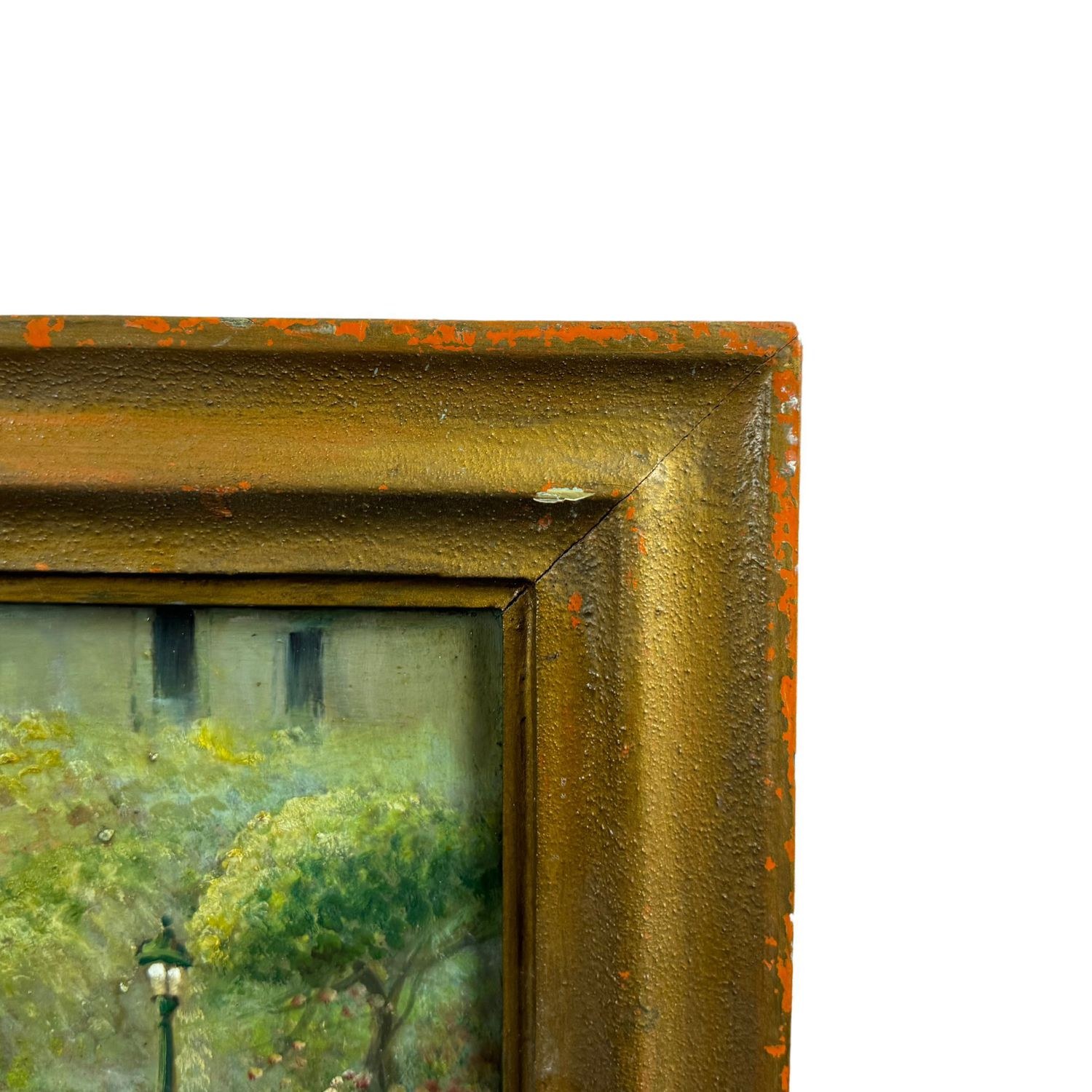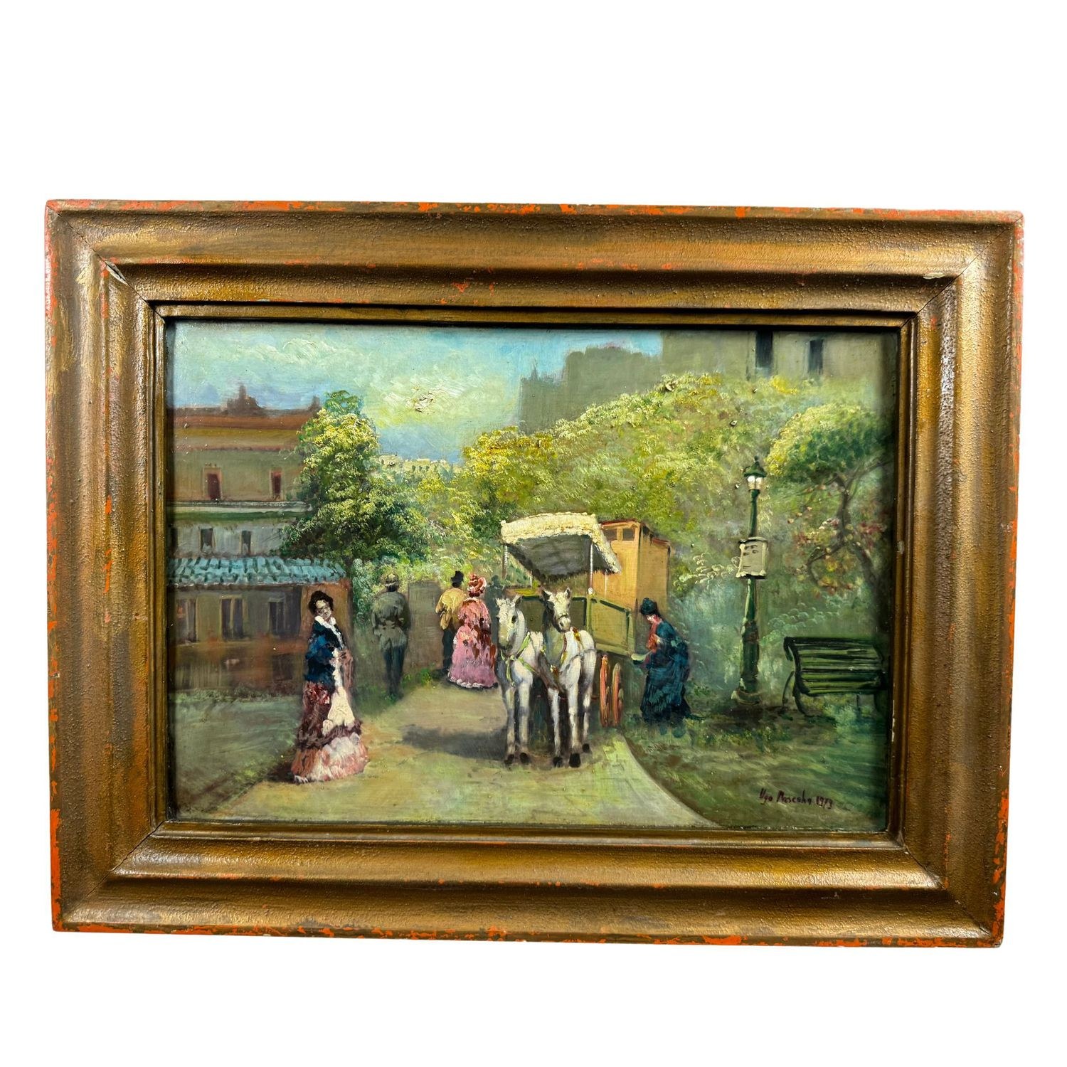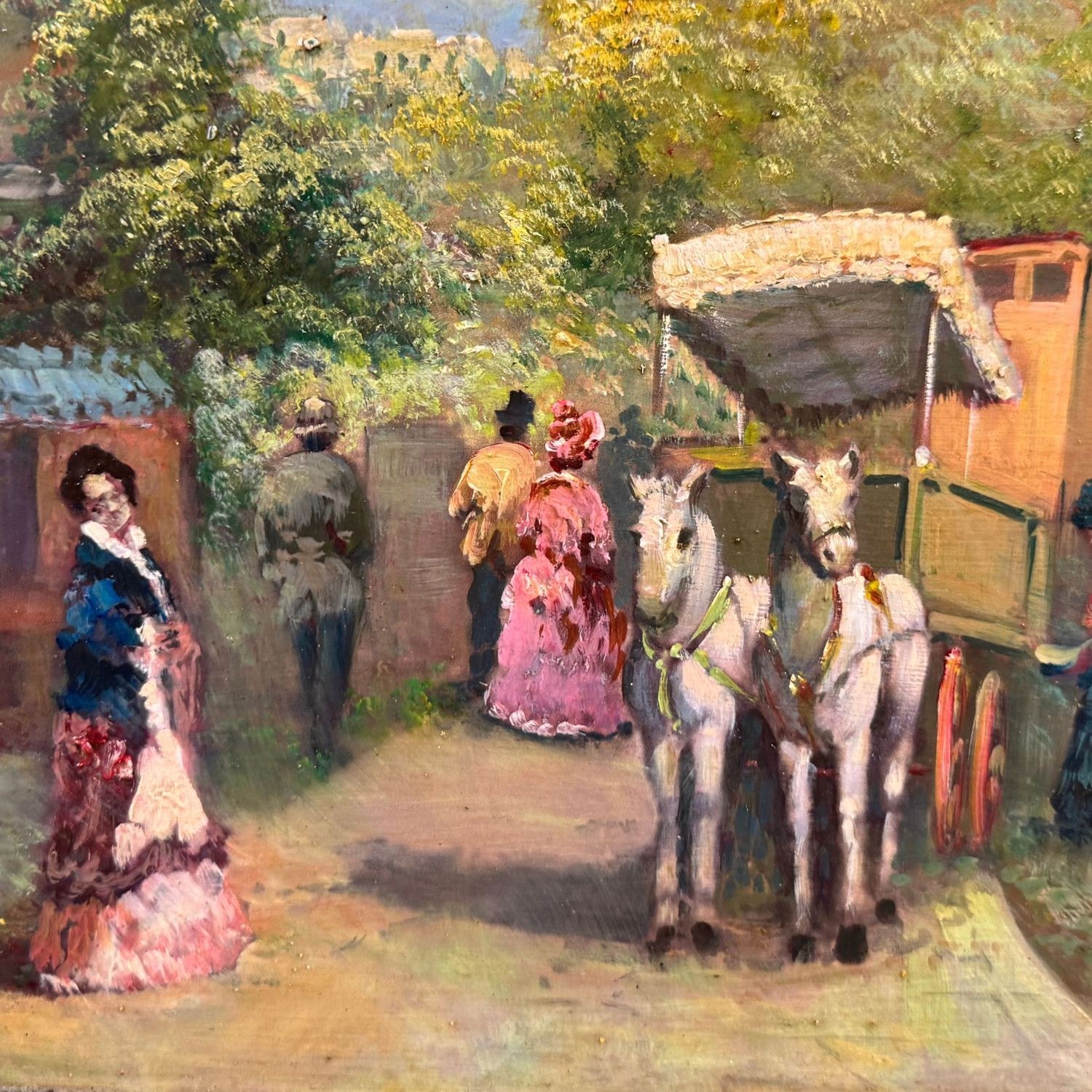 Oil painting on panel, from the 20th century Italian school, depicting a Parisian scene with elegantly dressed characters.