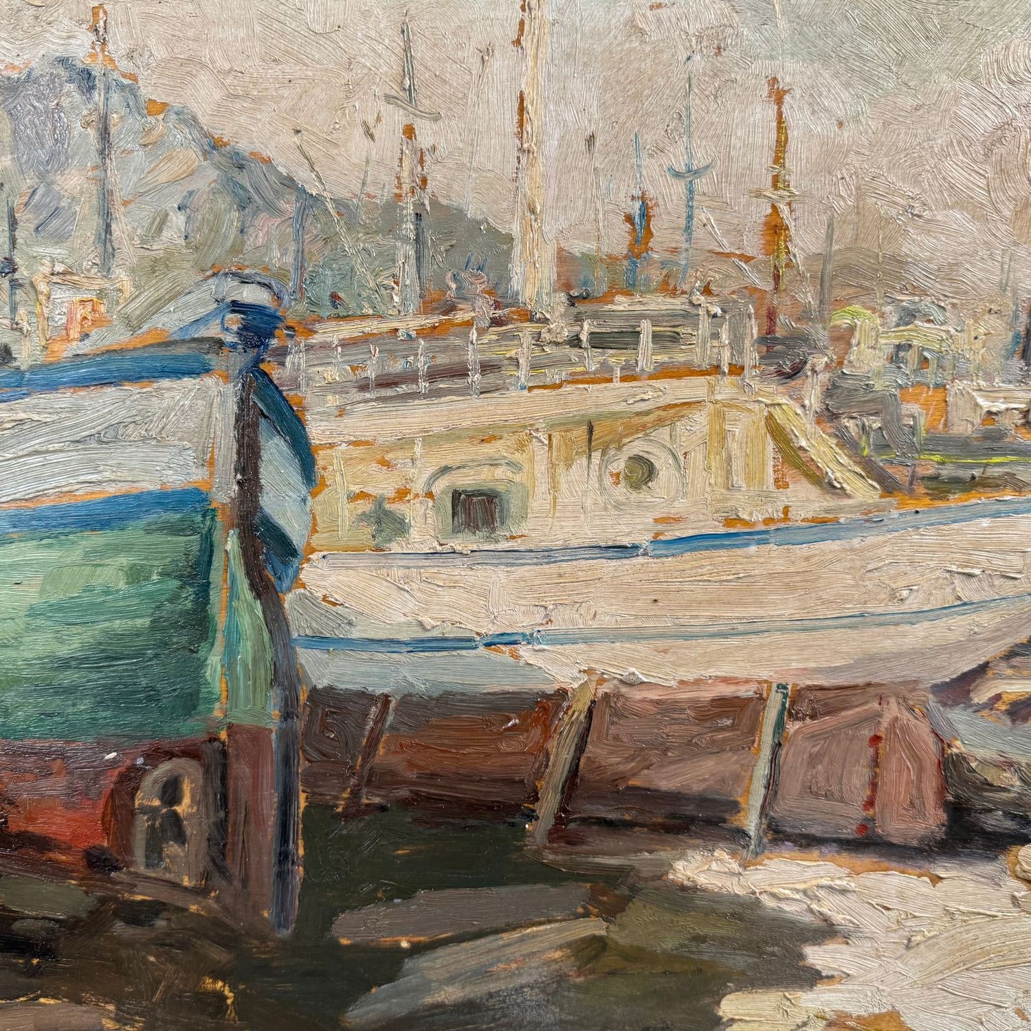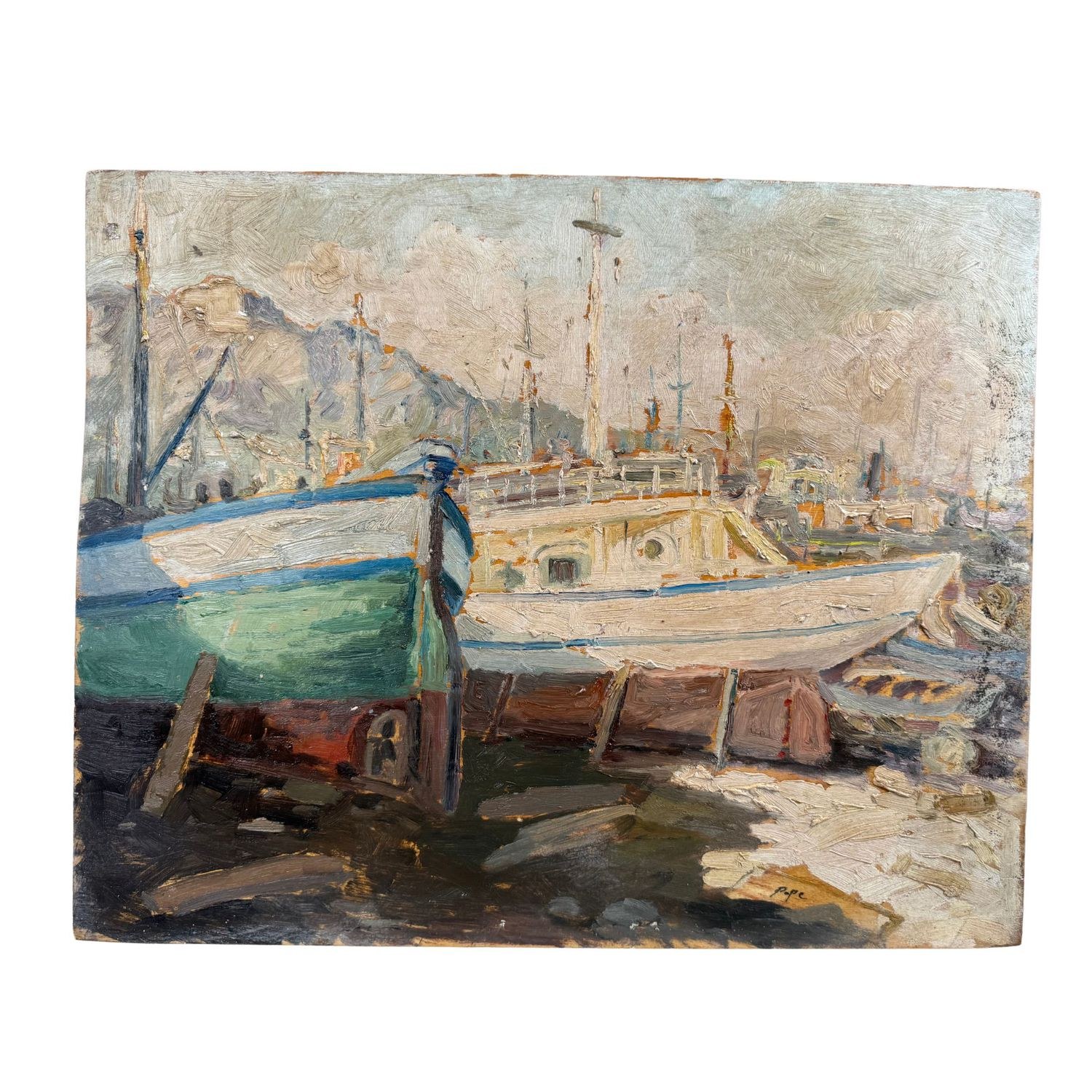 Oil painting on wood panel, 20th century, Italian school, depicting beached boats.