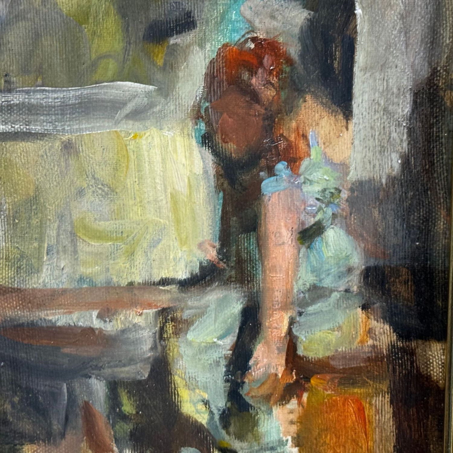 Oil painting on canvas, 20th century, impressionist artist, Italian school, depicting a portrait of a girl from behind.