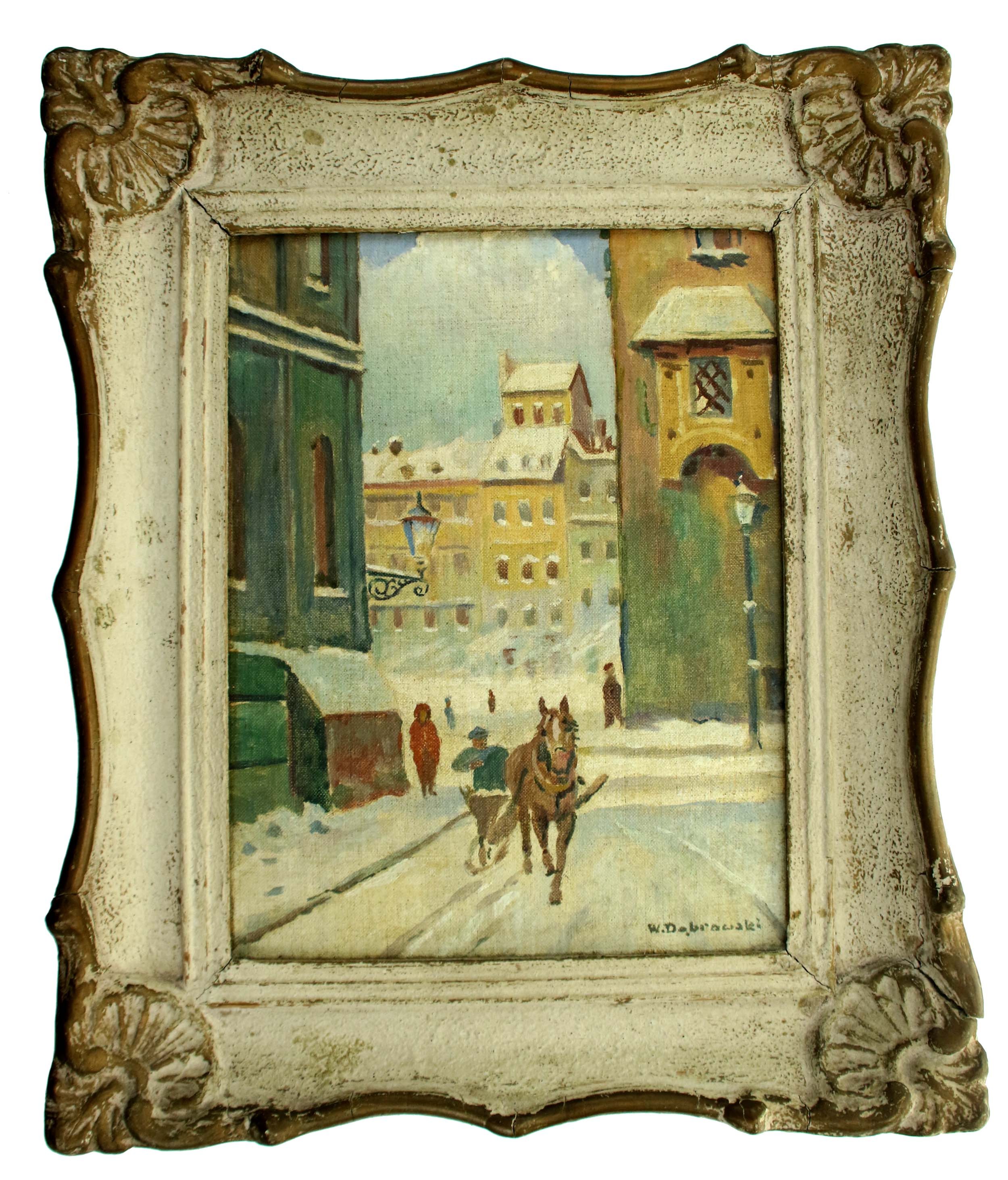 W. DĄBROWSKI - Starówka w Warszawie. Olej na sklejce. Wym. 32 x 24 cm, rama 46 x 38 cm.