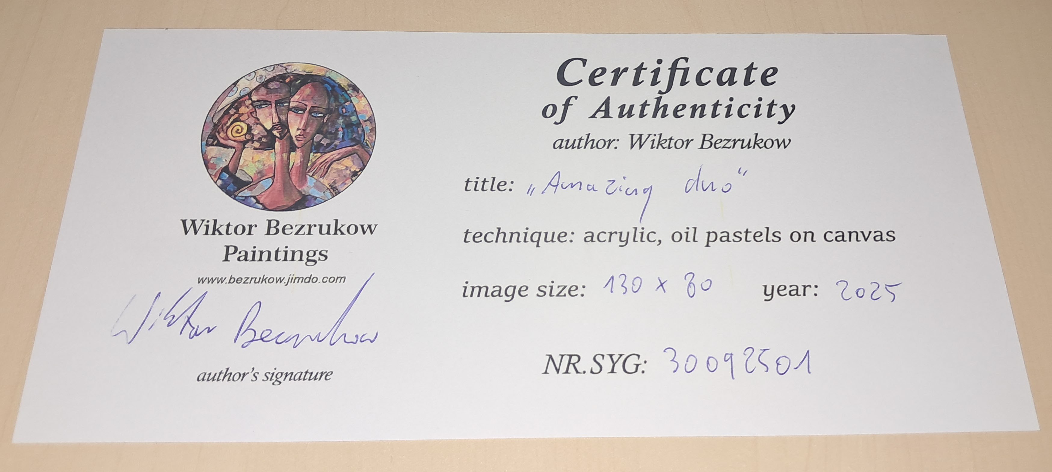 Dodatkowo obraz jest podpisany z tyłu przez autora - tytuł, podpis, rok, a także numer obrazu zgodny z numerem na certyfikacie.