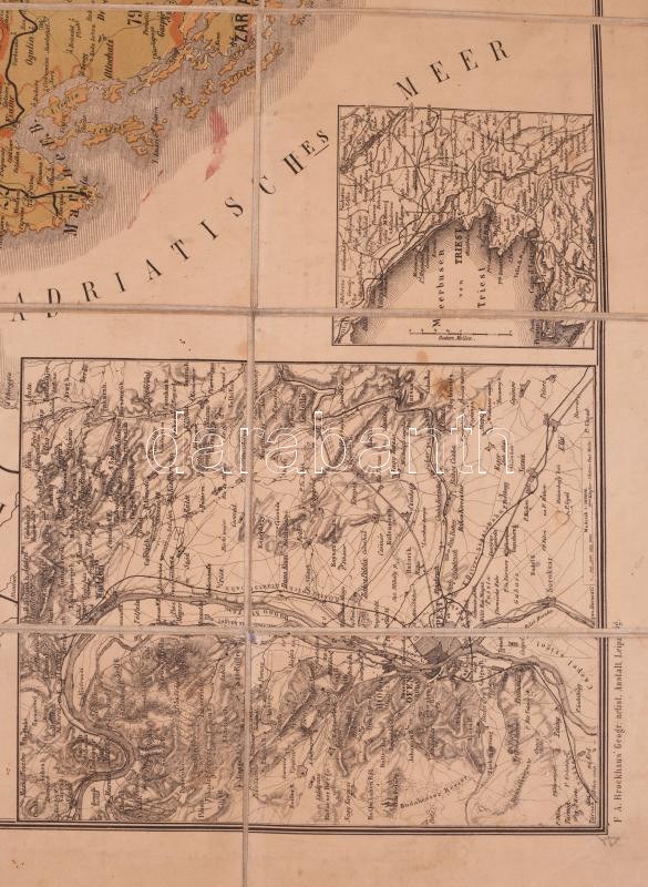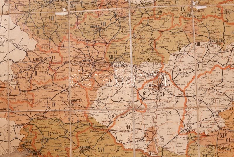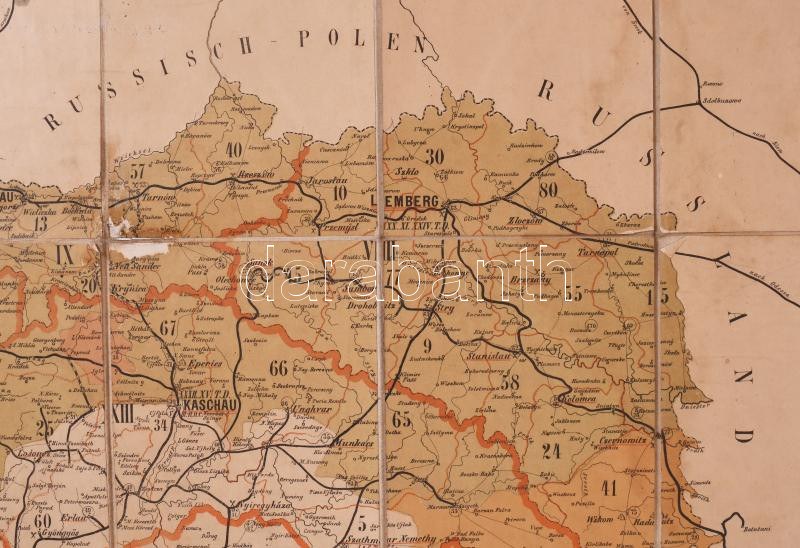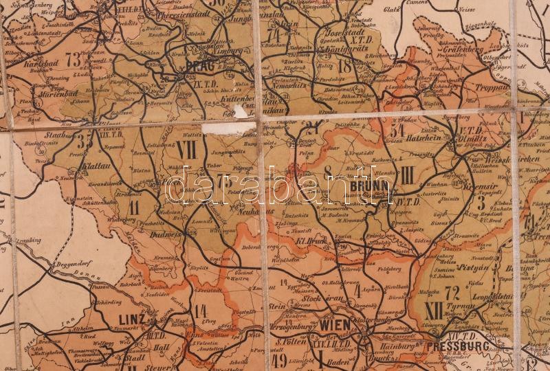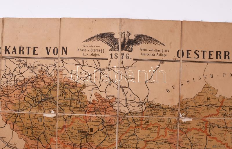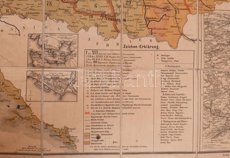 1876 K. K. Militärkarte von Oesterreich-Ungarn. Entworfen von Khoss v. Sternegg, K. K. Major. Fünfte vollstandig neu bearbeitete Auflage. Teschen, 1876., Verlag der Buchandlung für Militarliteratur von Karl Prochaska,(F. A. Brockhaus' Geogr.-artist. Anstalt.-ny.), nagyméretű színes, kőnyomatú térkép, vászonra kasírozva, foltos, a sarkain lyukakkal, a szelvényeken 4-5 helyen sérüléssel, 69x86 cm. Az Osztrák-Magyar Monarchia katonai térképe, rajta a XVI katonai parancsnokság, 6 kisebb méretű fekete-fehér térképe, (Bécs és környéke, Budapest és környéke, Prága és környéke, Trieszt, Pula, Fiume városok térképei), rajta a 80 katonai ezred állomáshely megjelölésével, vasútvonalak, laktanyák, várak, erődök, erődítmények, kastélyok, gátak, víztározók, hágók, átjárók, szorosok jelölésével. A katonai egységek nemzetiségek (szláv, német, magyar, román) szerinti feltüntetésével. Ritka!