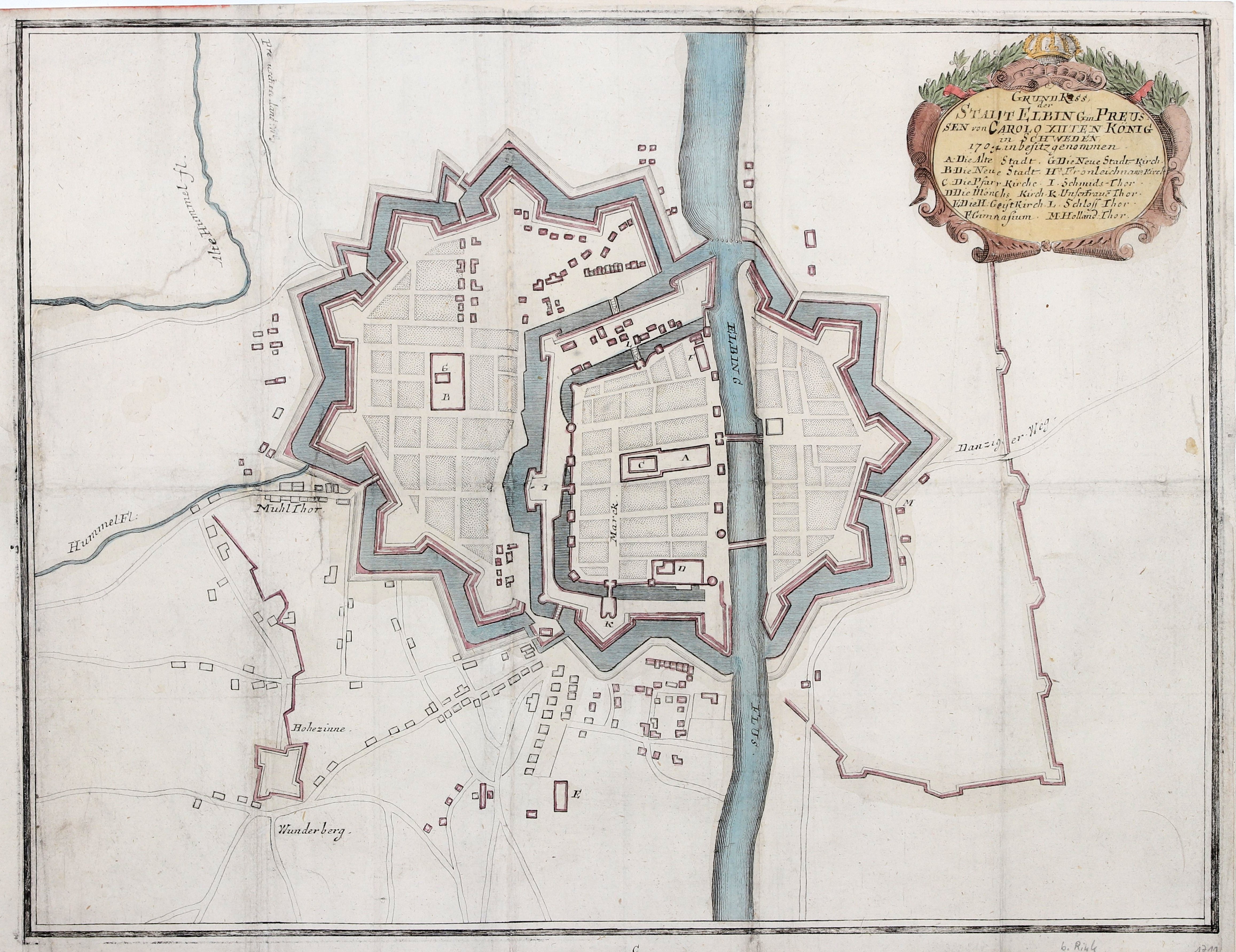ELBLĄG. Plan miasta i fortyfikacji w 1704 r., w czasie wojny północnej; anonim, 1711; miedz. kolor., st. bdb., drobne zabrudzenia i plamki; wym. płyty 390x300 mm; GRUND RISS der STADT ELBING in PREUSSEN von CAROLO XIITEN KÖNIG in SCHWEDEN 1704 in besitz genommen.