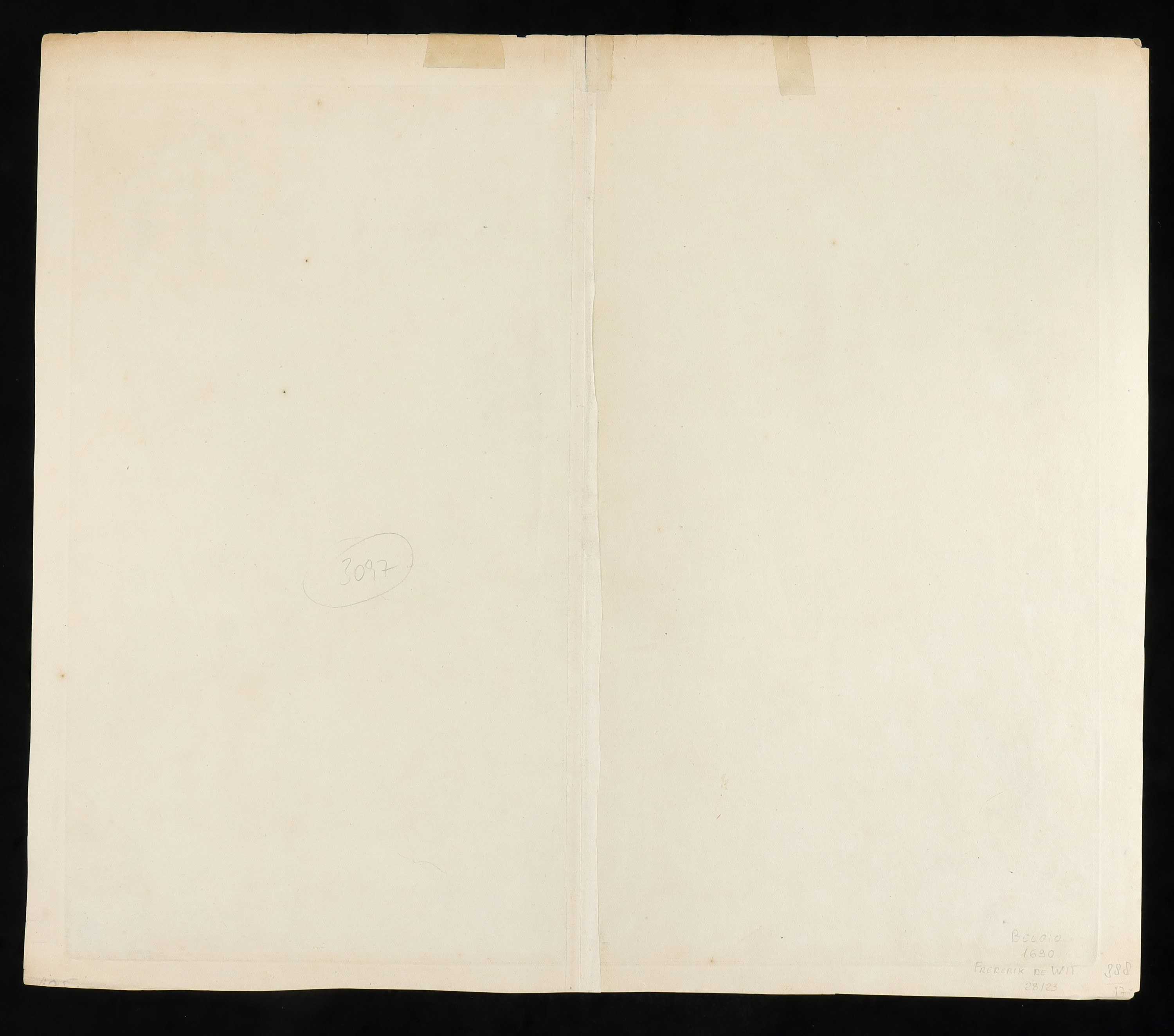 engraving and etching, 51.5 x 59.5 cm. Map of Belgium. Fine, fresh impression on two sheets of laid paper with watermark, joined together. Usual central fold. Nice coeval coloring. Very good condition except for very light oxidation along the upper edge.