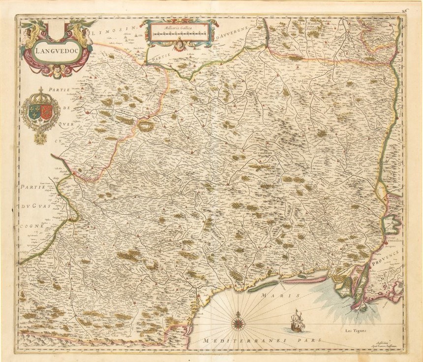 engraving and etching, 49 x 56 cm, map of Languedoc in southern France, printed on laid paper, with hand coloring. Nice impression. Sheet in very good condition, with the usual central fold, slight stains on the lower margin. With frame, glass and passe-partout (70x 80 x 3 cm). The print has not been examined out of frame.