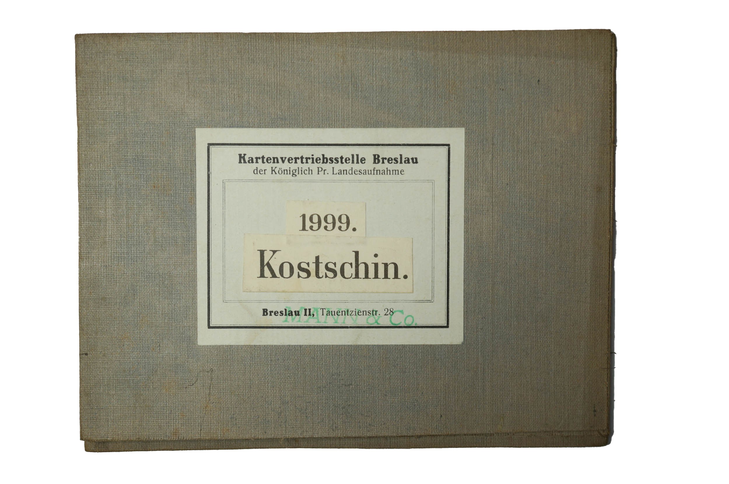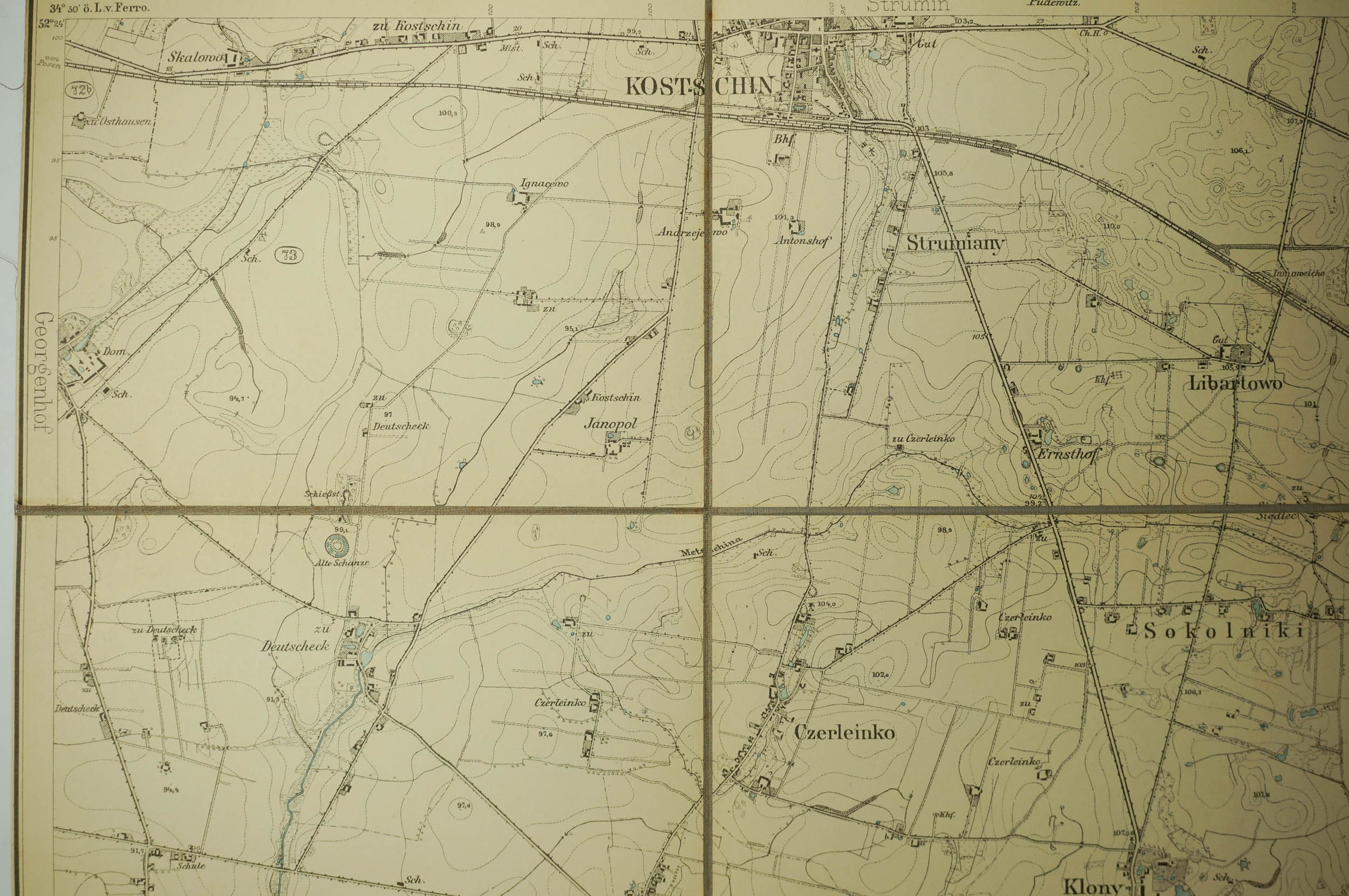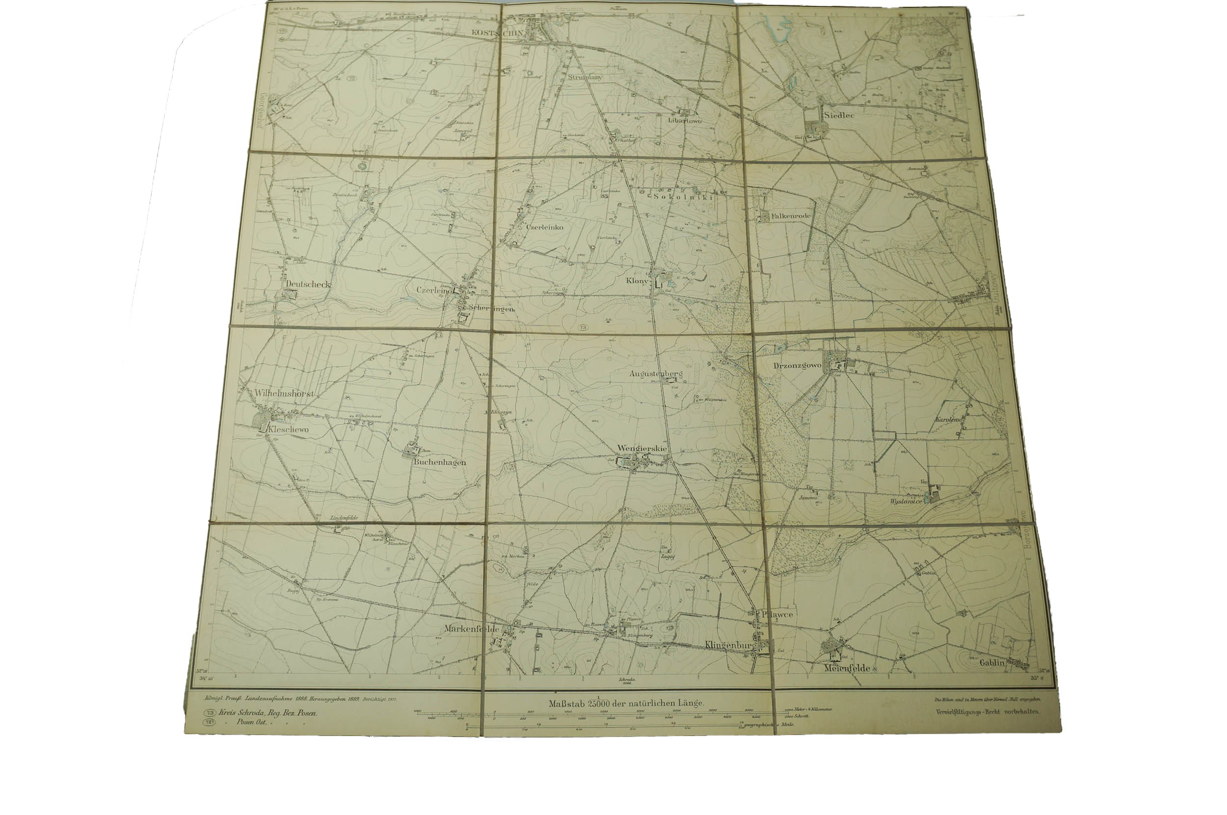 KOSTRZYN / Kostschin - mapa na płótnie [1911r.], skala 1: 25.000.f. 47,5 x 49cm, na podstawie mapy z 1888r. z poprawkami z 1911 roku