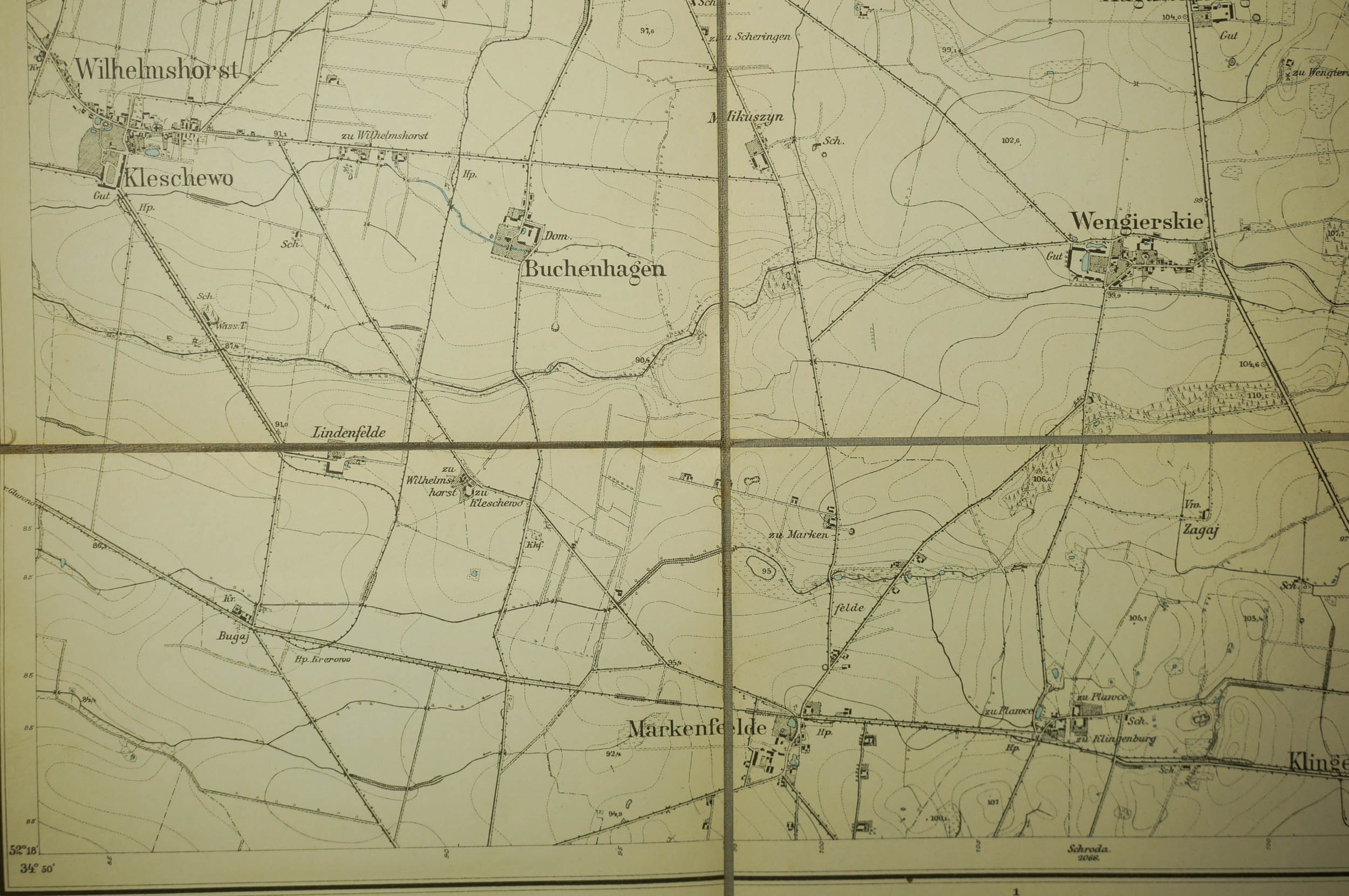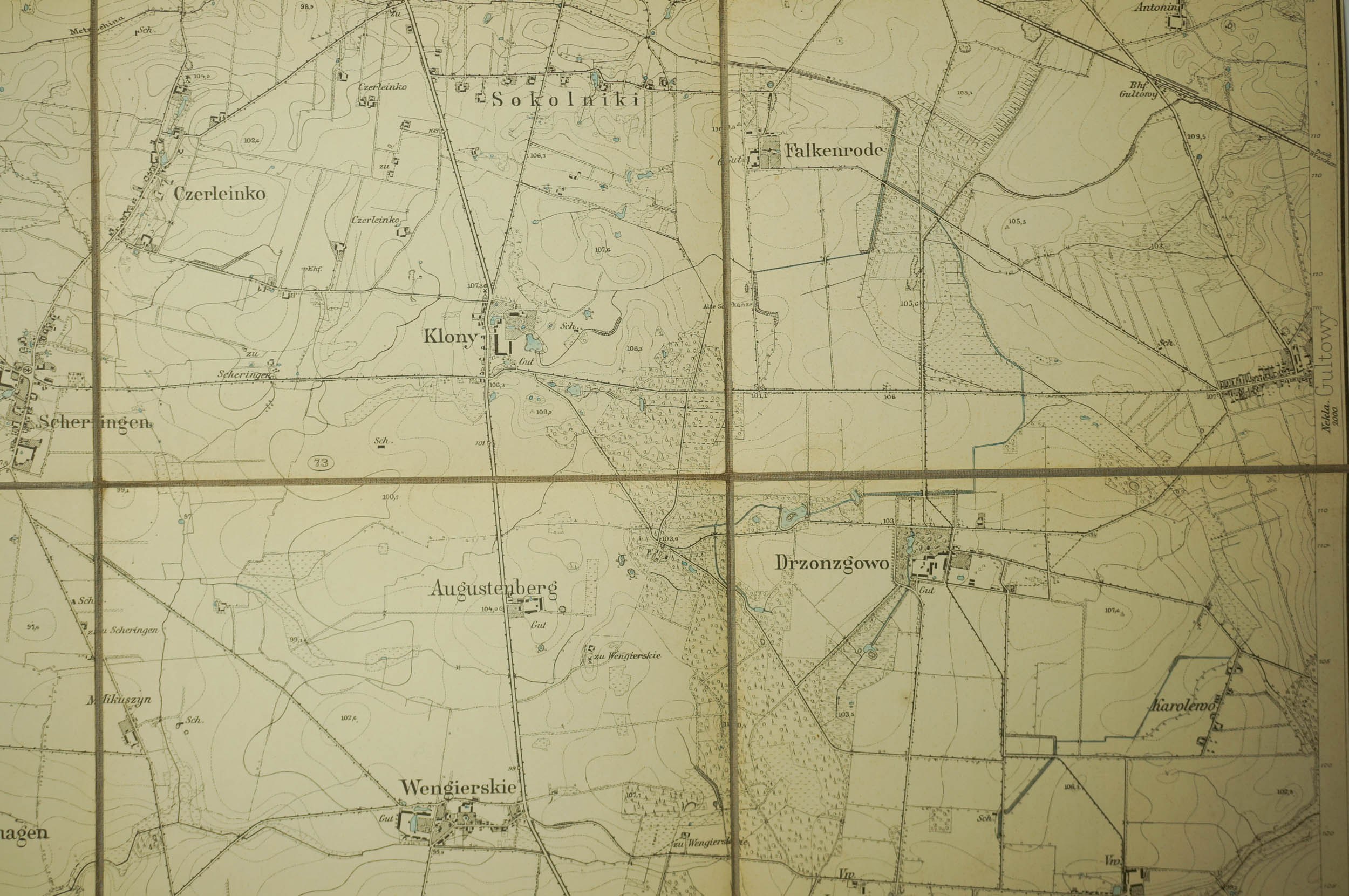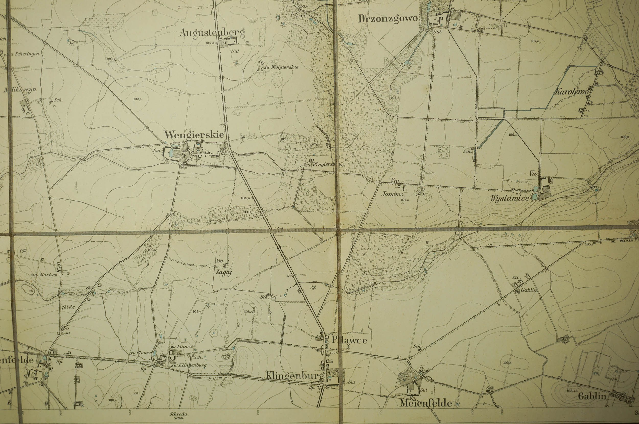 KOSTRZYN / Kostschin - mapa na płótnie [1911r.], skala 1: 25.000.f. 47,5 x 49cm, na podstawie mapy z 1888r. z poprawkami z 1911 roku