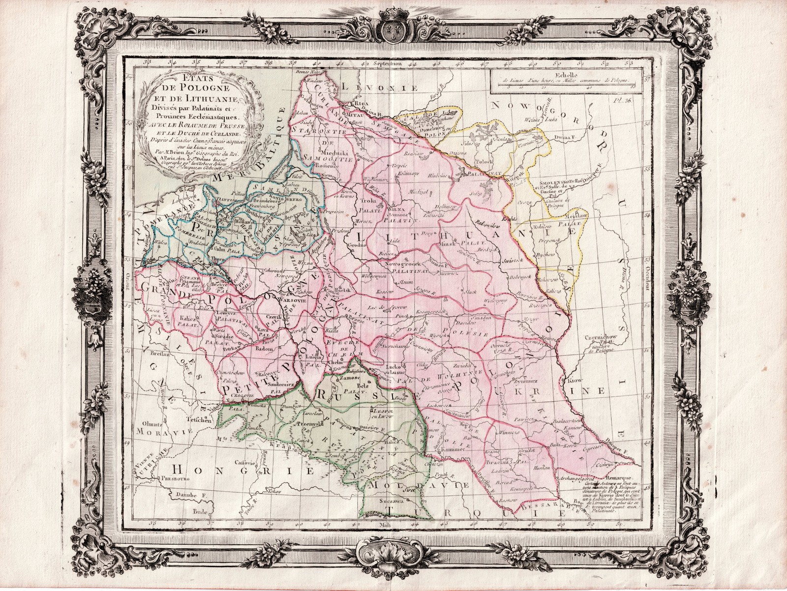 Etats de Pologne et de Lithuanie, divisés par Palatinats et Provinces Ecclesiastiques. Avec le Roiaume de Prusse et le Duché de Curlande. D’après d’exactes connaissances acquises sur les lieux mêmes. Par Mr. Brion, Ingr. Géographe du Roi. A Paris, Chez le Sr. Desnos, Ingénieur Géographe por. les Globes et Sphéres. ruë St. Jacques au Globe. 1766