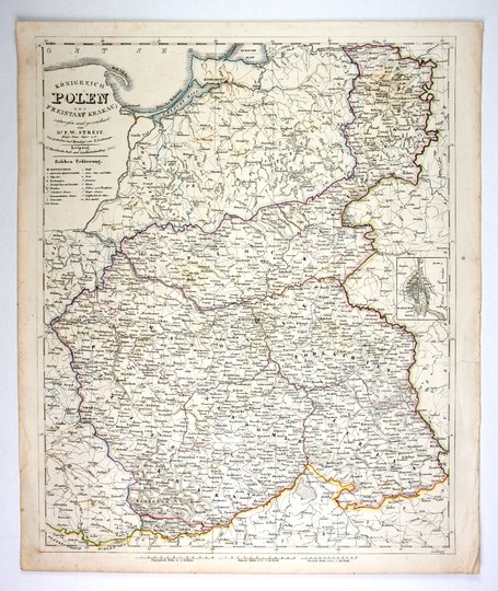 Mapa przeglądowa Królestwa Polskiego opracowana przez F. W. Streita, wydana w Lipsku w 1843 przez J. C. Hinricha. Płytę rytował H. Leutemann. Tytuł w lewym górnym narożniku, tamże dane wydawnicze i legenda. Na dolnym marginesie trzy podziałki liniowe. Przy prawej krawędzi niewielki poboczny plan Warszawy. Zaznaczono granice 8 guberni i Wolnego Miasta Krakowa. Kolor liniowy. Załamania prawego narożnika, podklejone niewielkie naddarcie krawędzi.