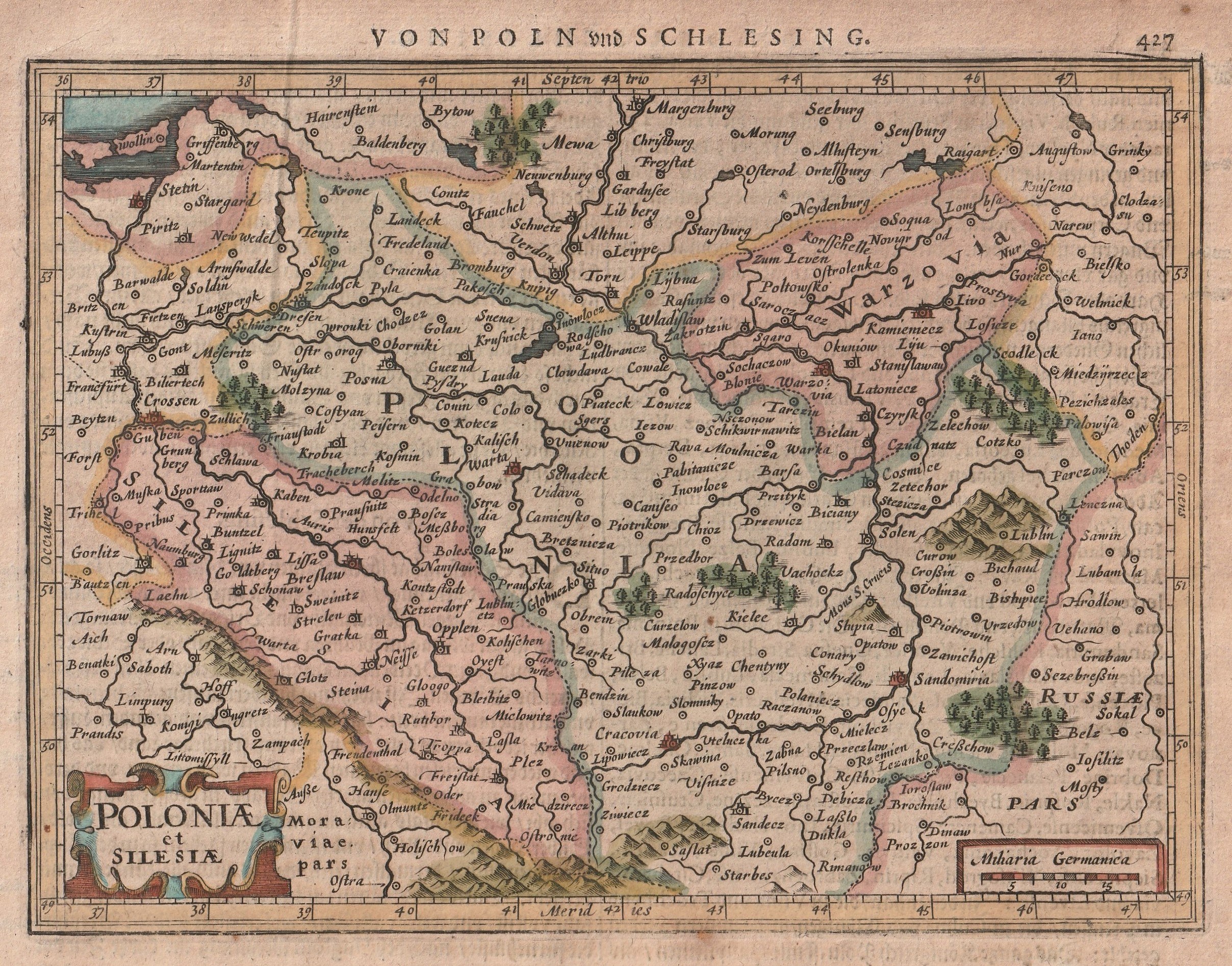 POLSKA (zwana w I RP KORONĄ), ŚLĄSK. Mapa Polski i Śląska; na podstawie mapy Mercatora, pochodzi z: Atlas Minor, wyd. J. Janssonius, Amsterdam 1628–1651 (inna edycja niż powyżej); nad górną ramką: VON POLN und SCHLESING; na verso tekst w jęz. niem.: VON DER SCHLESING […]; miedz. kolor., st. bdb.; wym. płyty 199x148 mm; POLONIAE et SILESIAE; [Imago Poloniae K76/1].