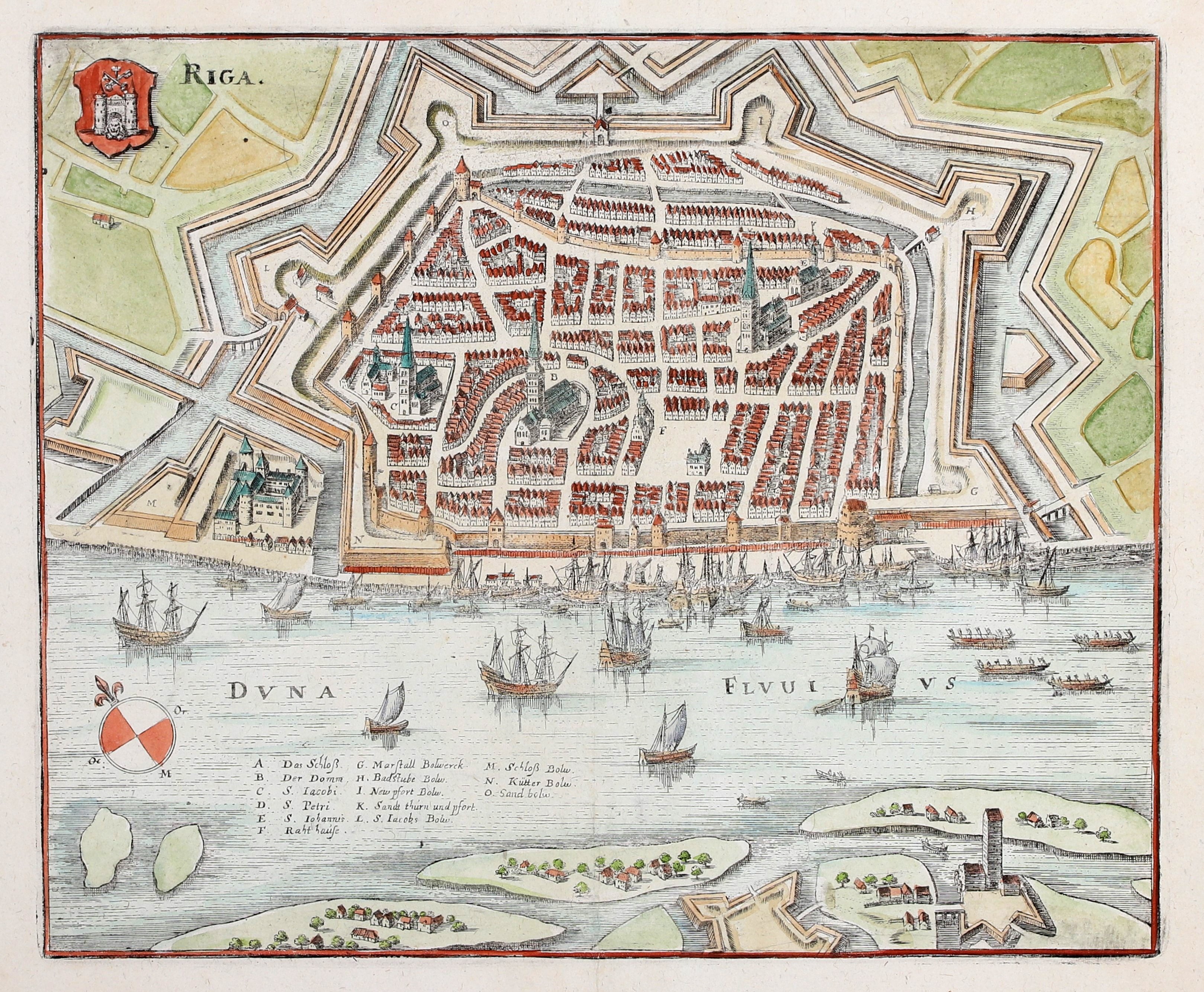 RYGA (łot. Rīga). Widok miasta z lotu ptaka; M. Merian, pochodzi z: M. Zeiller, Topographia Electoratus Brandenburgici et Ducatus Pomeraniae […], 1652; miedz. kolor., st. bdb., minimalne naddarcia; wym. płyty 267x220 mm; RIGA; [Von Danzig 293].
