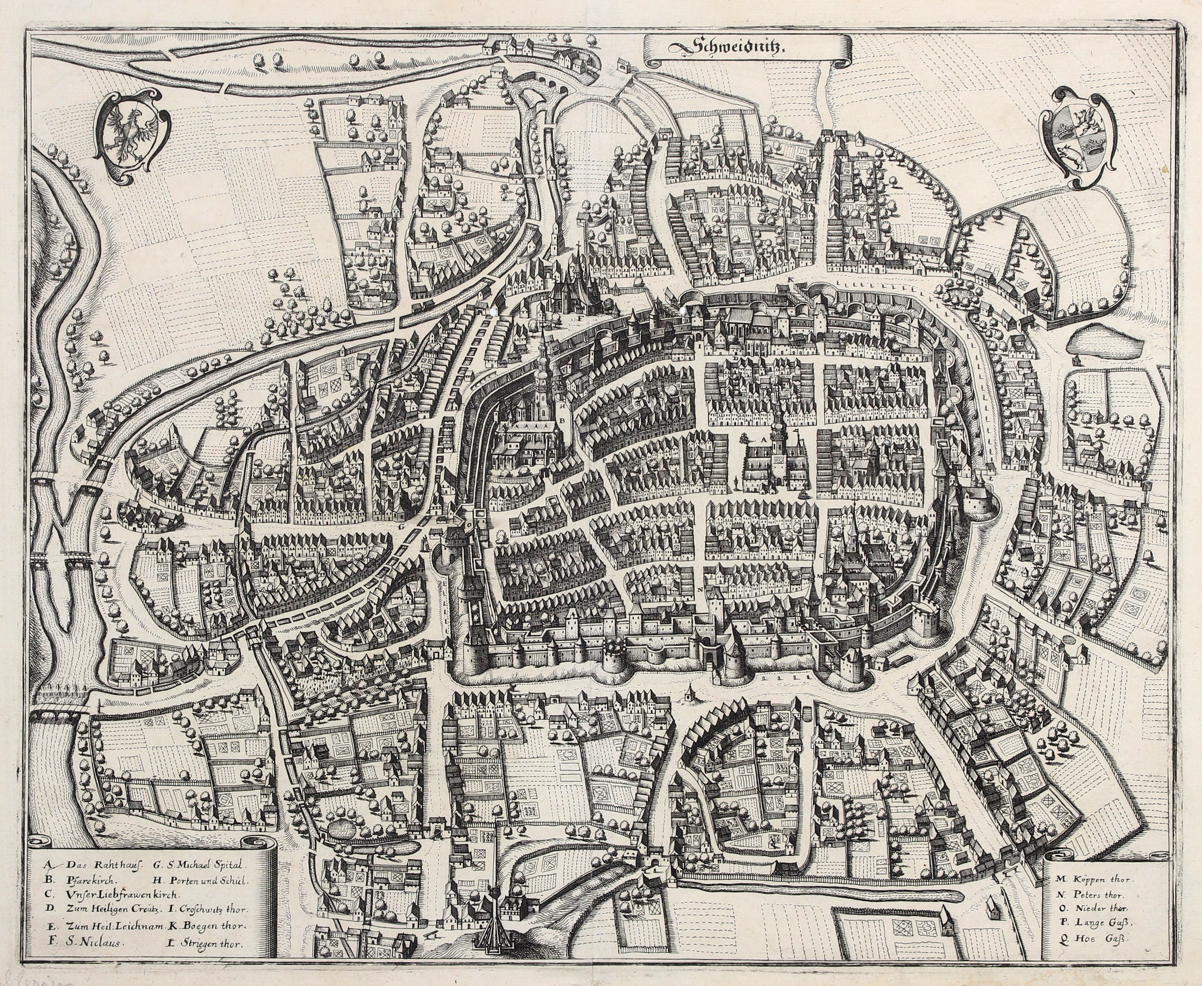 ŚWIDNICA. Widok miasta z lotu ptaka; pochodzi z: Theatrum Europaeum, wyd. M. Merian, ok. 1640; w narożnikach dwa herby i legenda; miedz. cz.-b., st. bdb., w centralnej części perforacja; wym. płyty 348x284 mm; Schweidnitz.