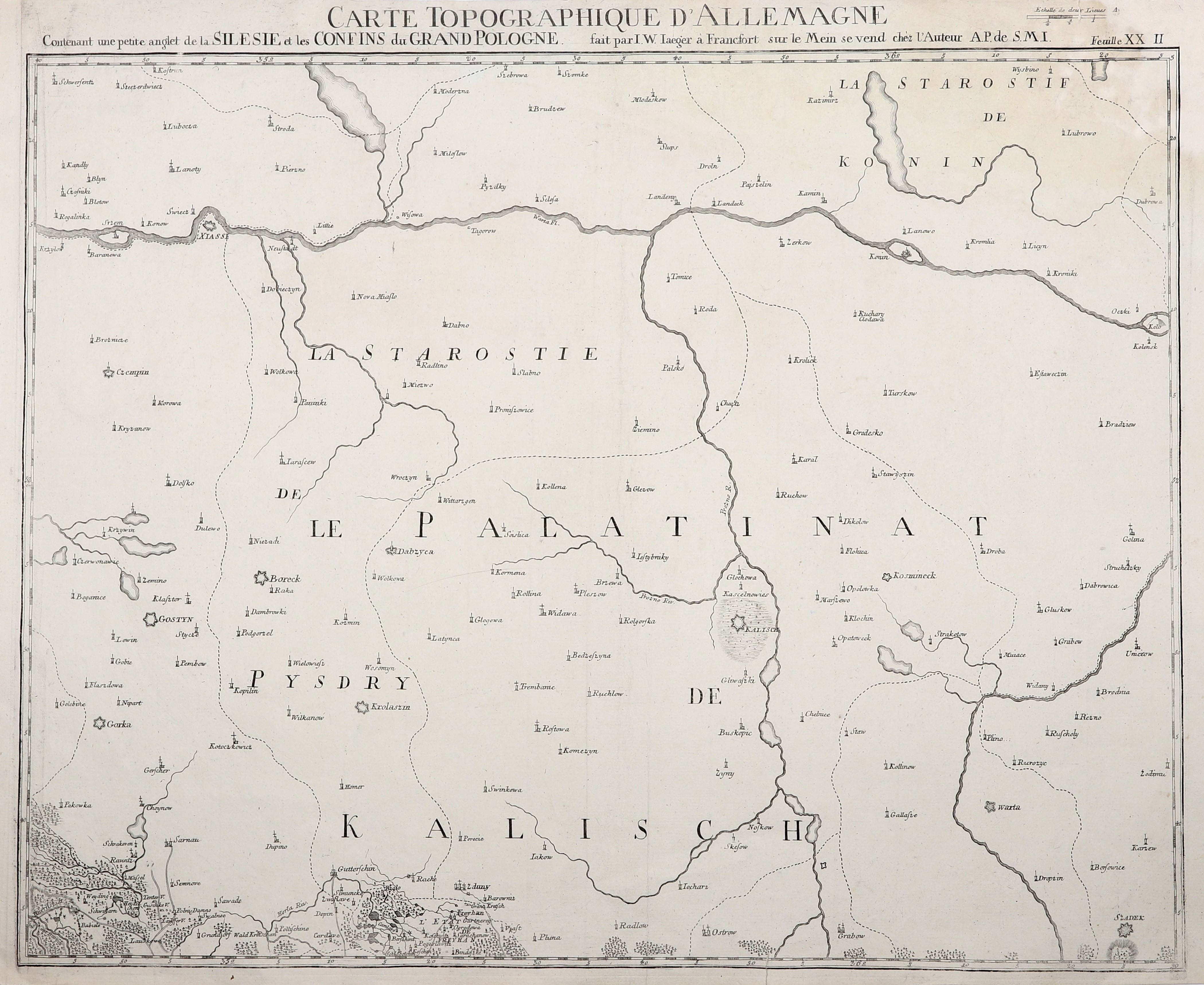 WIELKOPOLSKA. Mapa woj. kaliskiego; wyd. J.W.A. Jäger w kompilacyjnym wydawnictwie Grand Atlas d’Allemagne en LXXXI Feullies [...], 1789; filigrany; miedz. cz.-b., st. bdb., minimalne naddarcia krawędzi, fachowo uzupełniony prawy górny narożnik; wym. mapy 588x464 mm; CARTE TOPOGRAPHIQUE D’ALLEMAGNE Contenant une petite anglet de la SILESIAE et les CONFINS du GRAND POLOGNE [...].