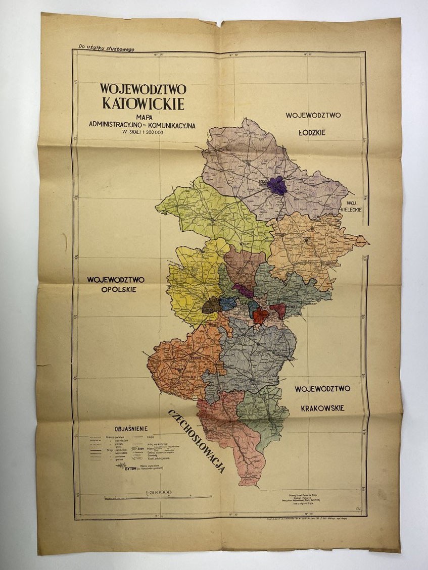 Województwo Katowickie Mapa Administracyjno-Komunikacyjna, Główny Urząd Pomiarów Kraju Wydział Pomiarów, stan z stycznia 1951, wymiary 55 x 82 cm, stan bardzo dobry.