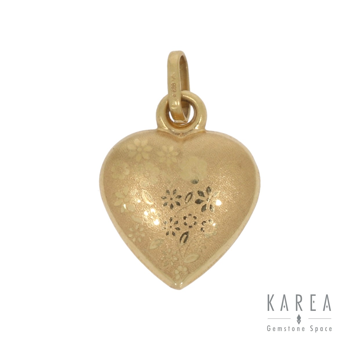 złoto pr. 0,750, częściowo satynowane, grawerowane motywy kwiatowe, wymiary: 2,5 x 1,3 cm z zawiesiem, masa: 0,76 g