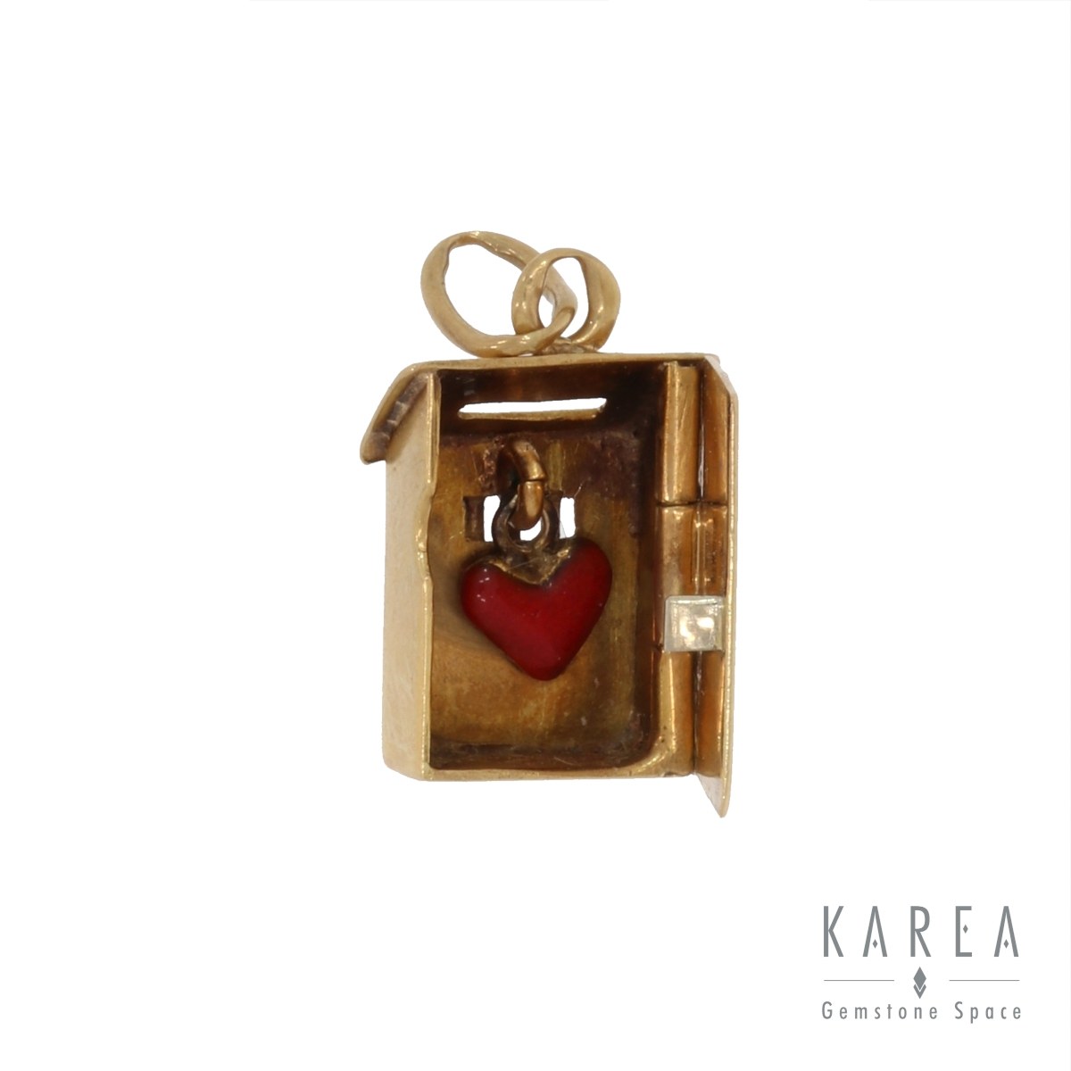 żółte i białe złoto brak pr., napis: "LETTRES", otwierany, wewnątrz serduszko pokryte czerwoną emalią, wymiary: 1,2 x 0,9 cm, długość z zawiesiem: 2 cm, masa: 2,20 g