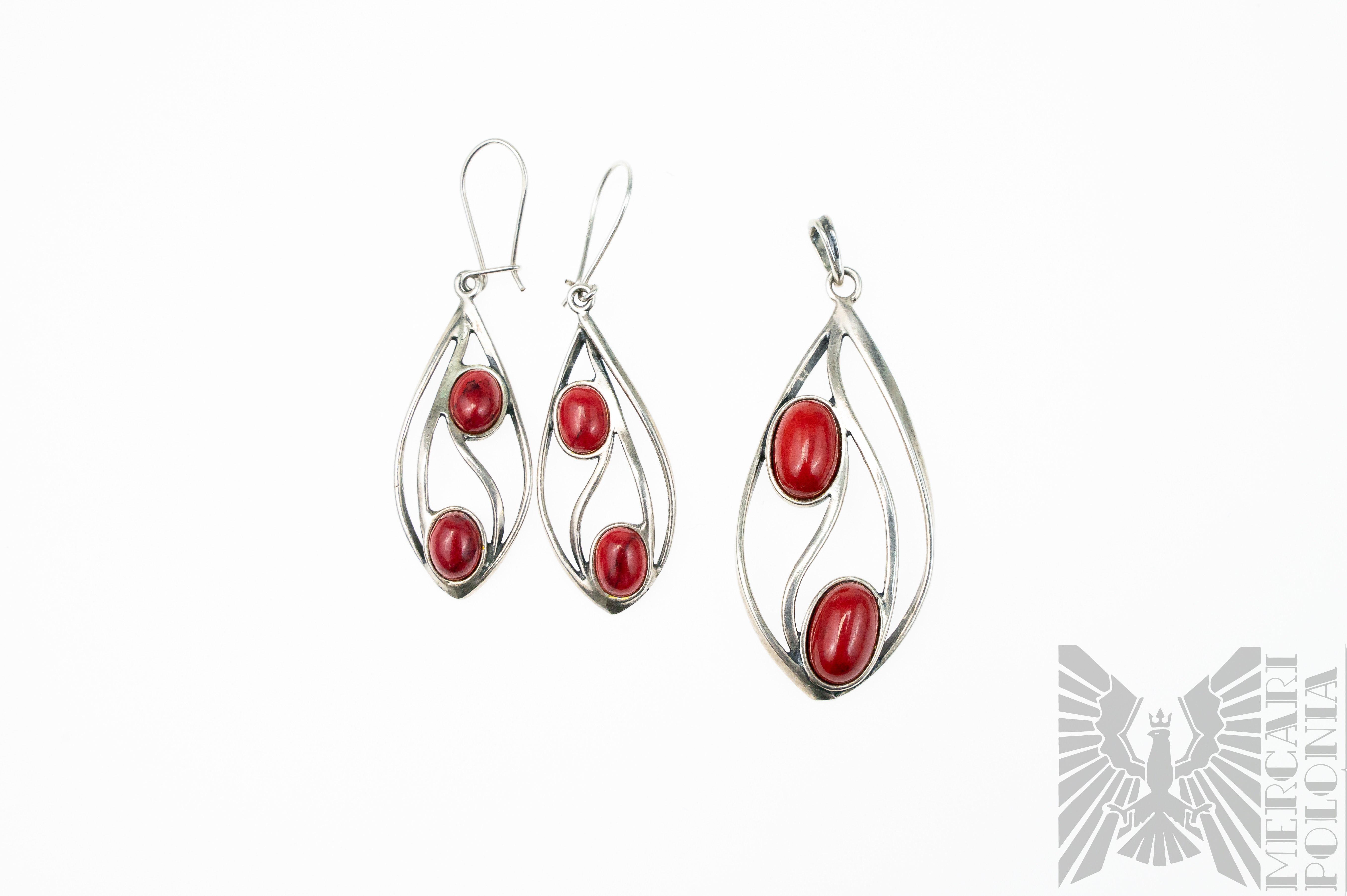 Komplet z Rodonitem składający się z Wisiorka oraz Kolczyków, Srebro 925, masa kompletu 11.83 gram, wymiary Wisiorka 51x23 mm, zapięcia Kolczyków Sztyft, wymiary Kolczyków 39x16 mm, ocechowane w Gdańsku po 1986 roku