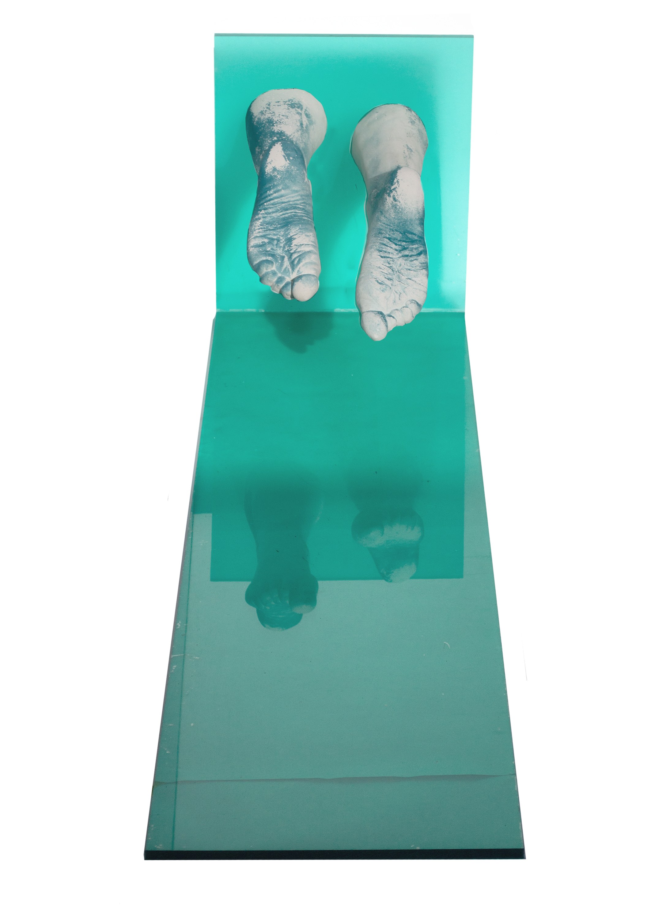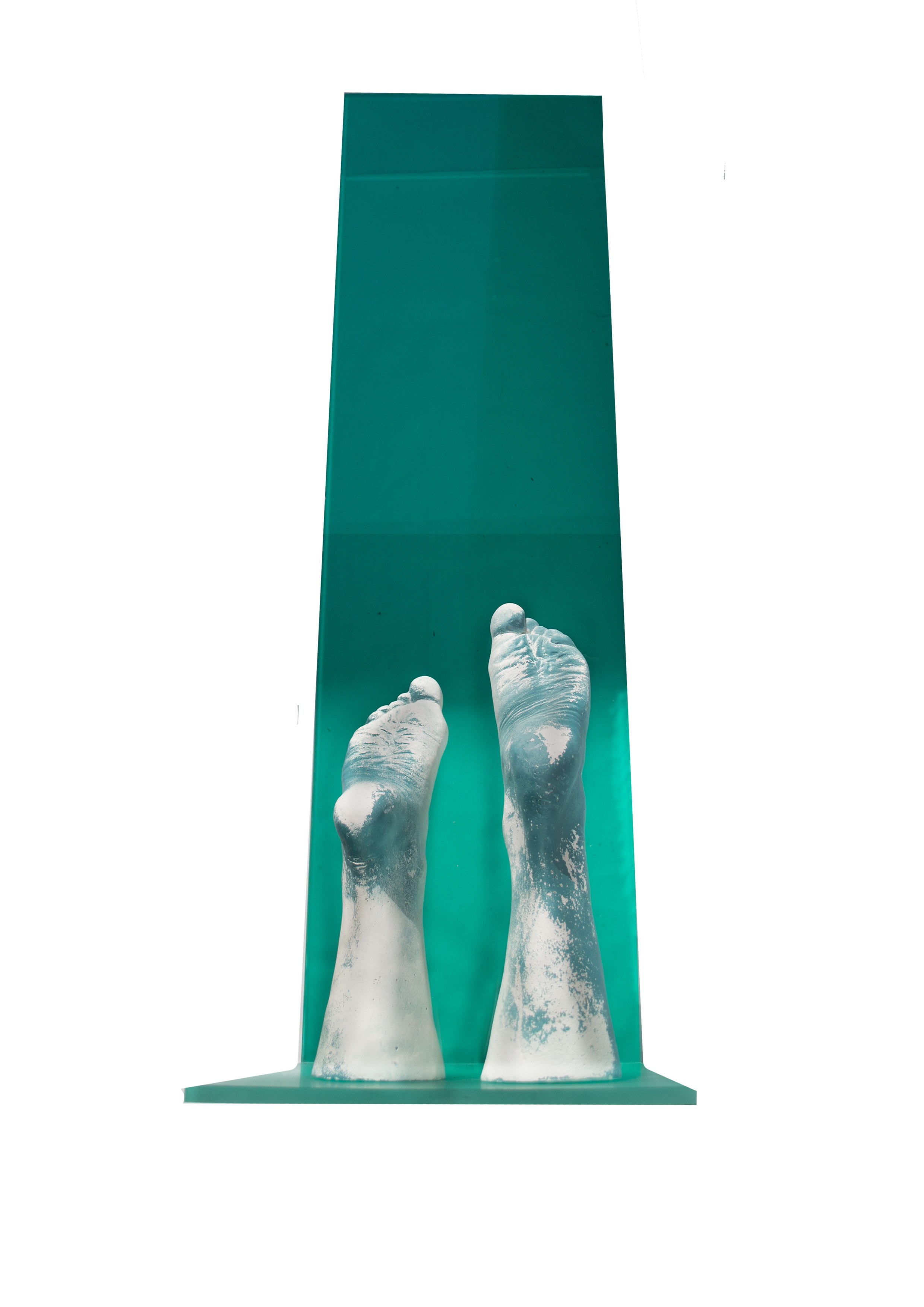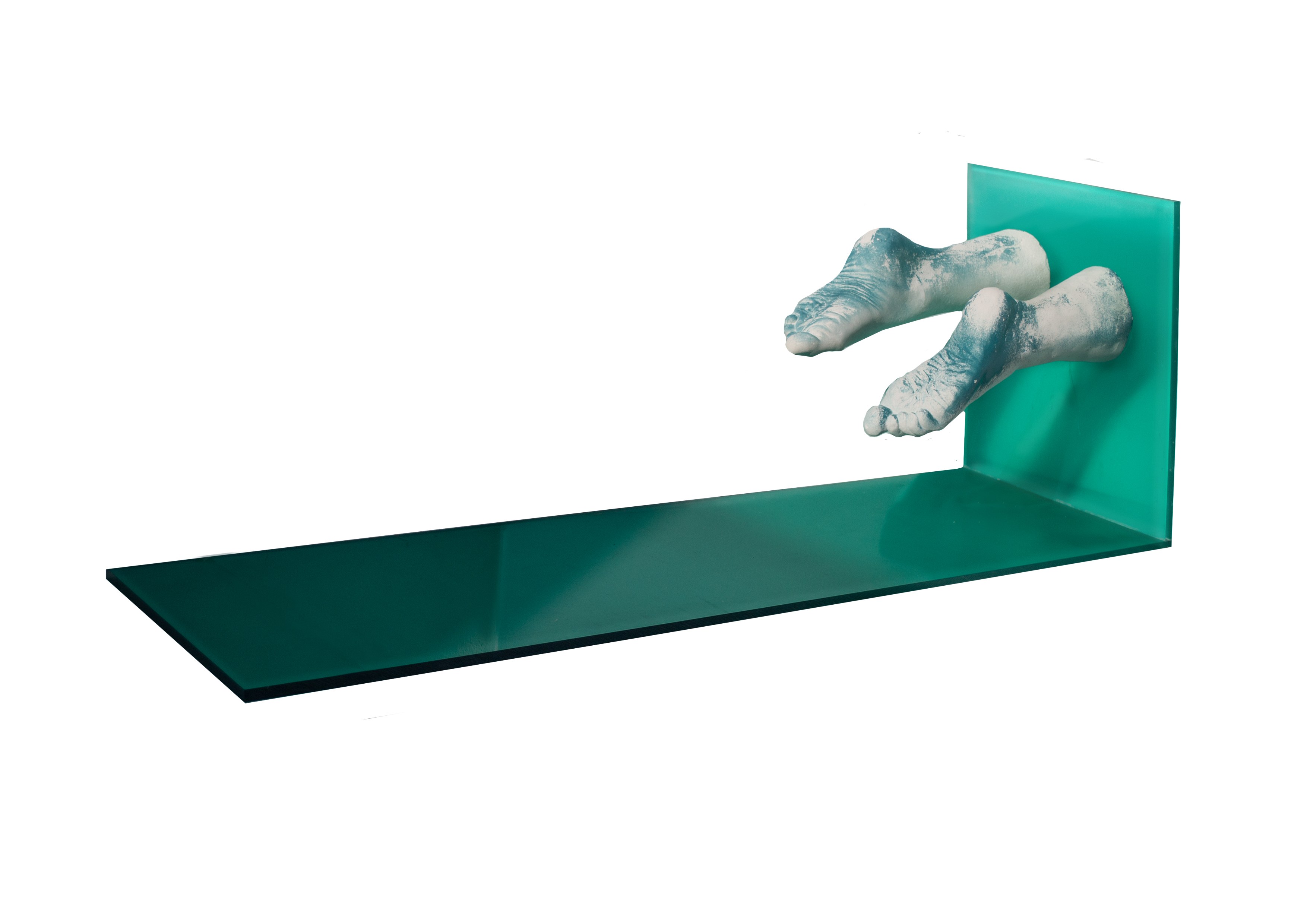 odlew gipsowy na stelażu z piaskowanego pleksi, farba w sprayu, 36 x 100 cm, sygnatura – inicjały (A.S), ryt w pleksi ok. 0,5 cm, na tylnej części