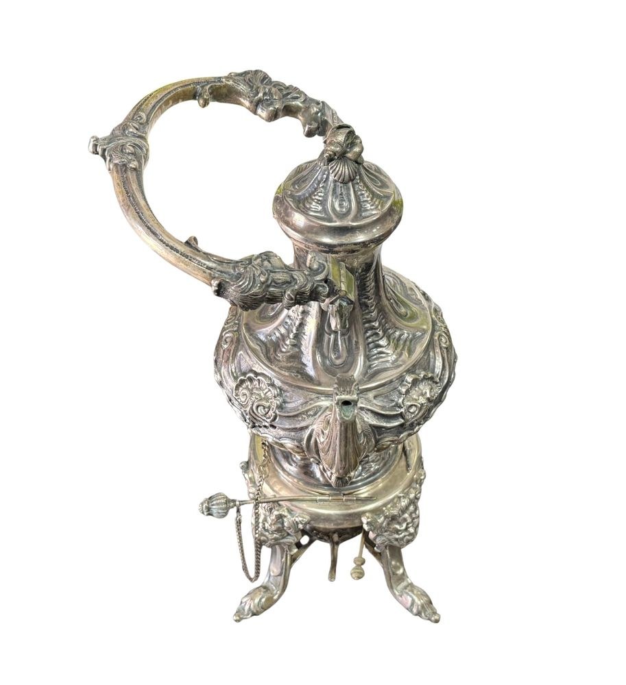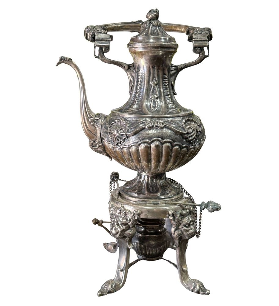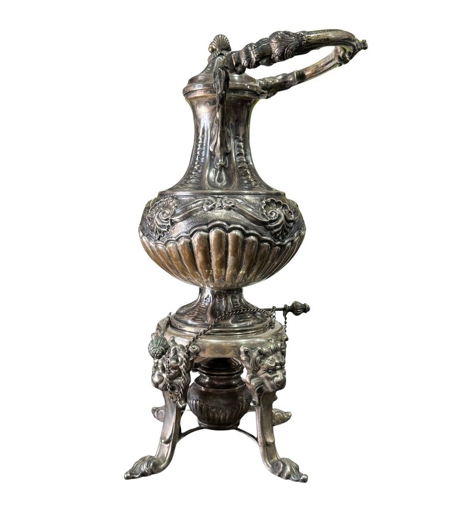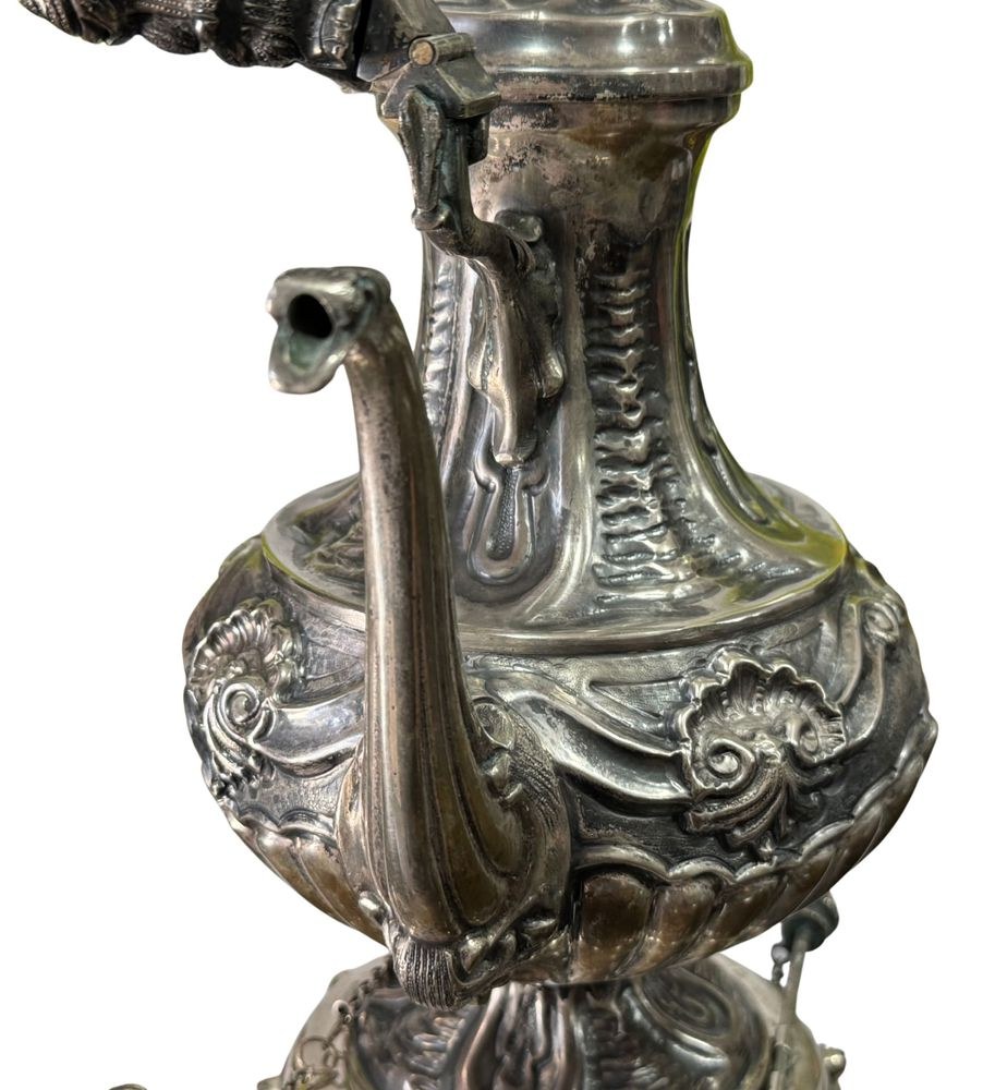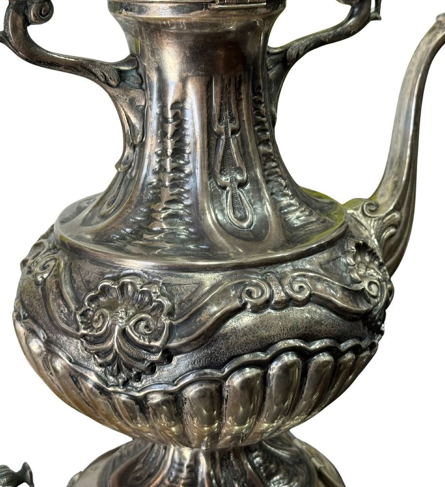 Antique decorative samovar in silver-plated metal, traditionally used to heat water or tea. 19th/20th century. Dimensions: h51x25x18 cm. In good condition.