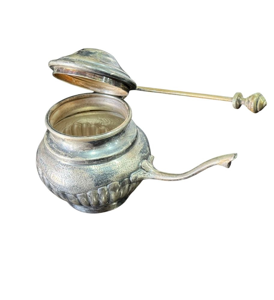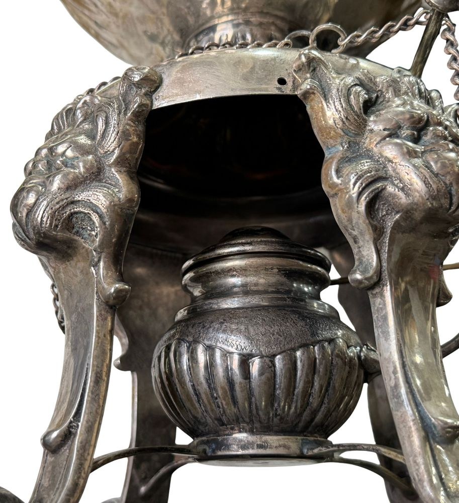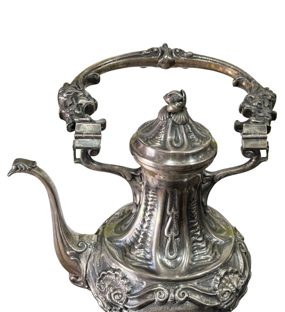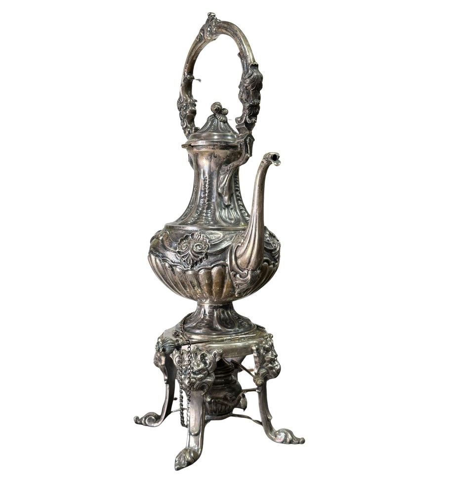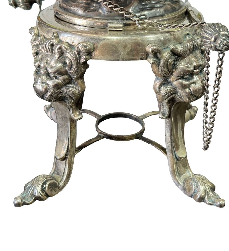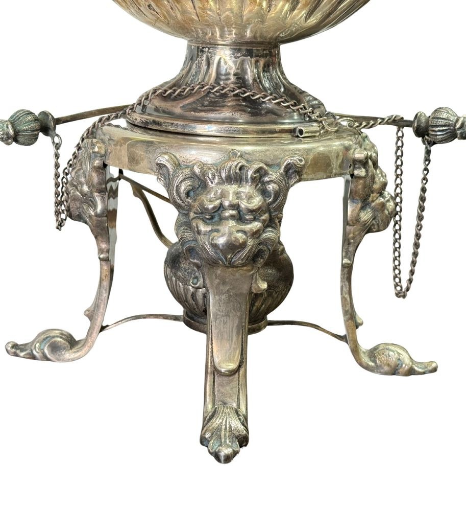 Antique decorative samovar in silver-plated metal, traditionally used to heat water or tea. 19th/20th century. Dimensions: h51x25x18 cm. In good condition.