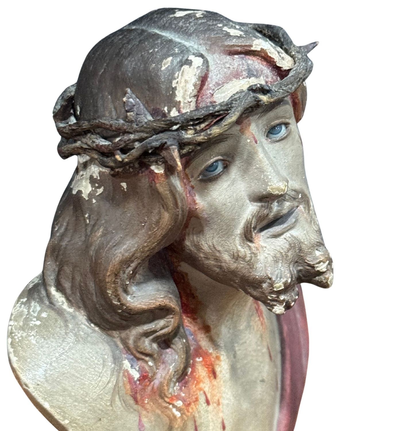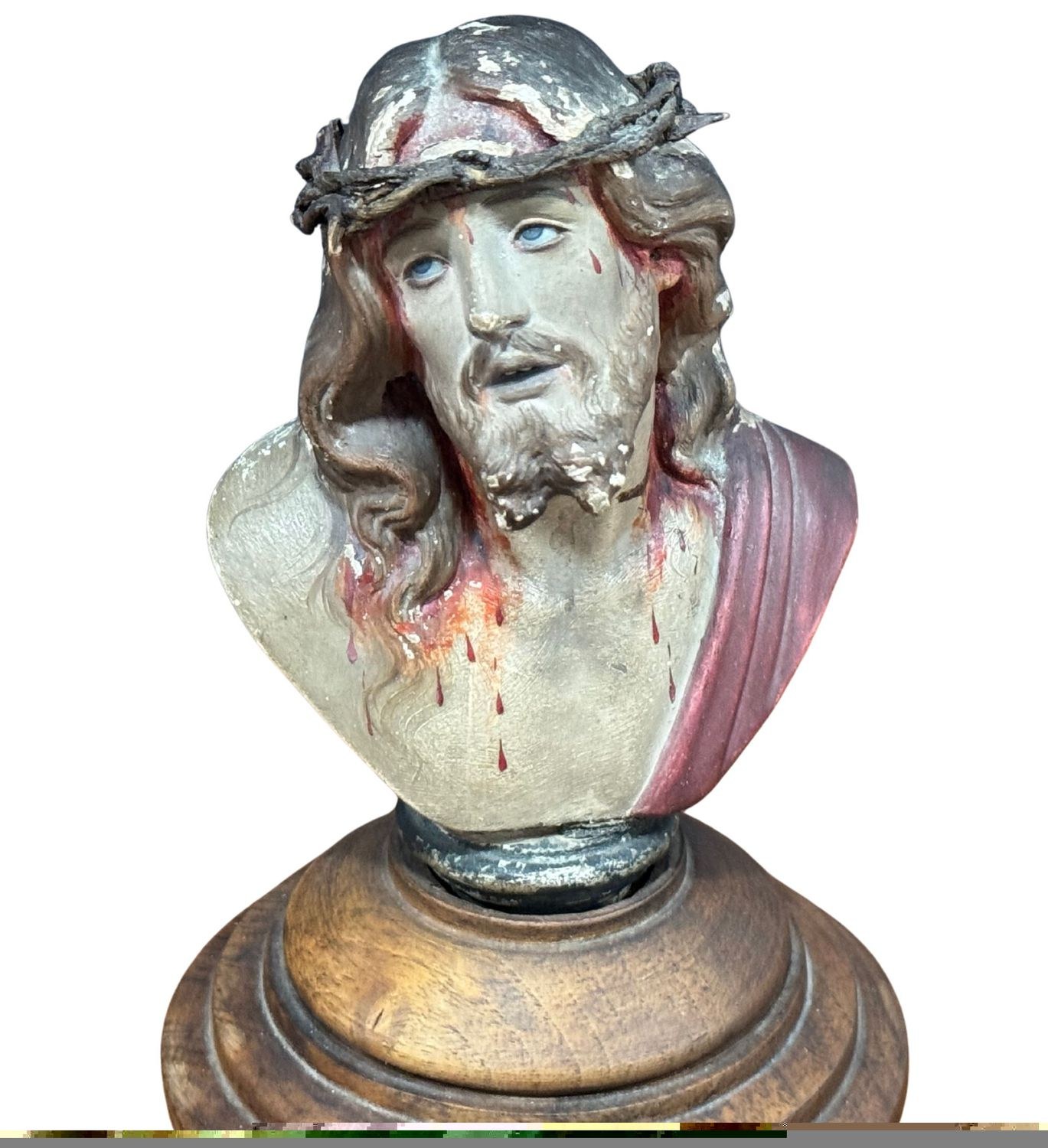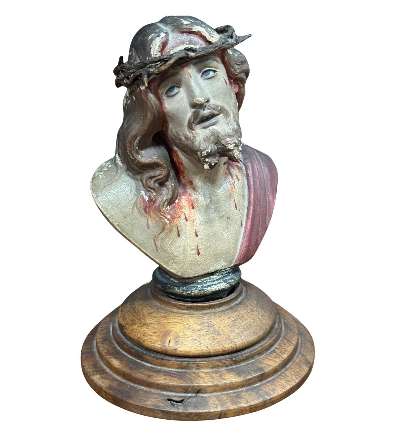 Polychrome terracotta Ecce Homo sculpture, resting on a wooden base, 20th-century period. Glass eyes. Dimensions: 18x12x12 cm. In good condition with minor signs of wear, as shown in the attached photos.