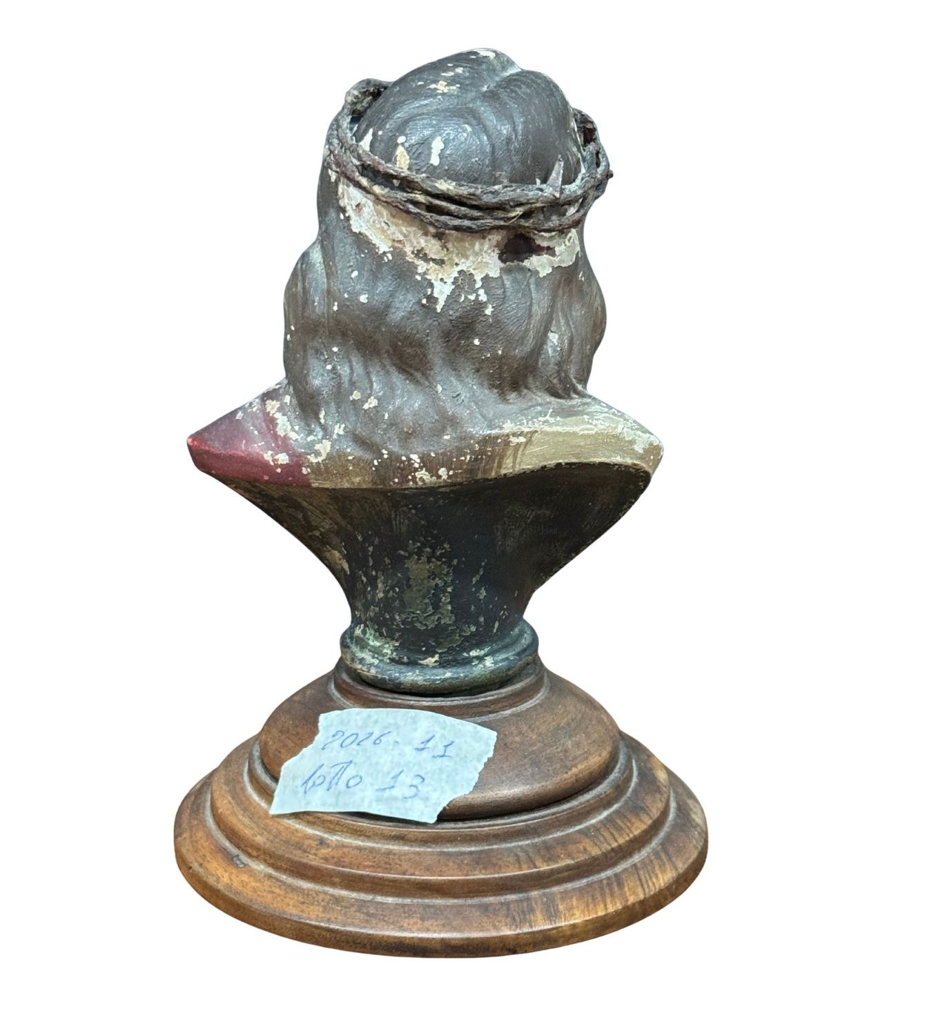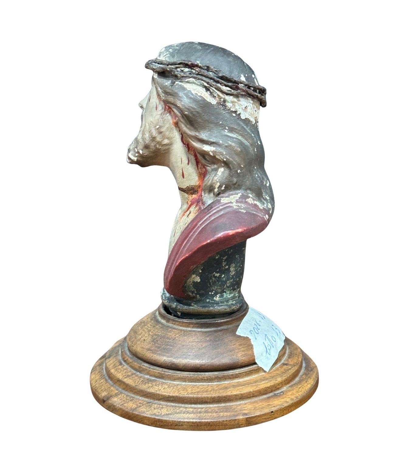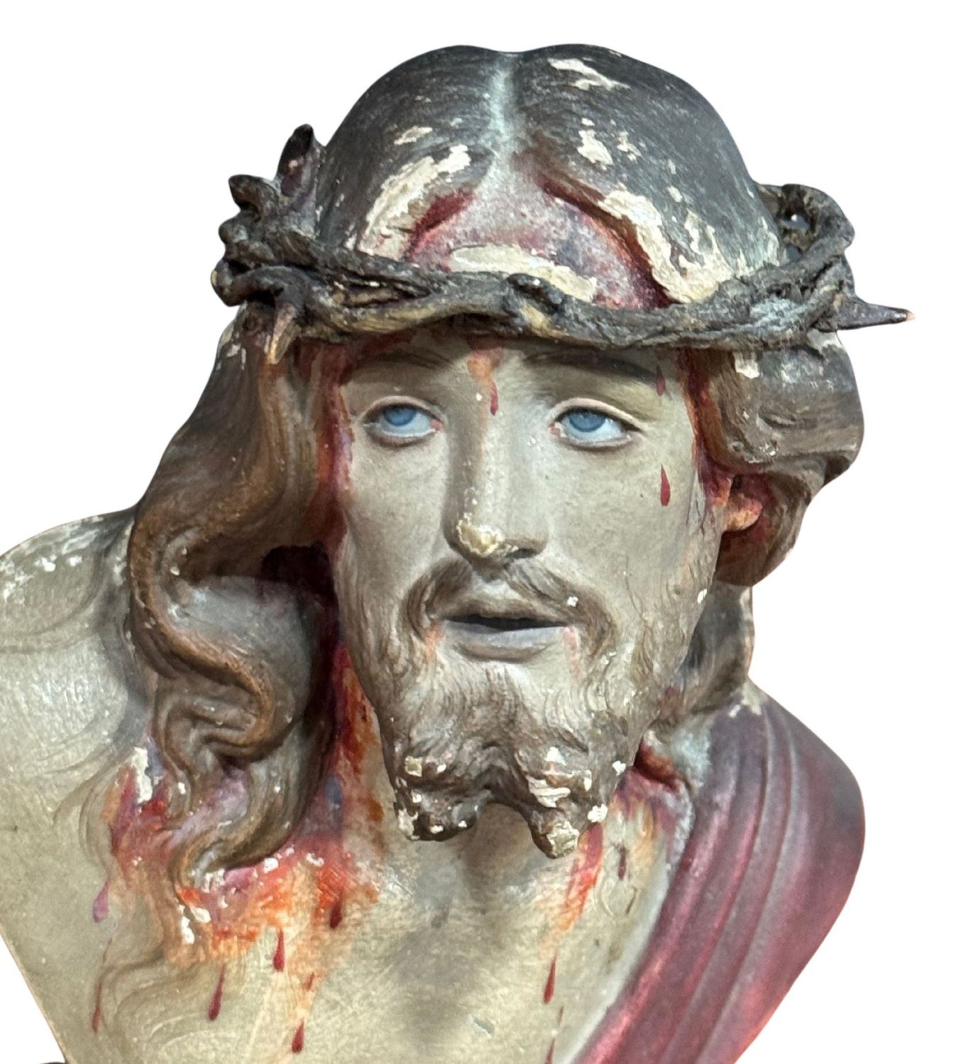 Polychrome terracotta Ecce Homo sculpture, resting on a wooden base, 20th-century period. Glass eyes. Dimensions: 18x12x12 cm. In good condition with minor signs of wear, as shown in the attached photos.