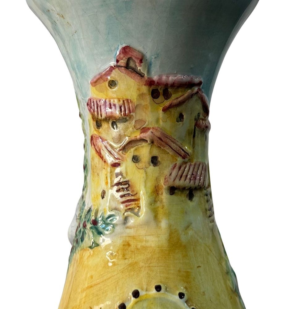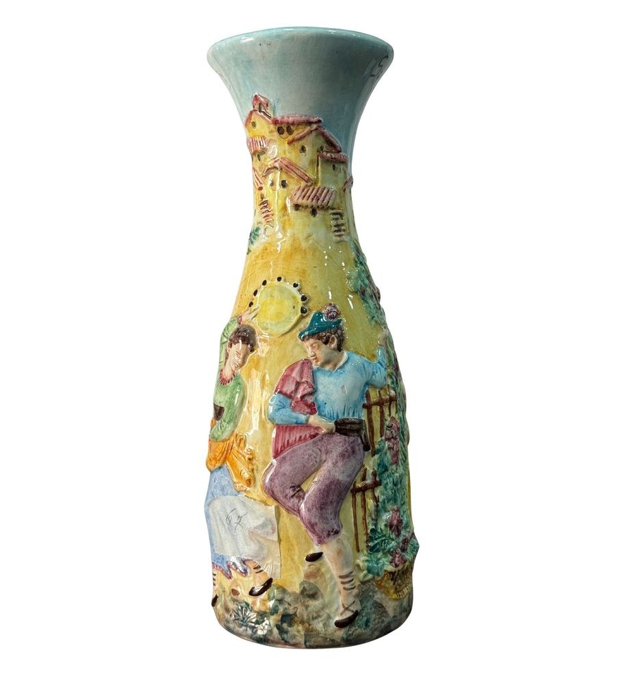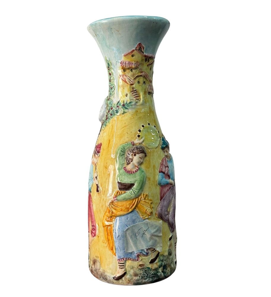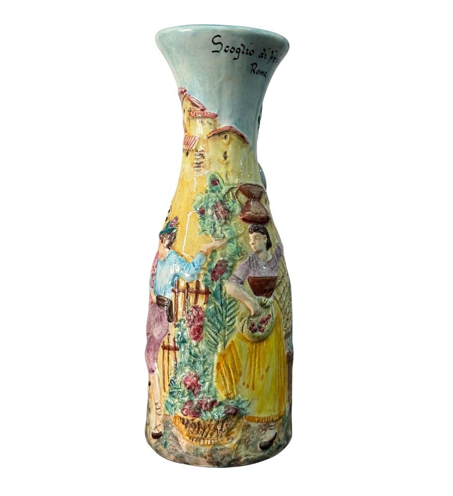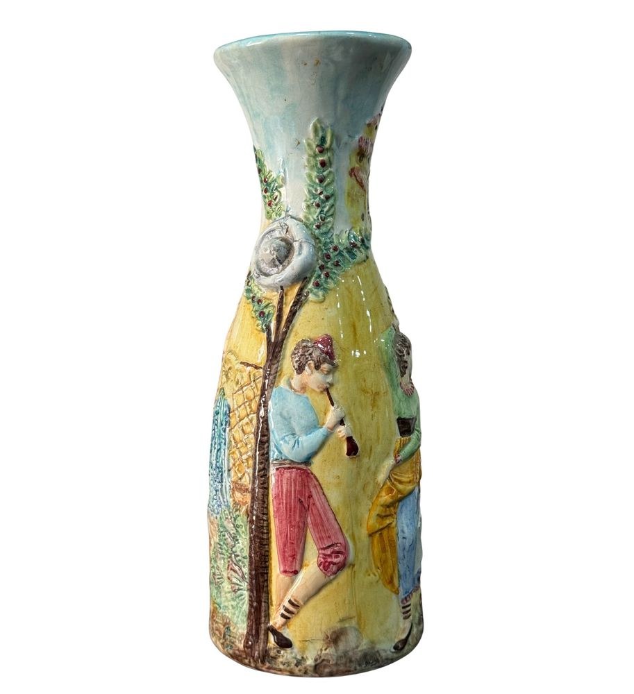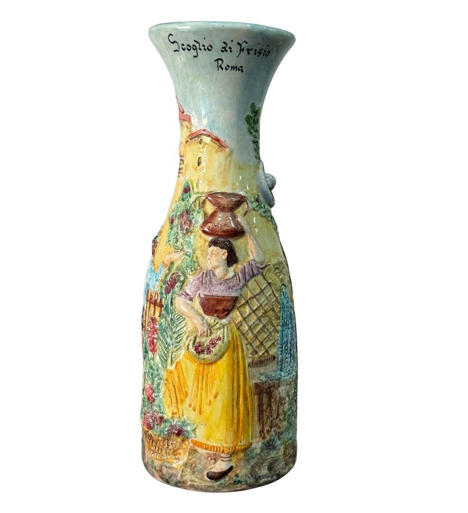 Glazed ceramic vase, 20th century, depicting figures. Inscribed at the top: *Lo Scoglio di Frisio*. Dimensions: 33 x 12 x 12 cm. The piece is in good condition.
