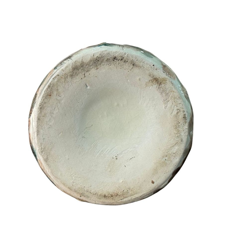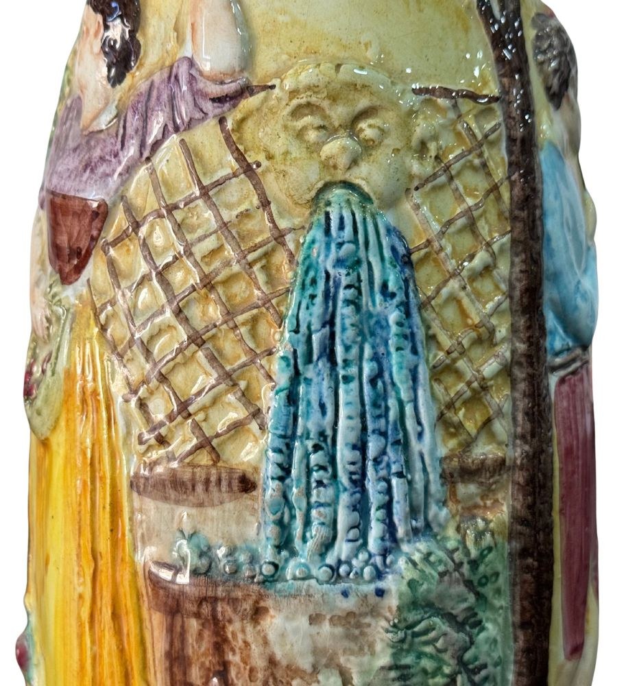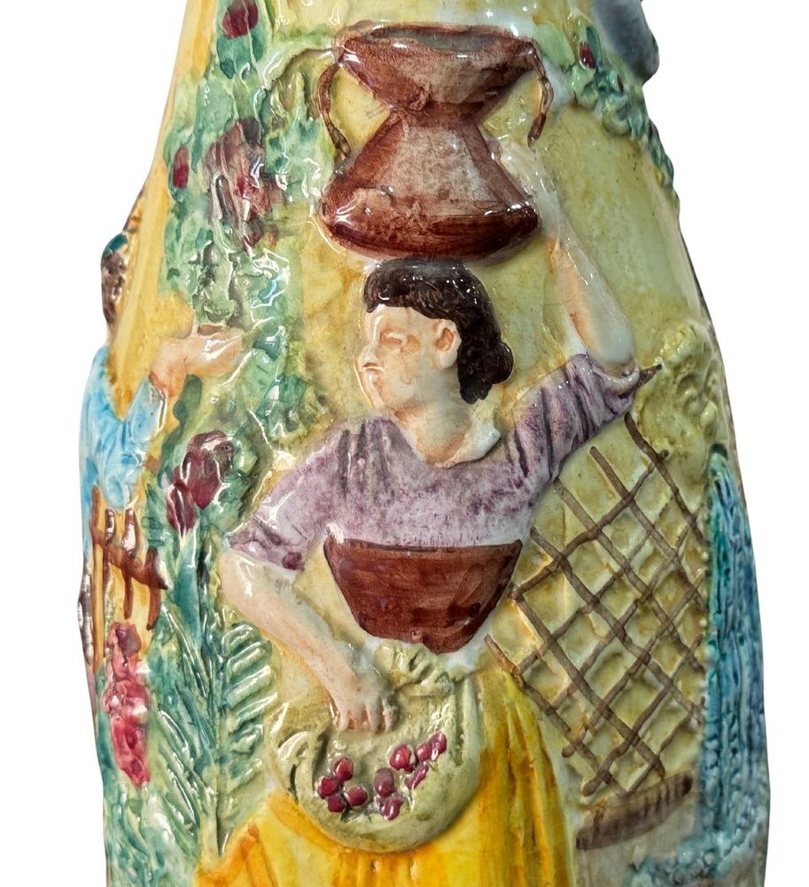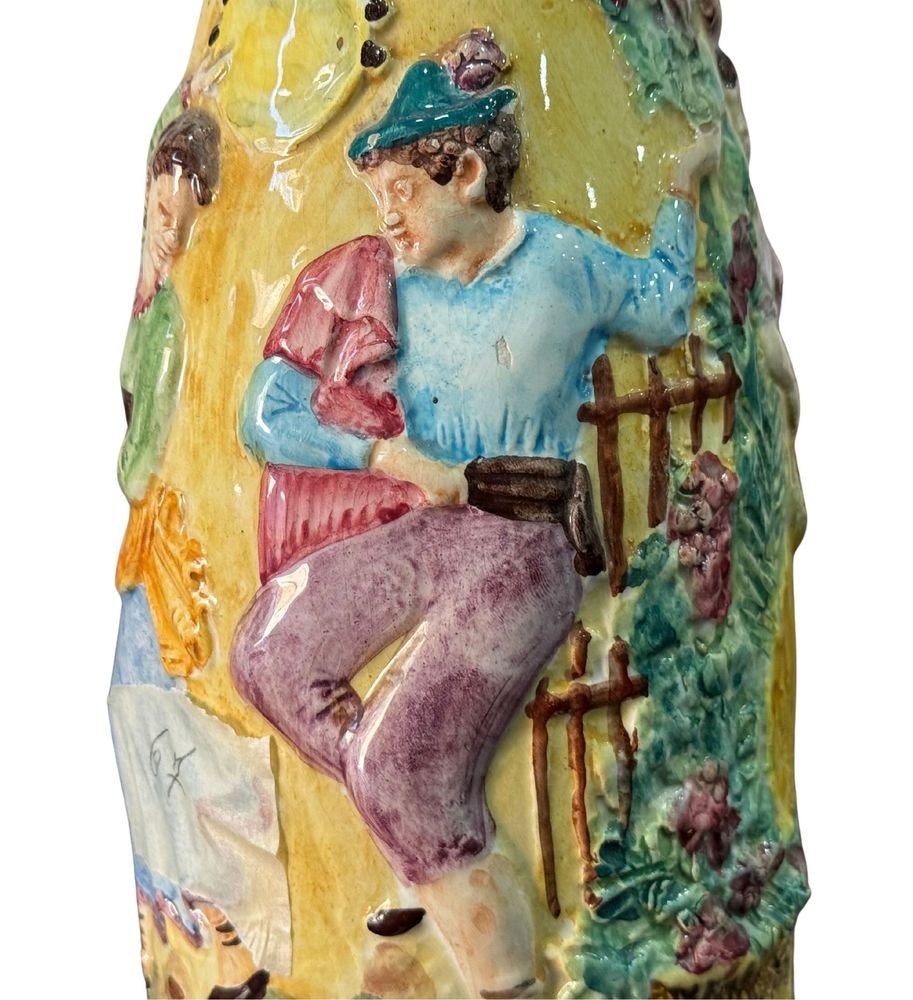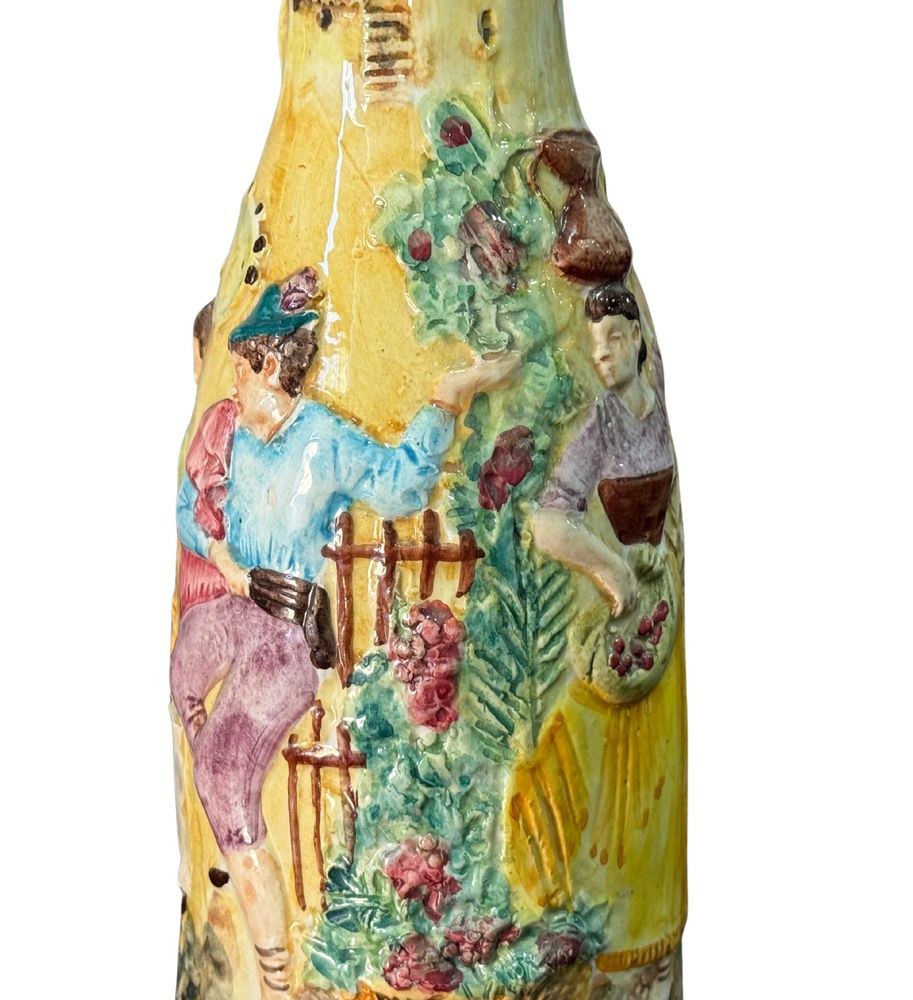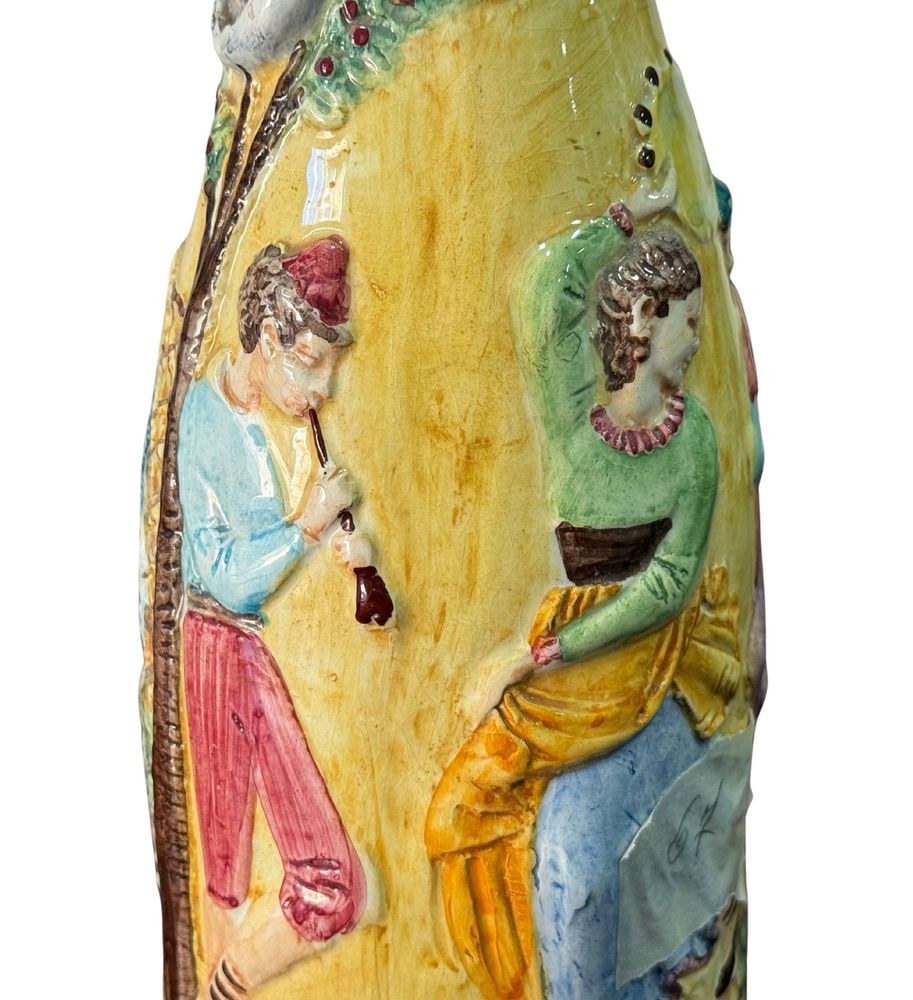 Glazed ceramic vase, 20th century, depicting figures. Inscribed at the top: *Lo Scoglio di Frisio*. Dimensions: 33 x 12 x 12 cm. The piece is in good condition.