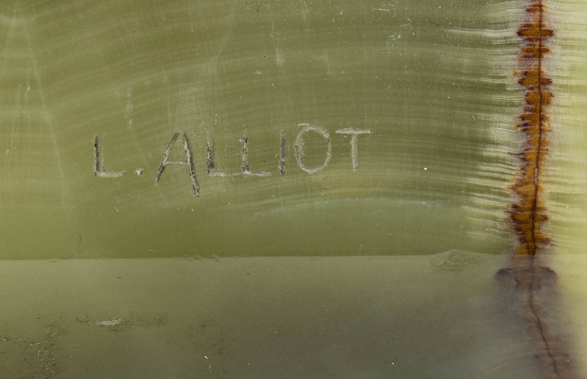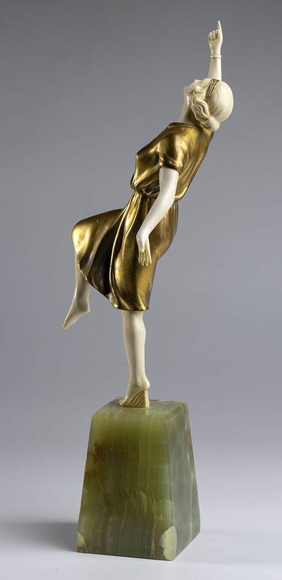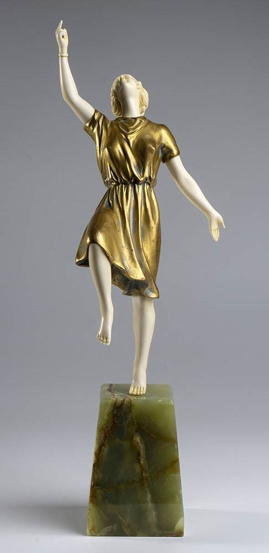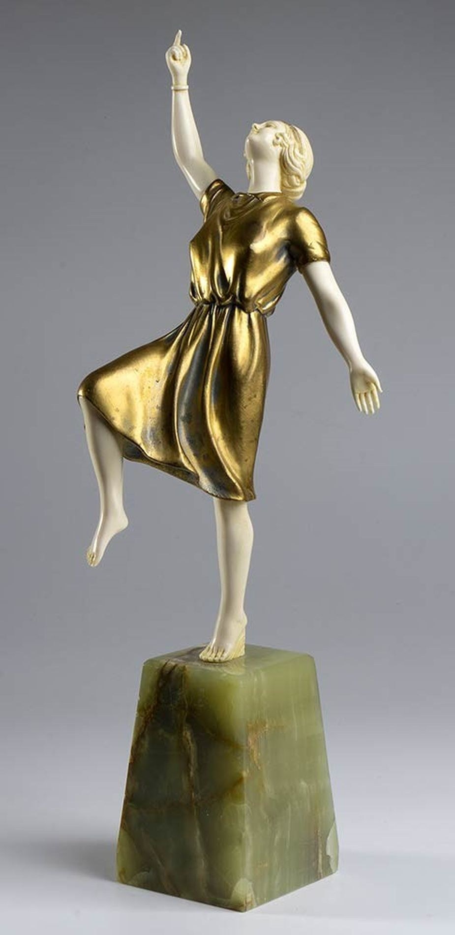 Art Deco chryselephantine bronze and ivory sculpture depicting a dancer the head, arms and legs made of elephant ivory (Loxodonta africana Blumenbach, 1797 or Elephas maximus Linnaeus, 1758), resting on a truncated onyx base bearing the signature "A. Alliot".