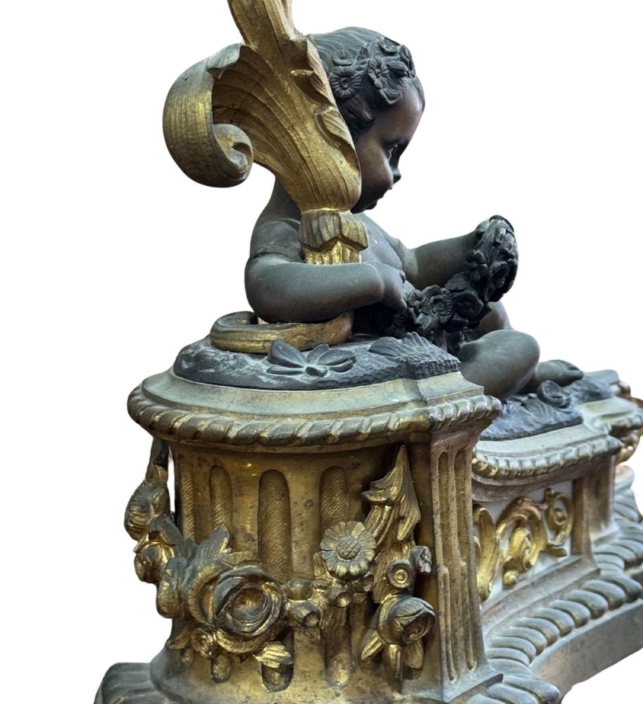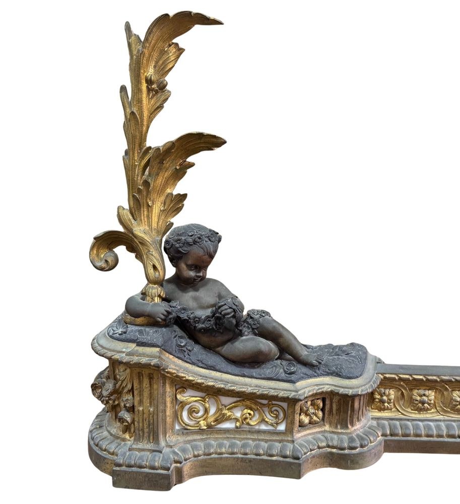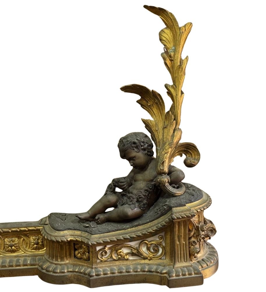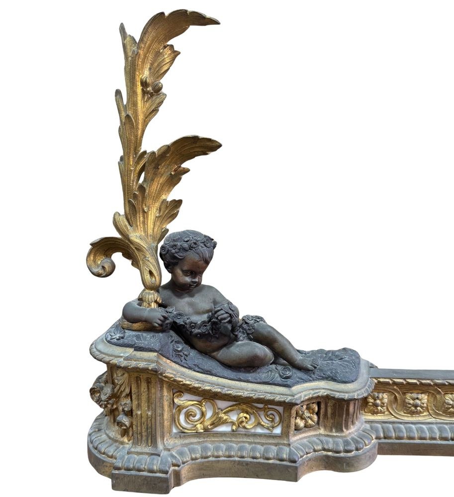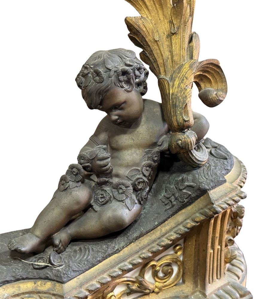 Gilded bronze fireplace andiron, 19th century period, featuring two gilded bronze putti on the sides. Dimensions: 116x40 cm. In good condition.