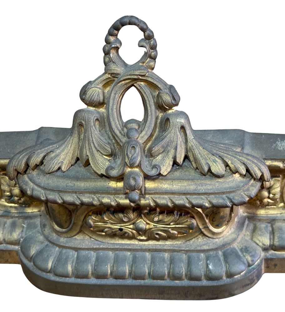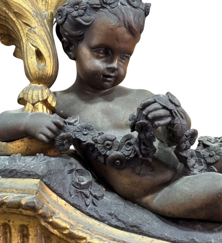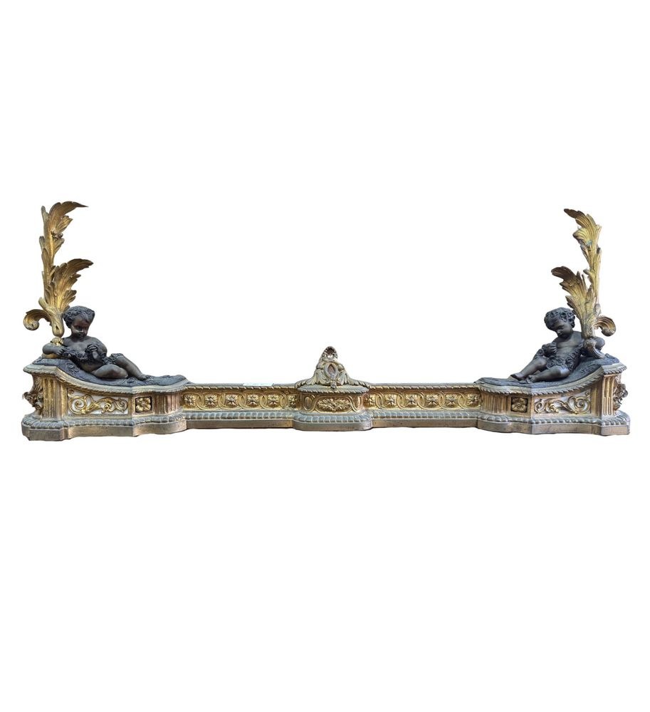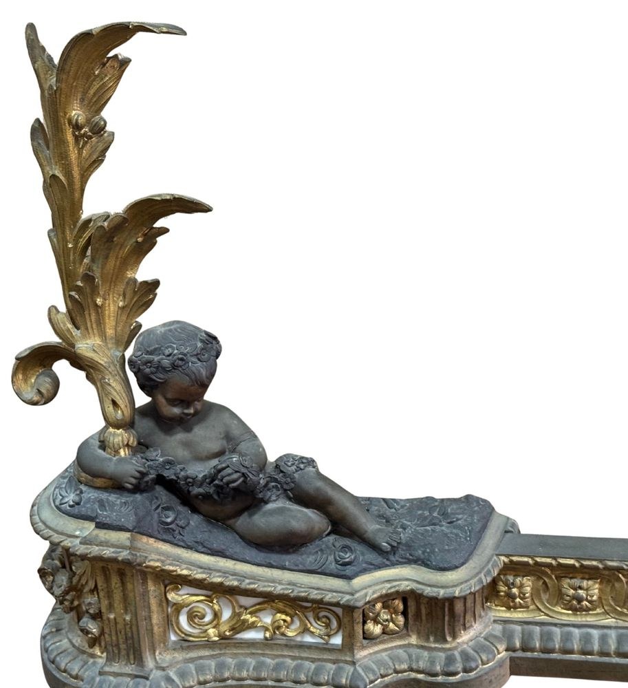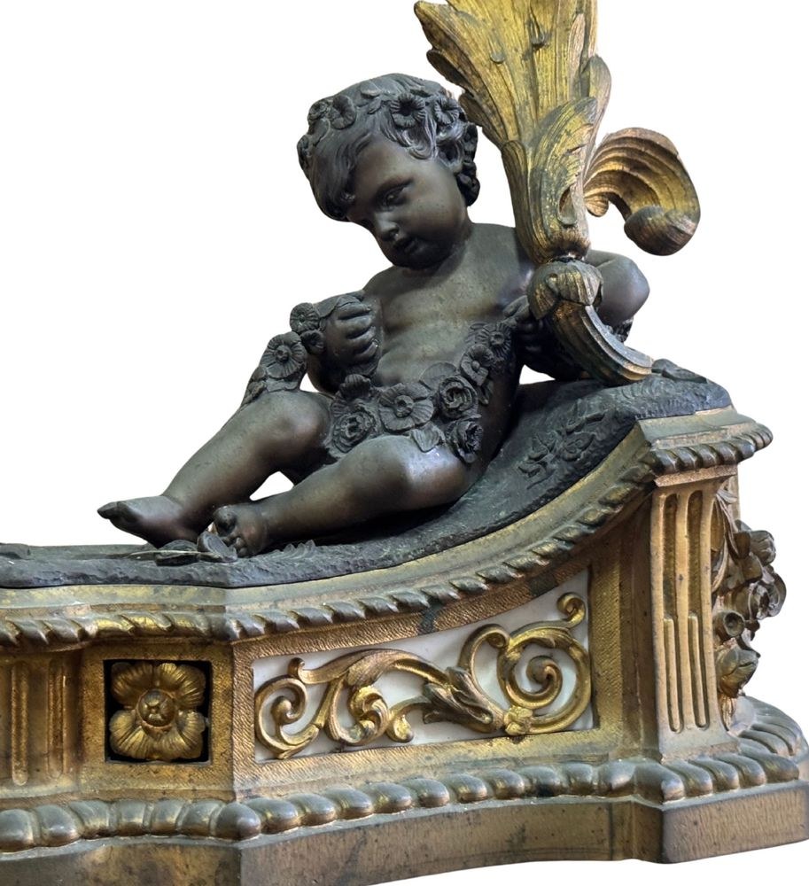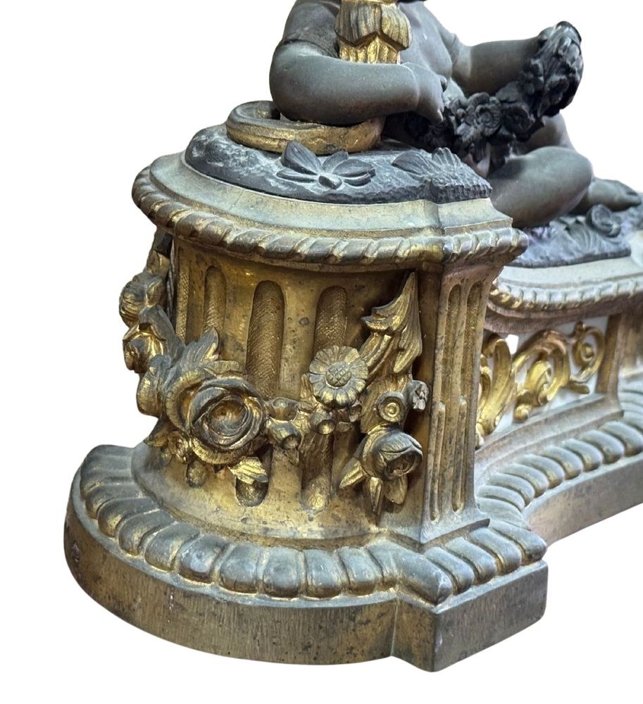 Gilded bronze fireplace andiron, 19th century period, featuring two gilded bronze putti on the sides. Dimensions: 116x40 cm. In good condition.